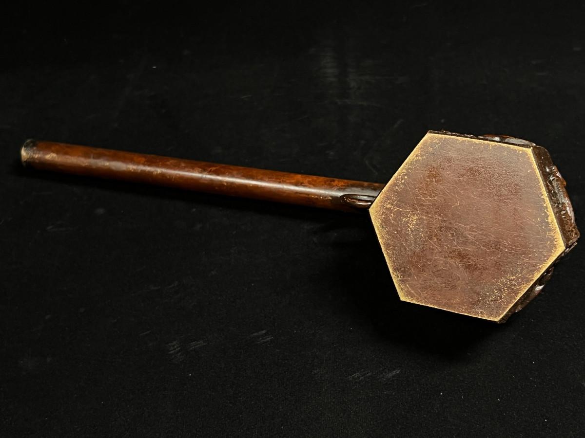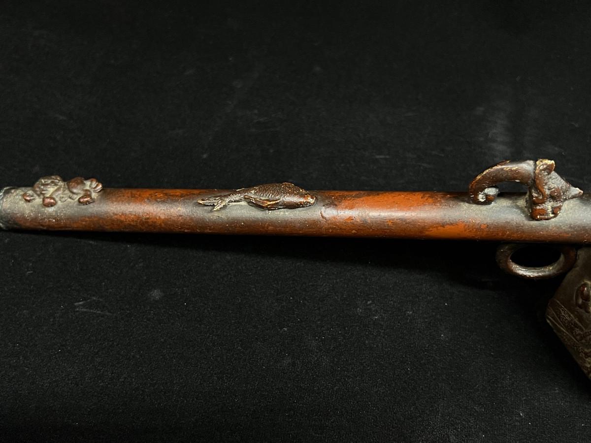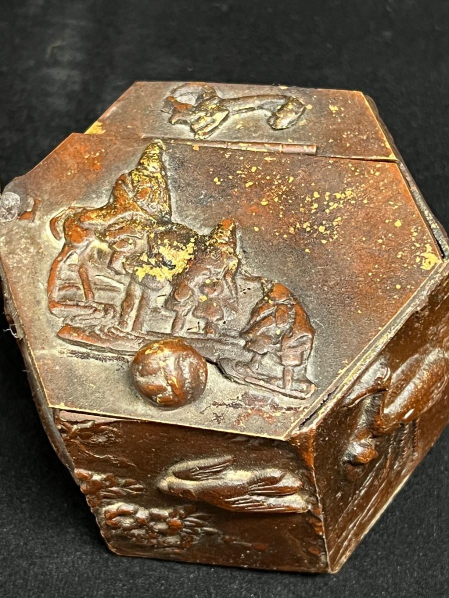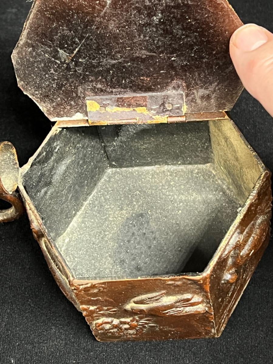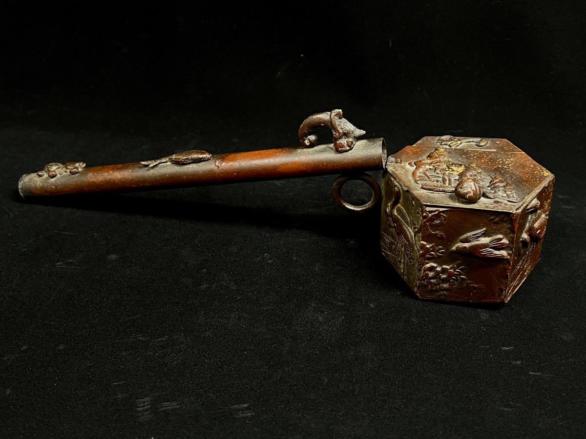 Antique bronze Chinese brushpot, lidded reservoir with traditional details - birds, cranes and nature cast into the design. This is a cool piece.