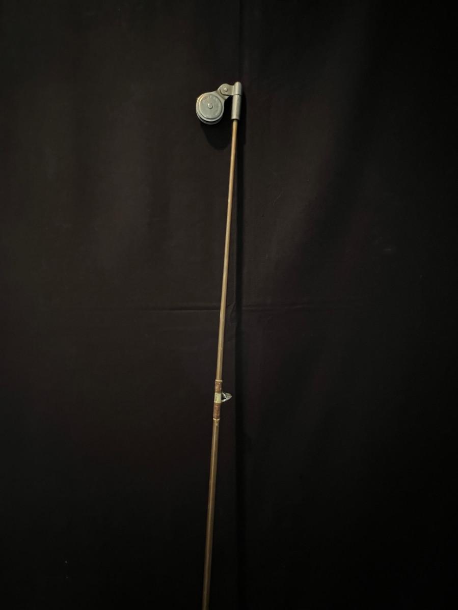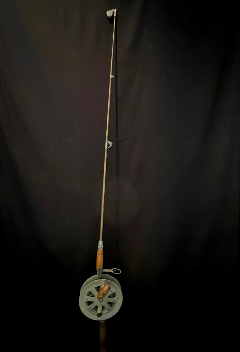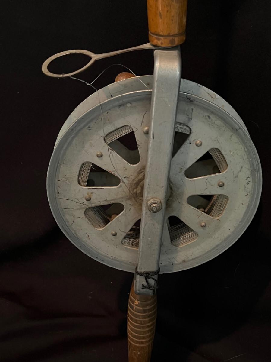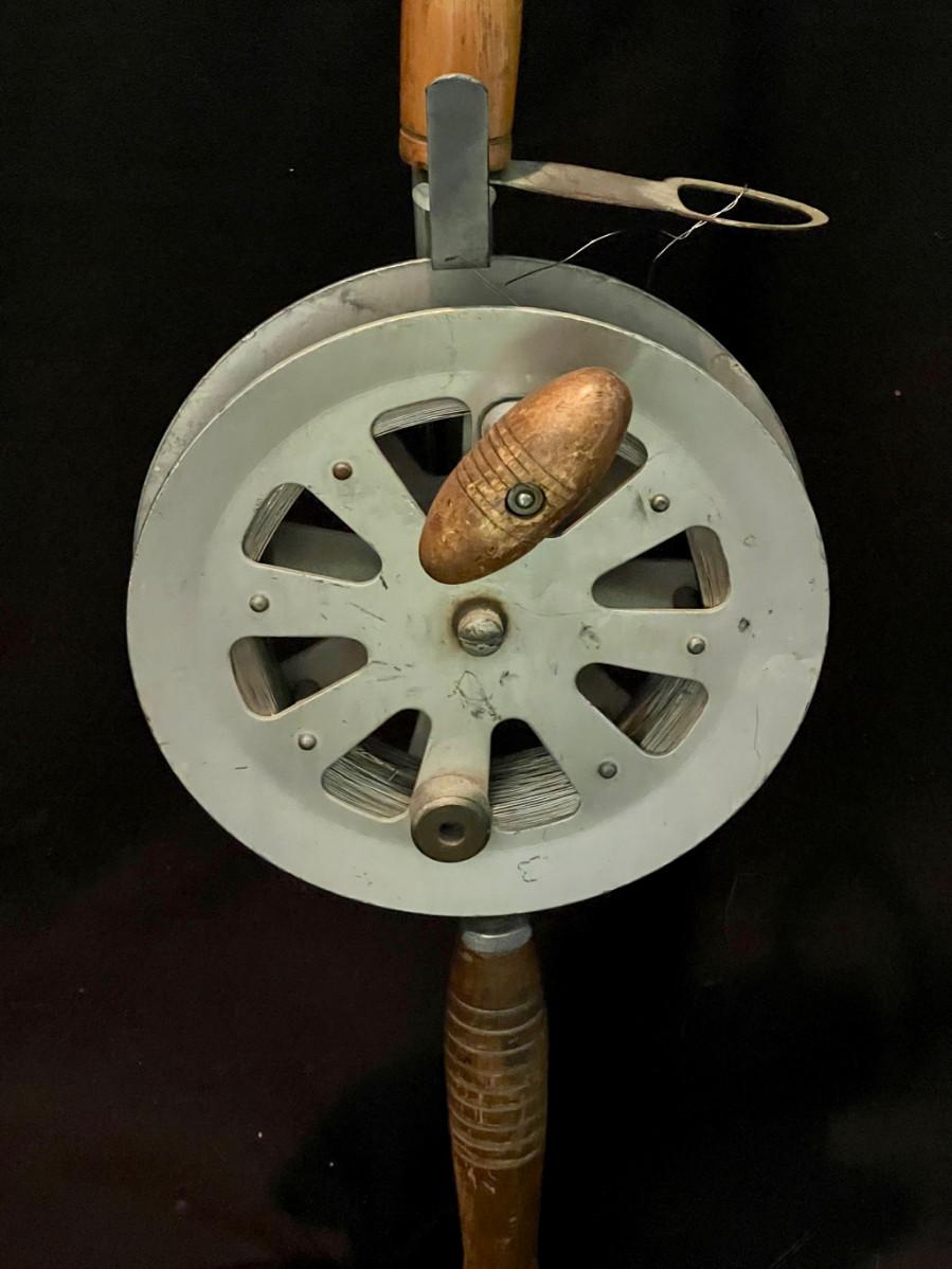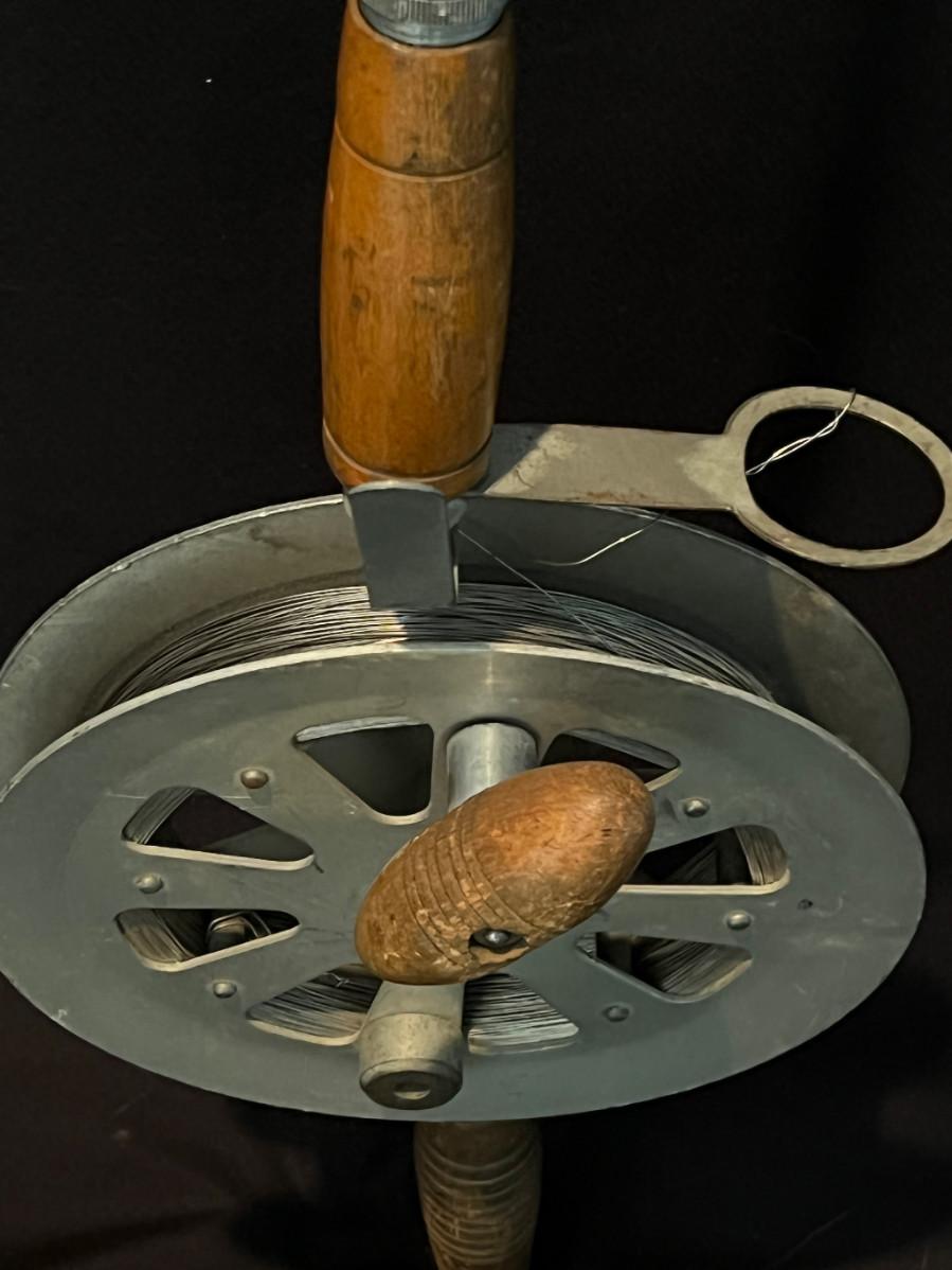 Twisted steel cable, turned wood handle, flex steel rod, open-faced reel.