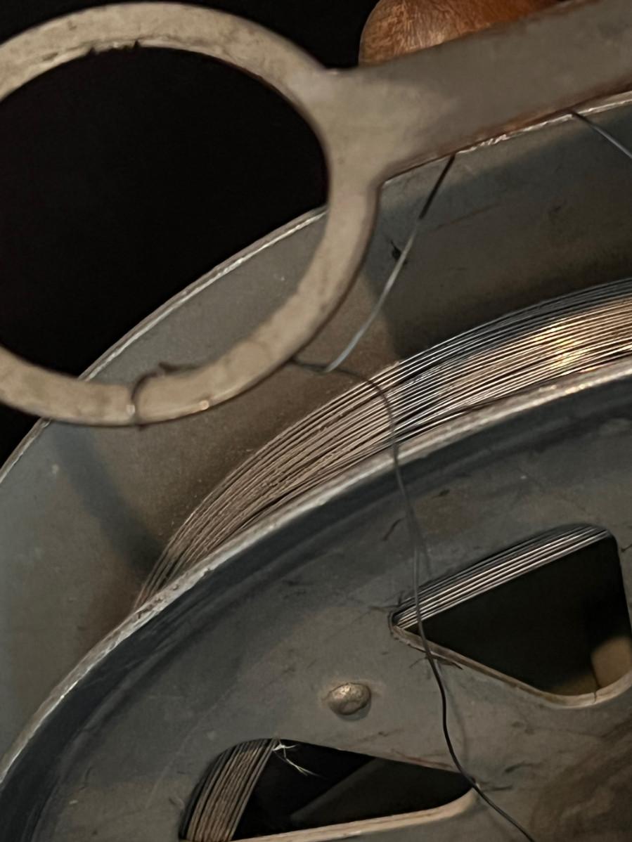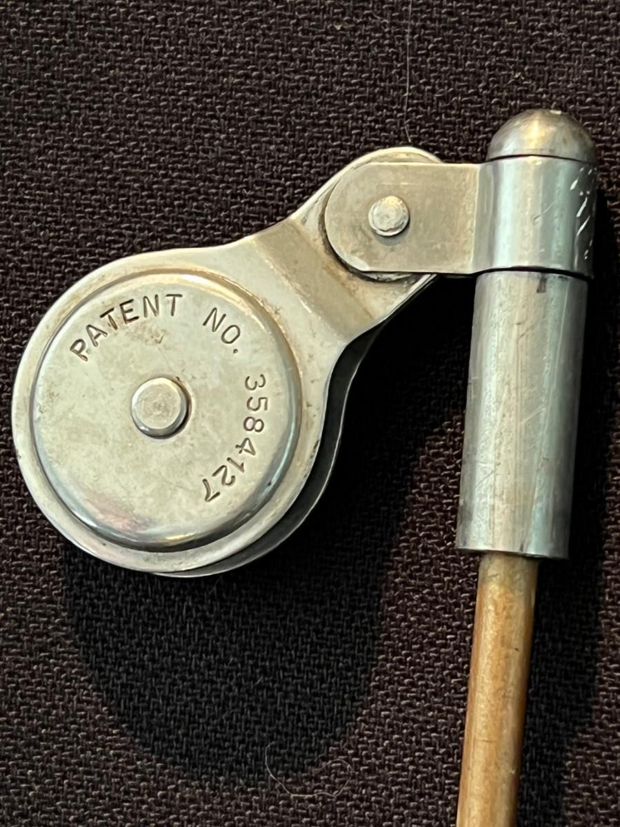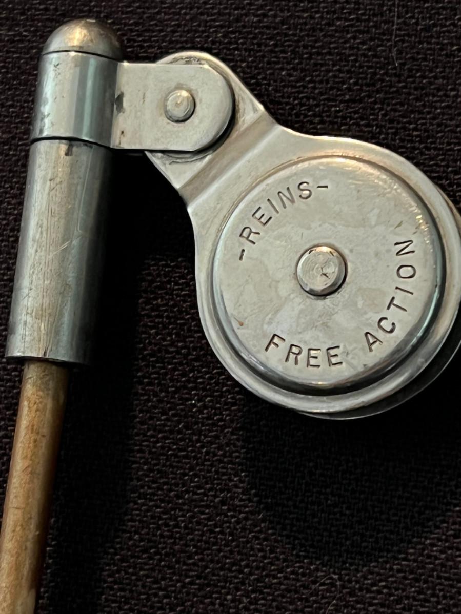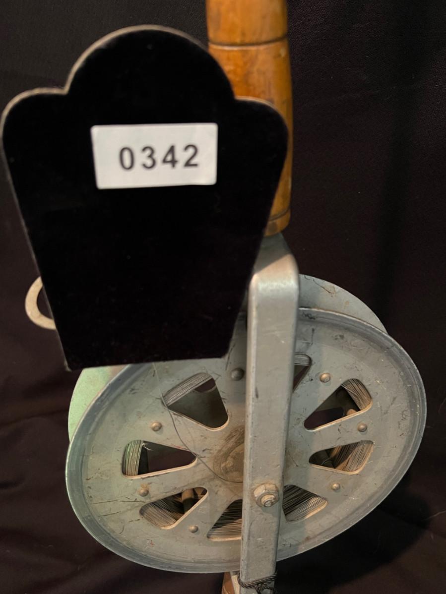 Twisted steel cable, turned wood handle, flex steel rod, open-faced reel.