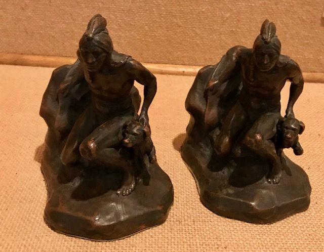 J.B. Jennings Bronze Bookends Native American Man and Dog