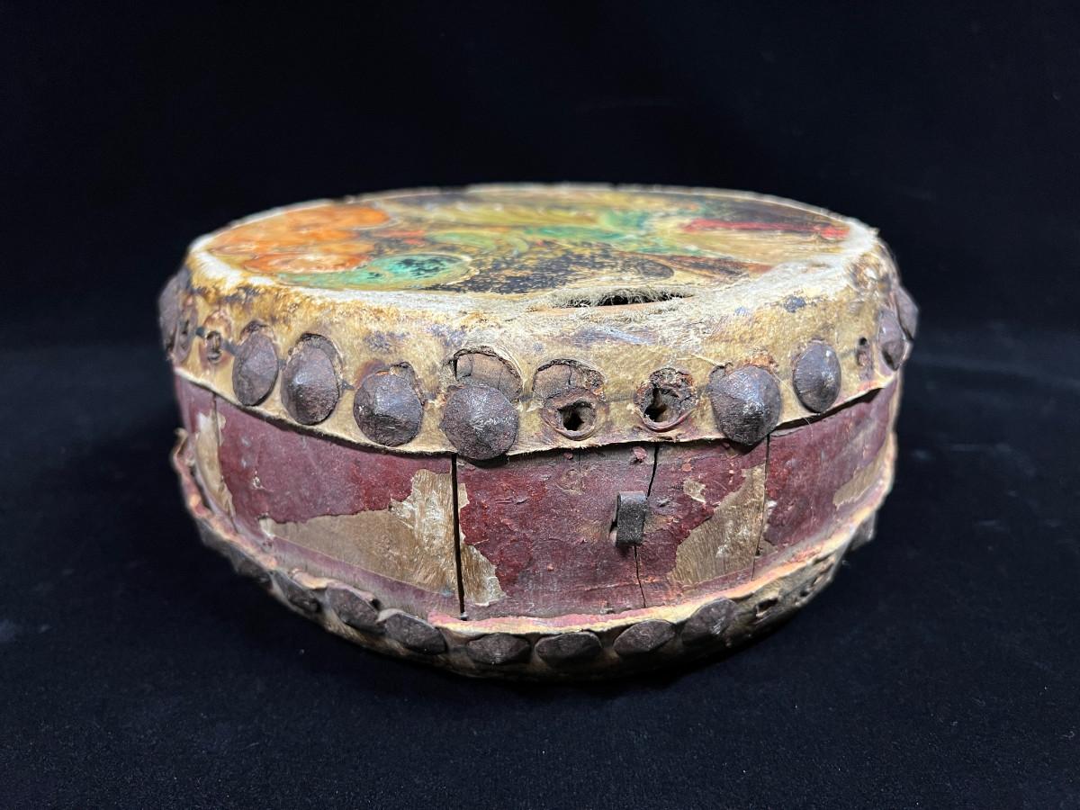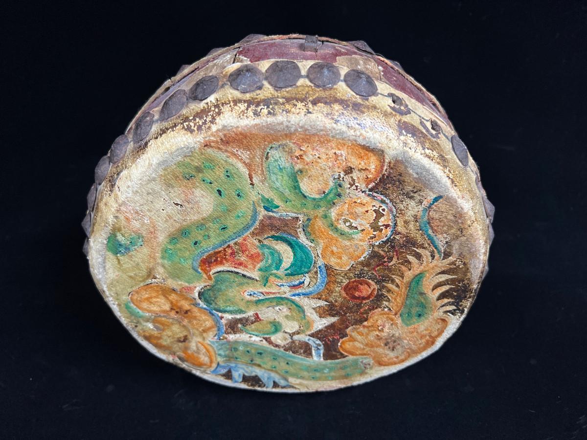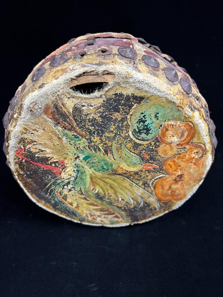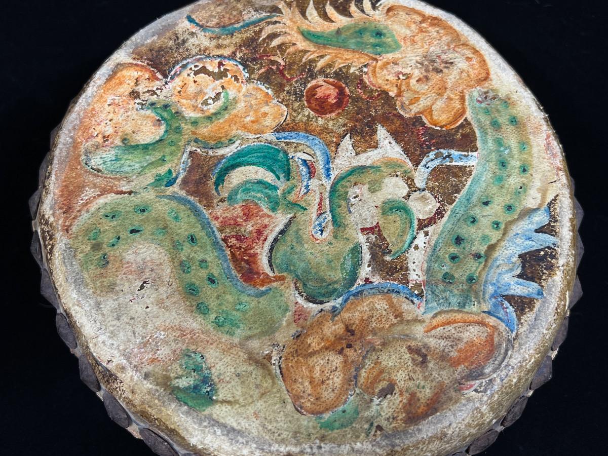 Antique Indochina painted leather festival drum w brass tacks