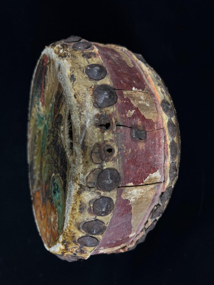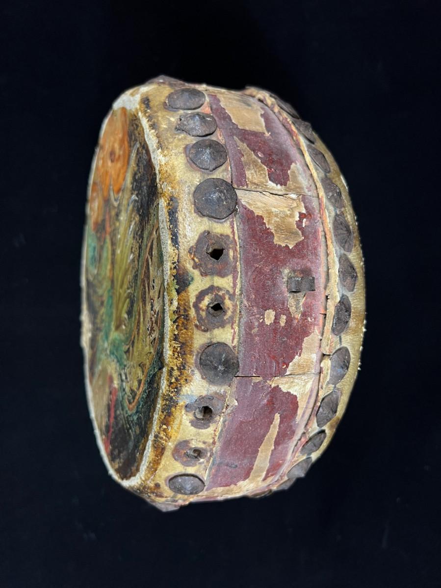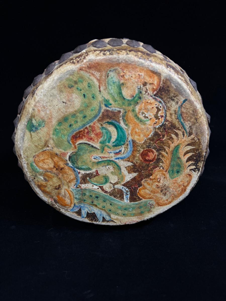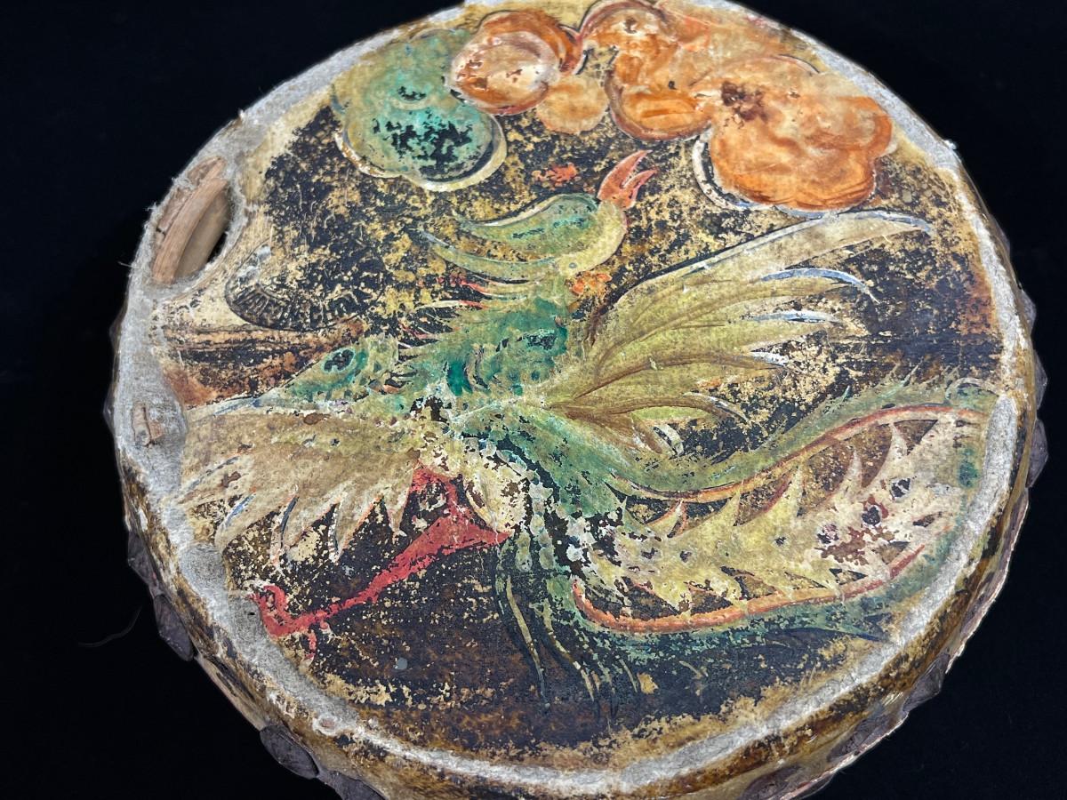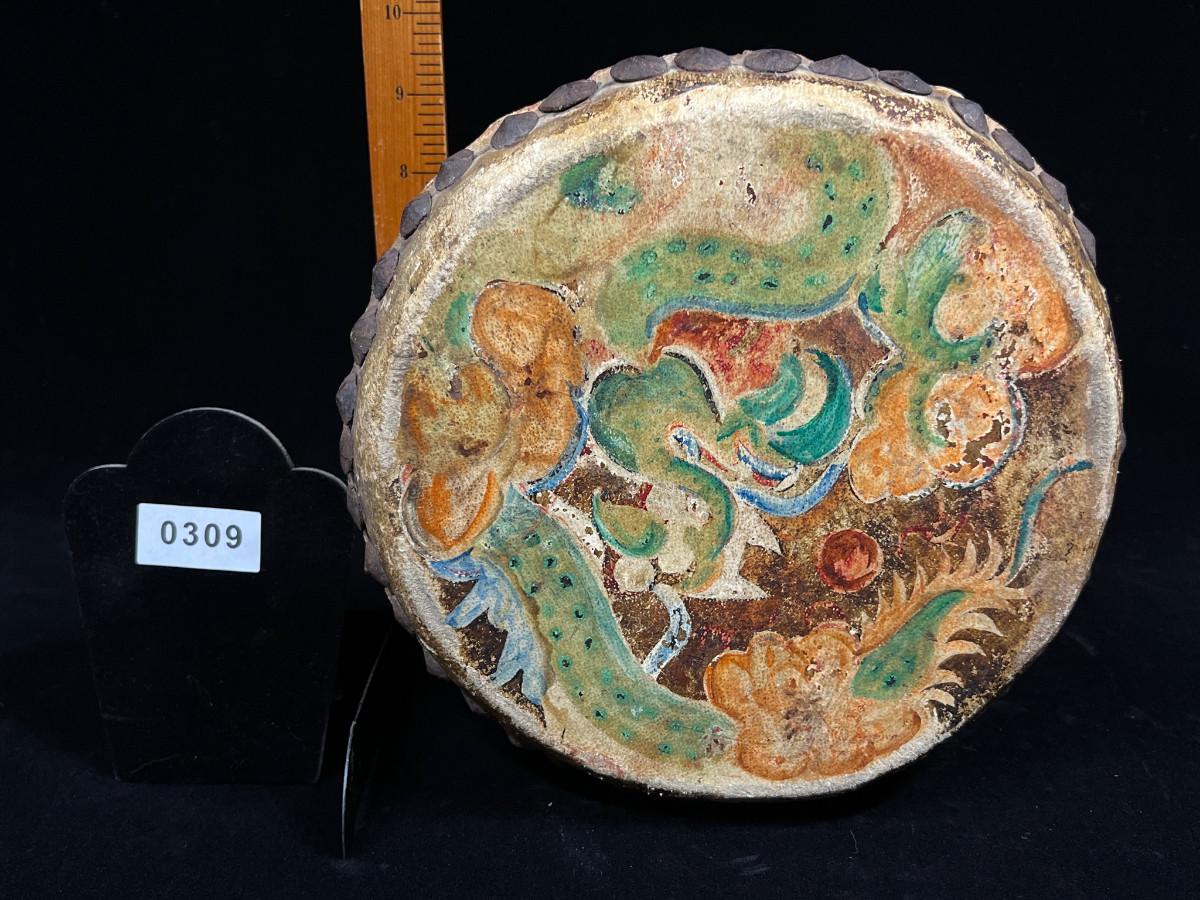 Antique Indochina painted leather festival drum w brass tacks