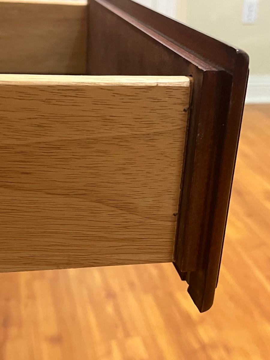 Top has a custom glass ~ 30” H x 58” W x 28” D ~ normal wear & tear ~ felt lined drawers ~ drawers slide easily