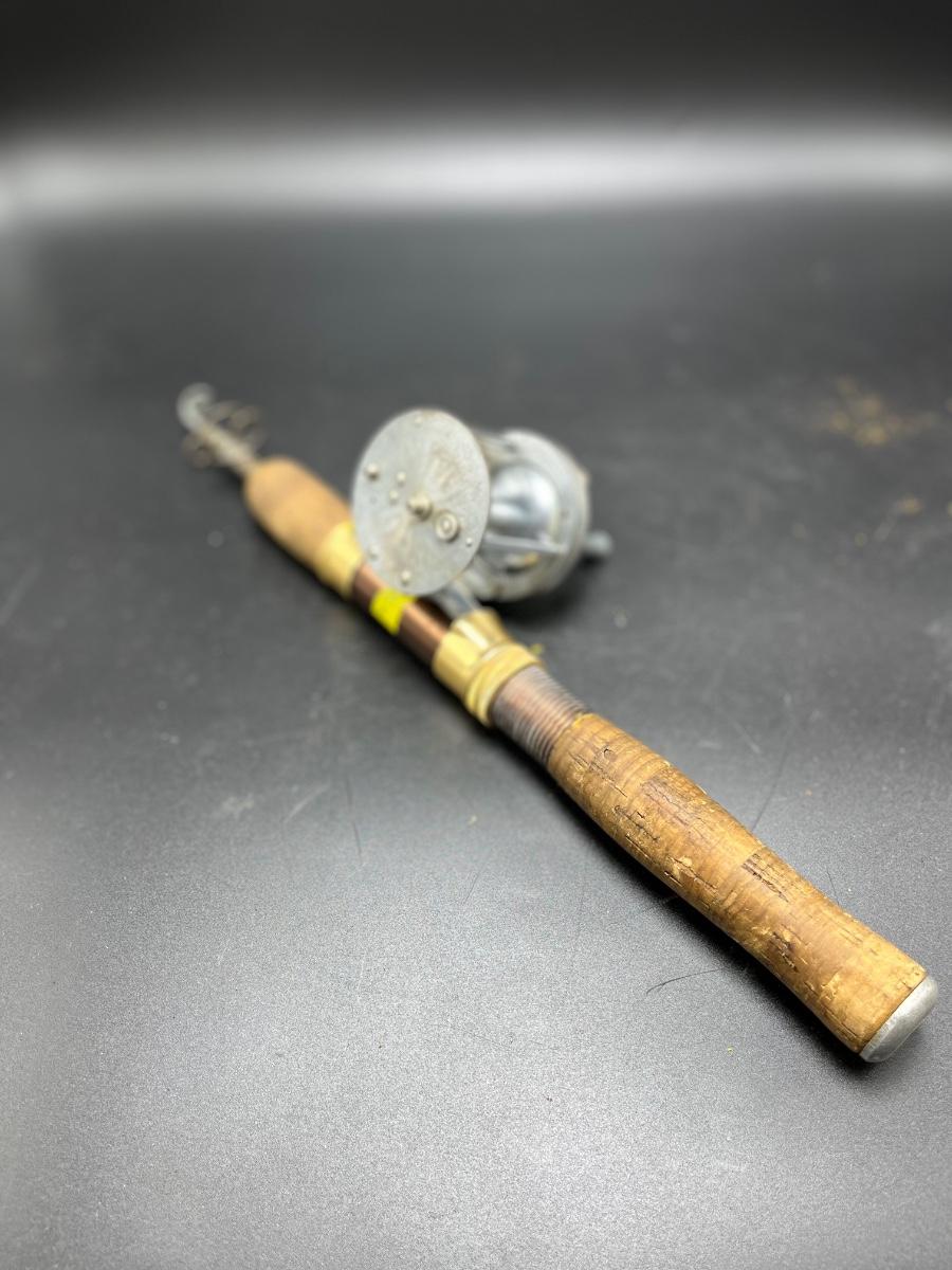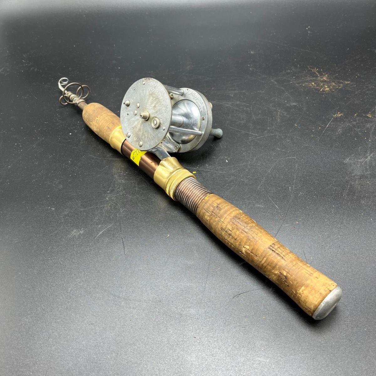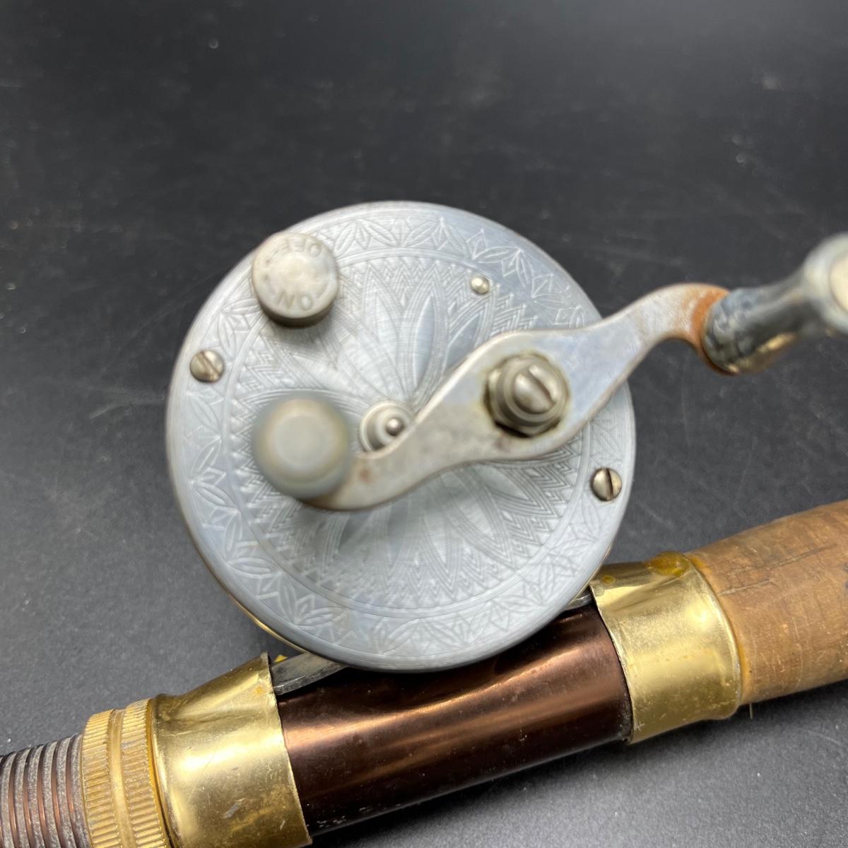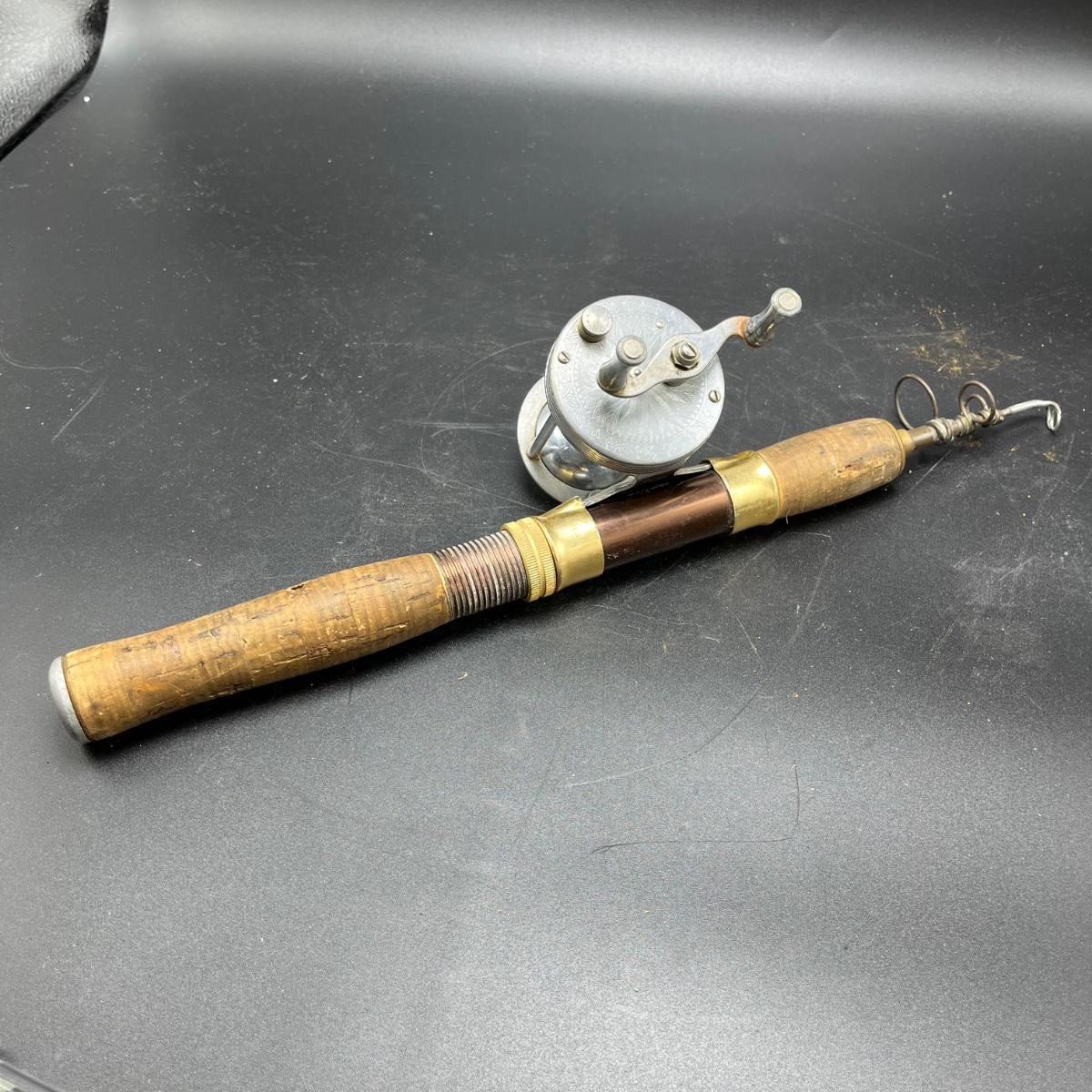 Lot includes a J.C. Higgins reel model # 489 with etched sides. Also includes a telescopic copper rod that measures 57” long