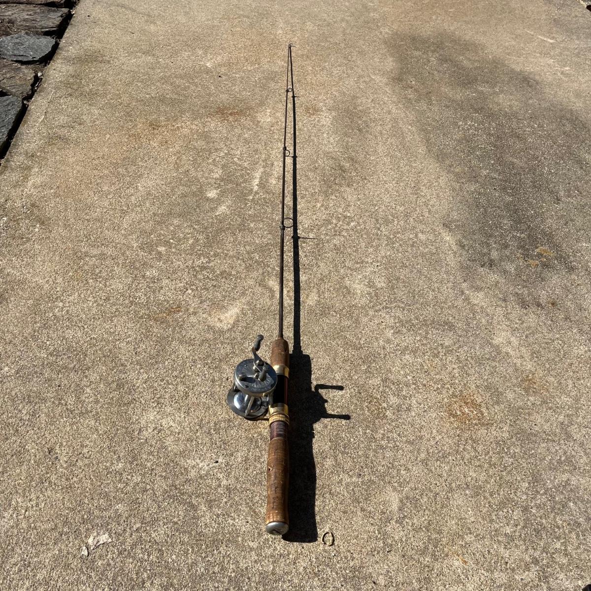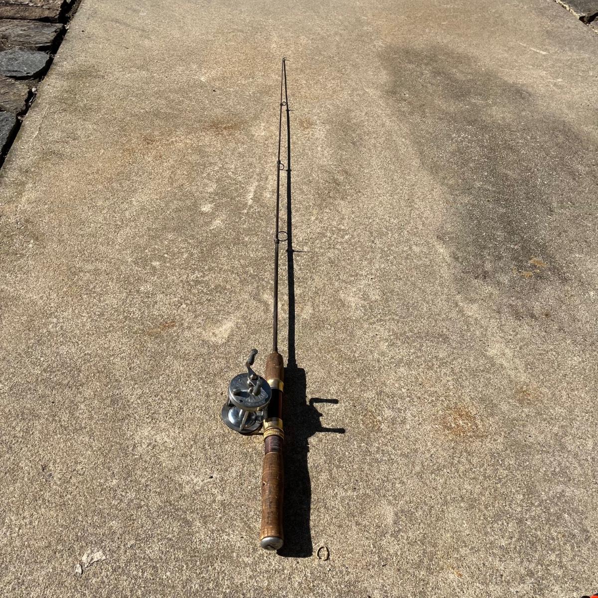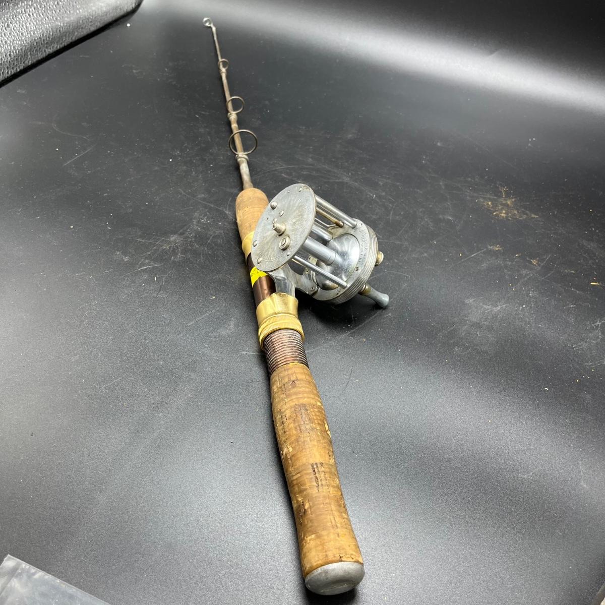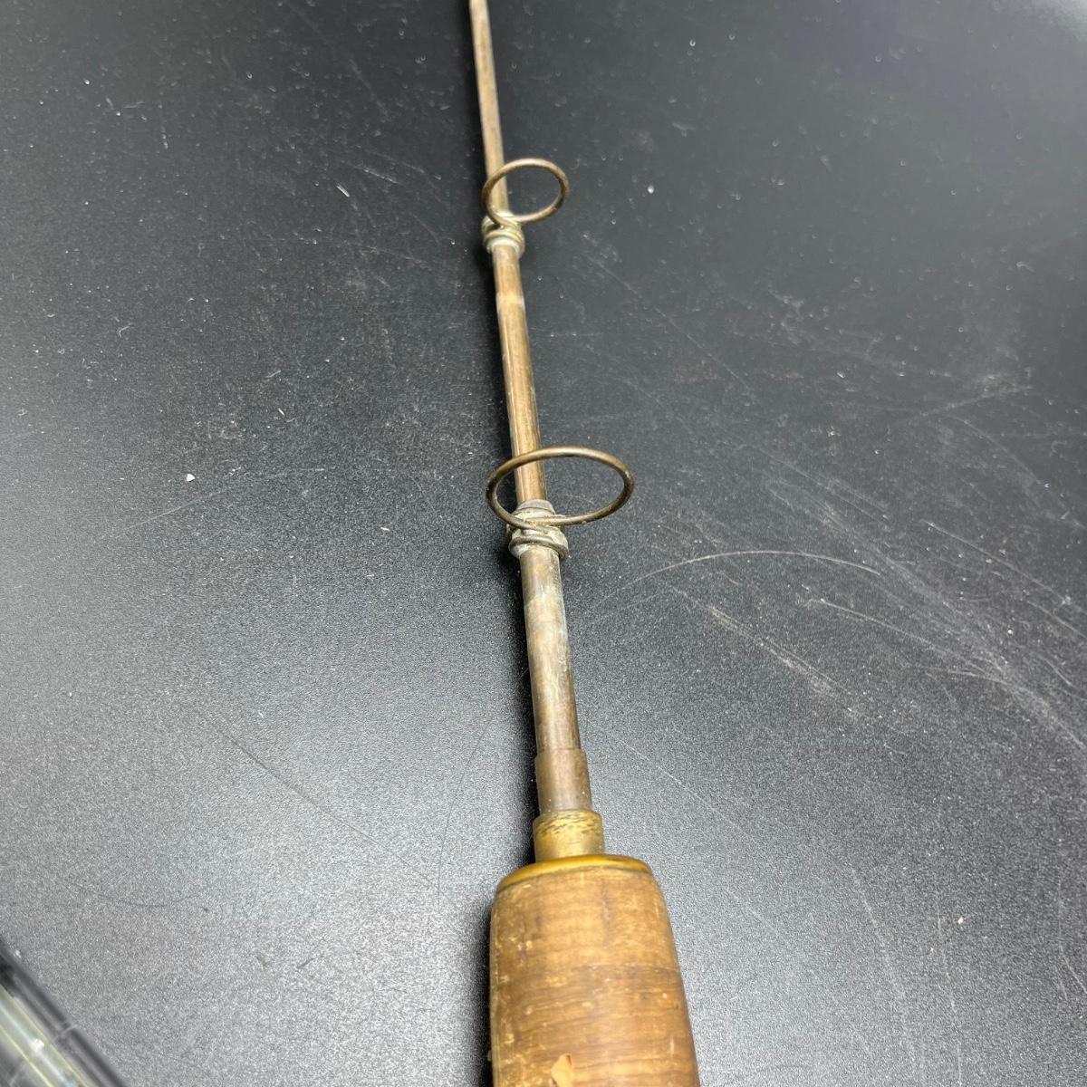Lot includes a J.C. Higgins reel model # 489 with etched sides. Also includes a telescopic copper rod that measures 57” long