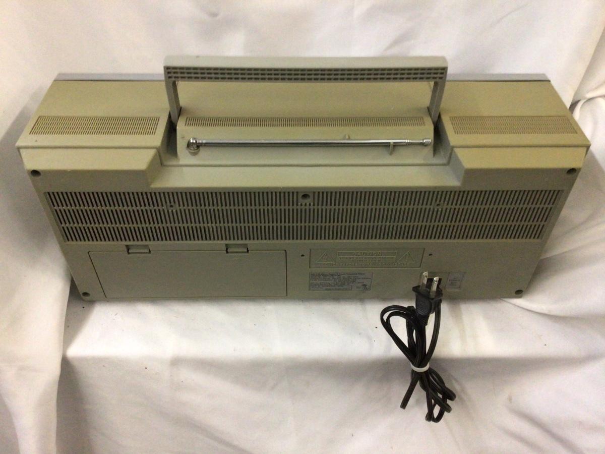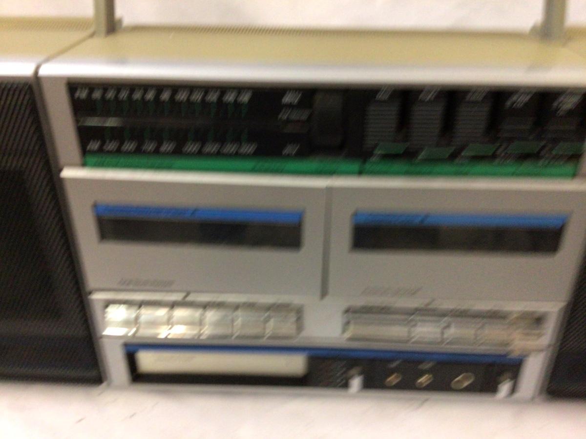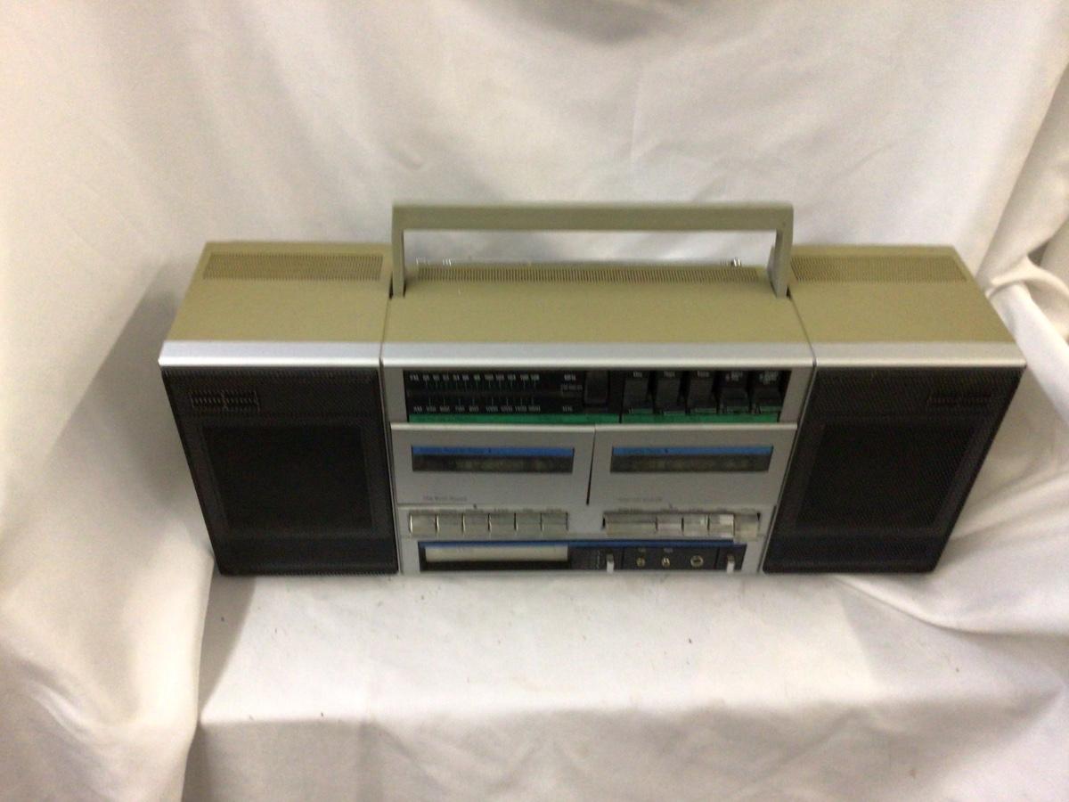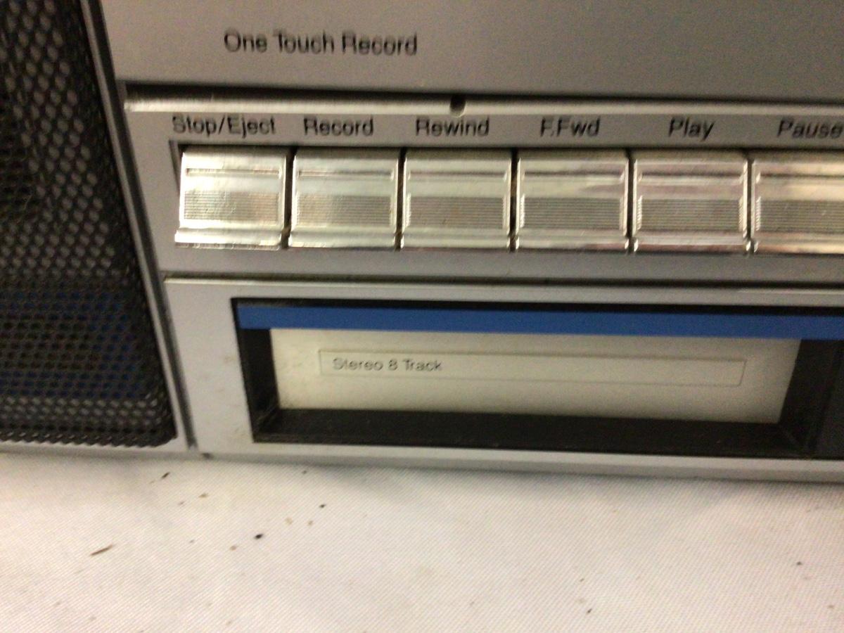 This is an awesome AM FM Radio with Dual Cassette players and an 8 Track player boom box. Very rare to have a boom box with 8 Track player. It has the cord and also has battery compartment to take it on the go. Awesome item.