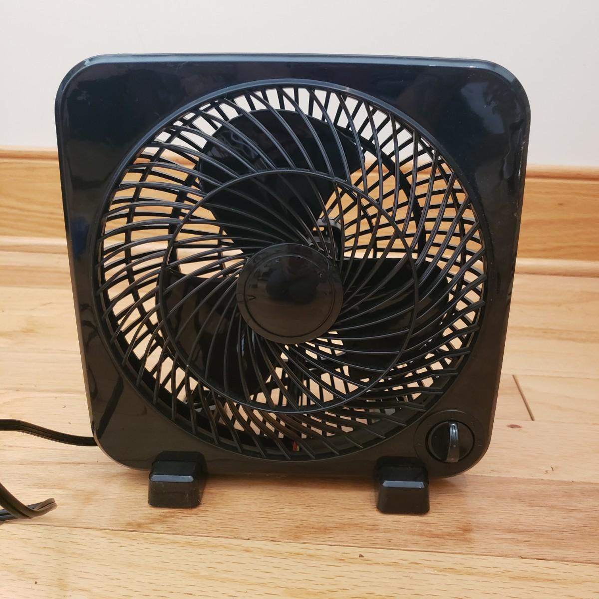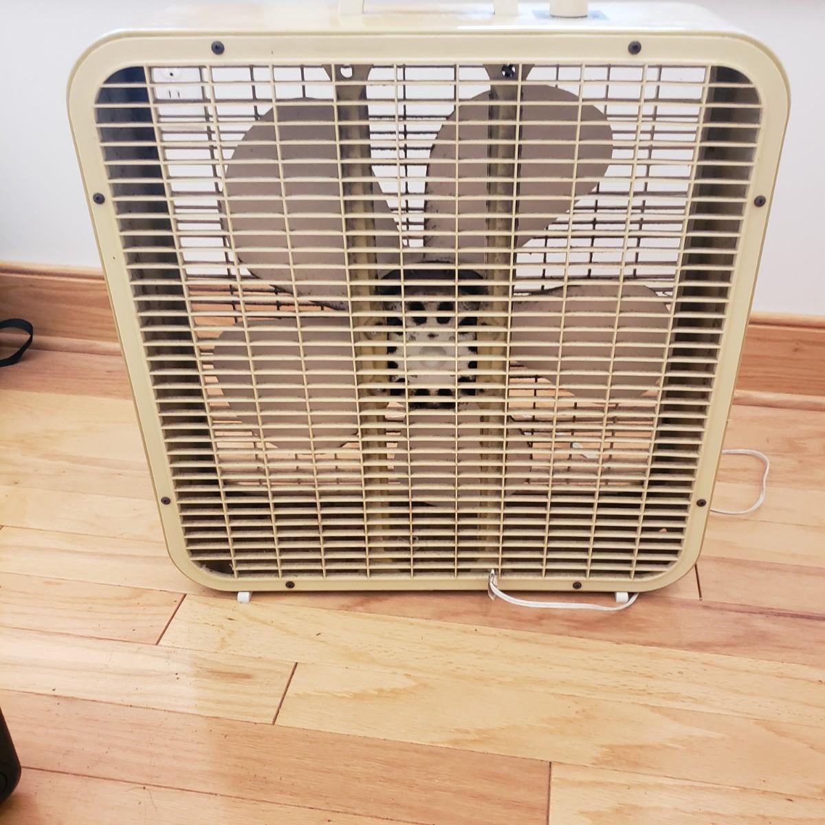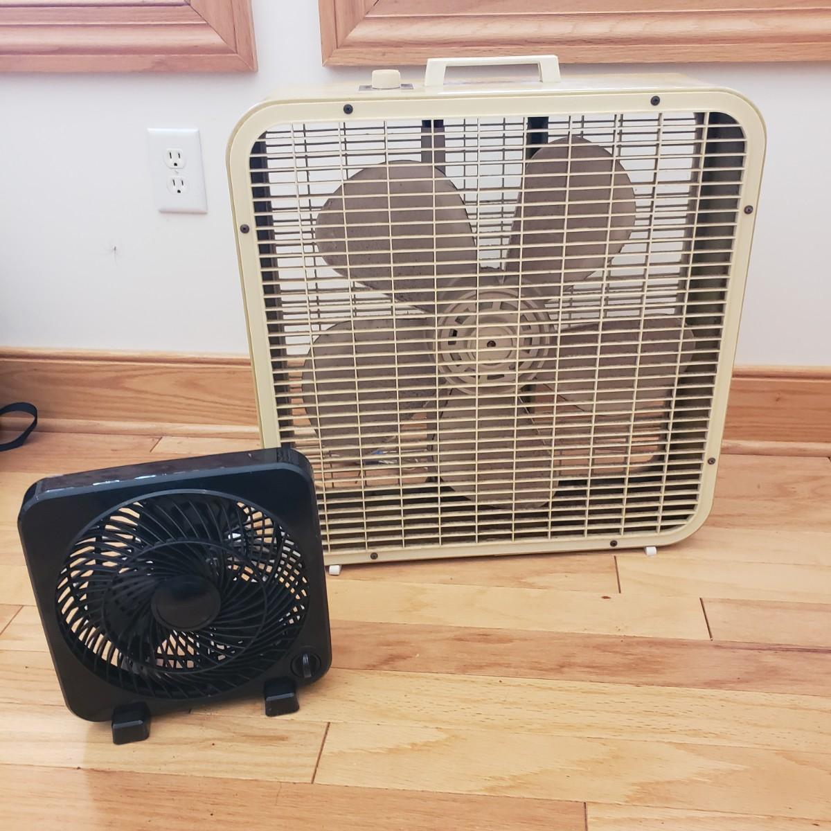 This lot contains two fans for those hot days. The JC Penny box fan is heavy duty. The sides are made of metal. They don't make them like this anymore! The box fan measures 6" x 22" x 22"H. The black fan is a 9" personal fan. Both fans powered on when plugged in. The box fan has collected some dust and will need to be cleaned.