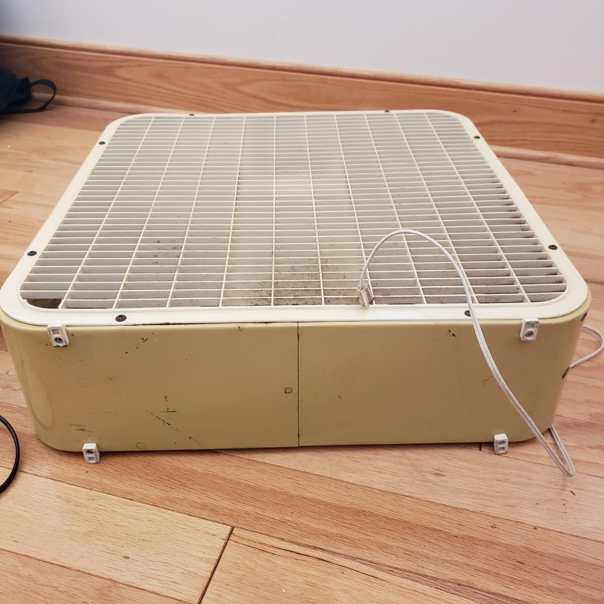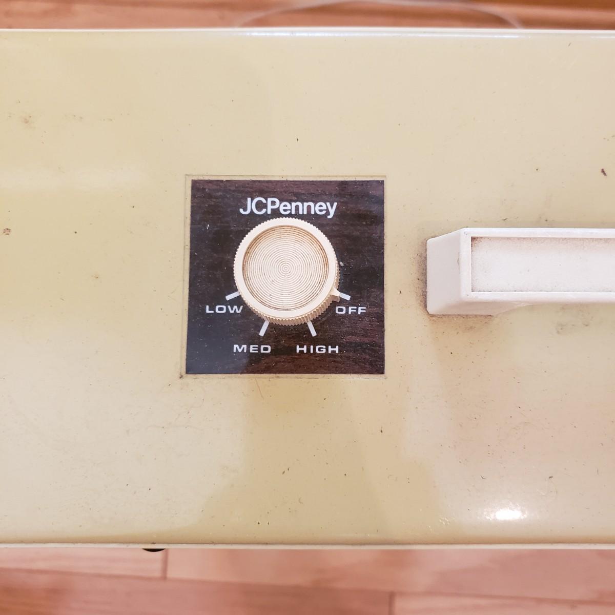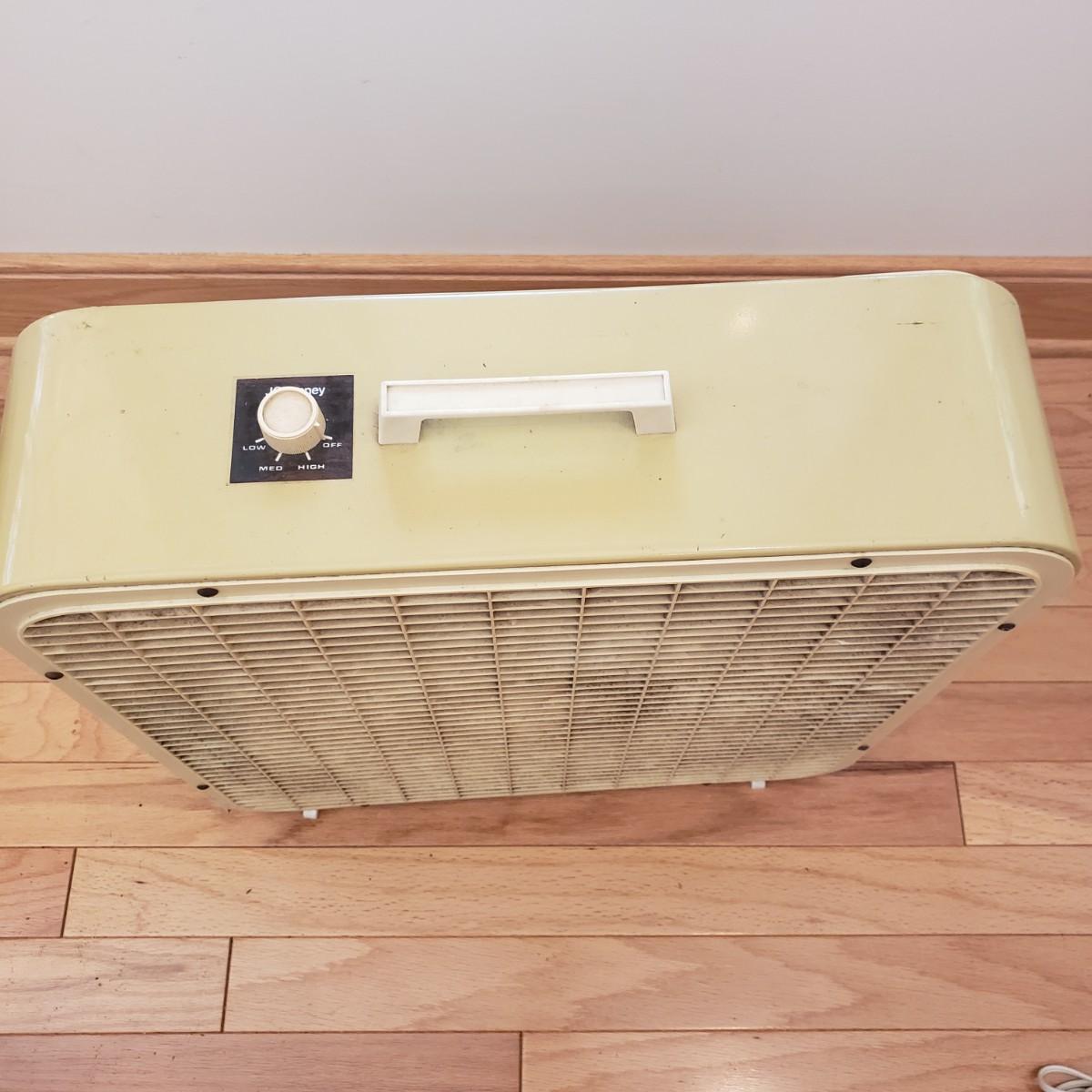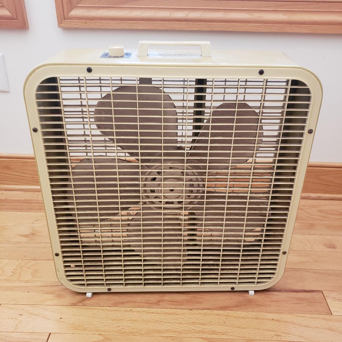 This lot contains two fans for those hot days. The JC Penny box fan is heavy duty. The sides are made of metal. They don't make them like this anymore! The box fan measures 6" x 22" x 22"H. The black fan is a 9" personal fan. Both fans powered on when plugged in. The box fan has collected some dust and will need to be cleaned.