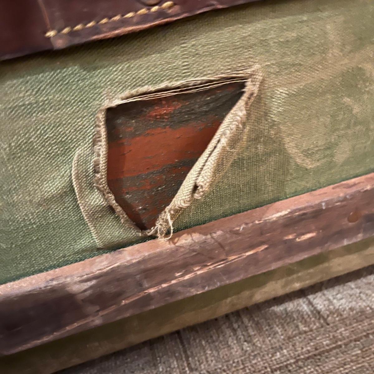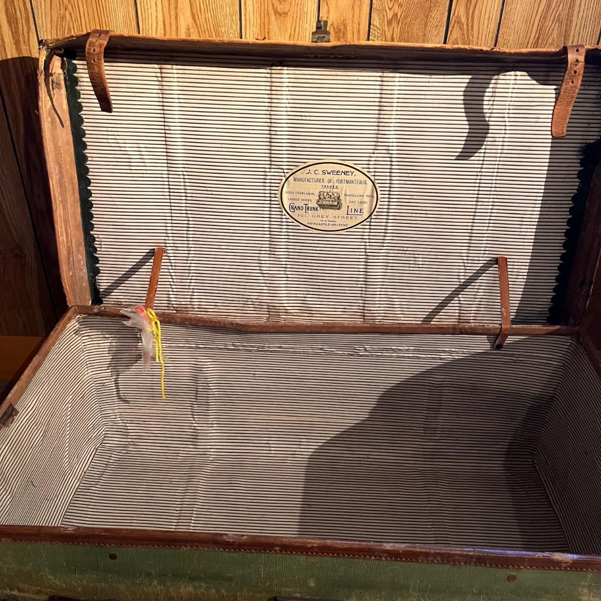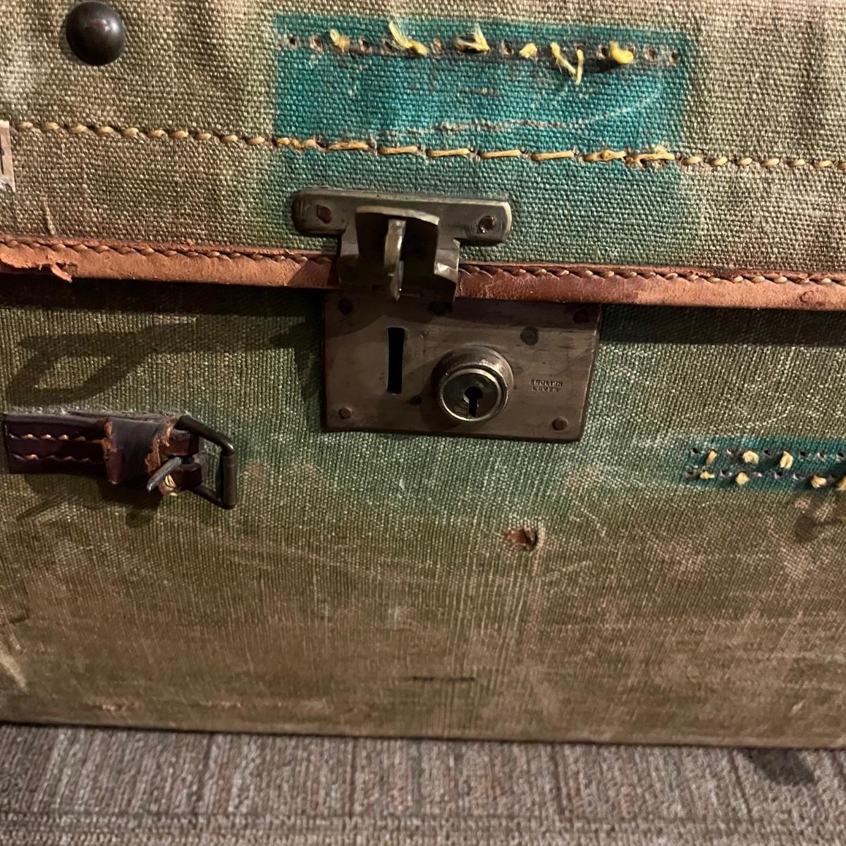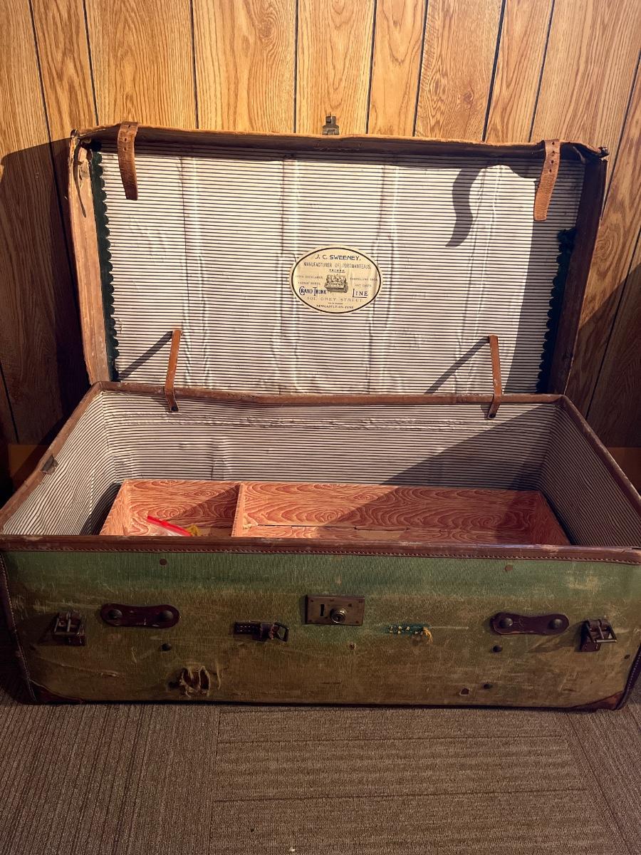 Lot includes a vintage J.C. Sweeney trunk that is covered with a faded green canvas. Trunk has key and includes a tray that appears to be from another trunk. Canvas is faded and has tear on bottom, see pictures. Trunk measures 23” x 42” x 16”.