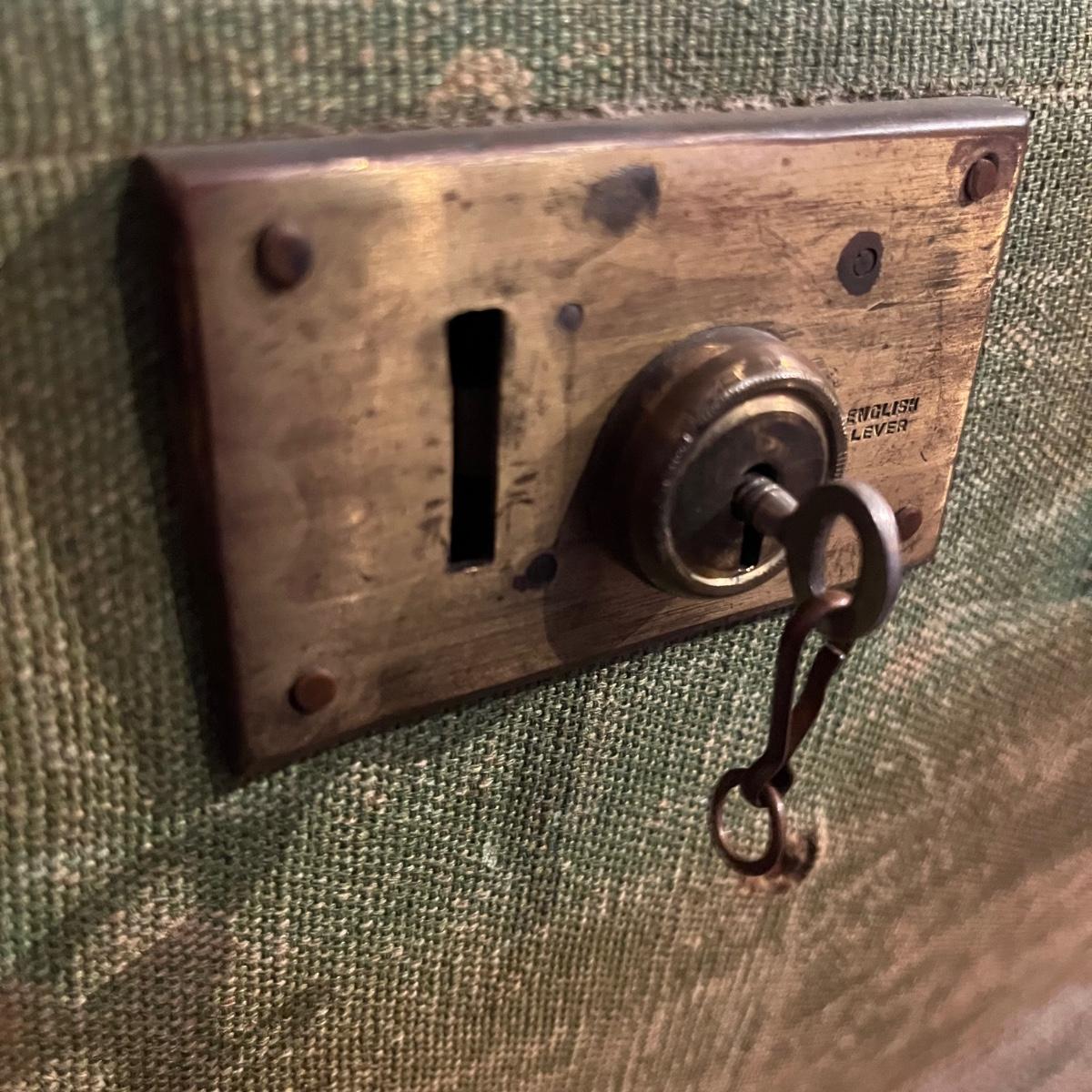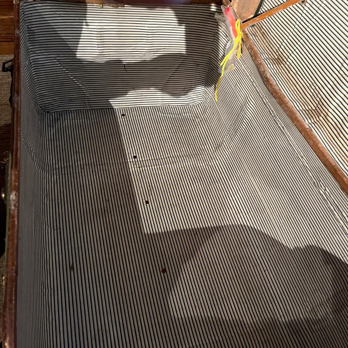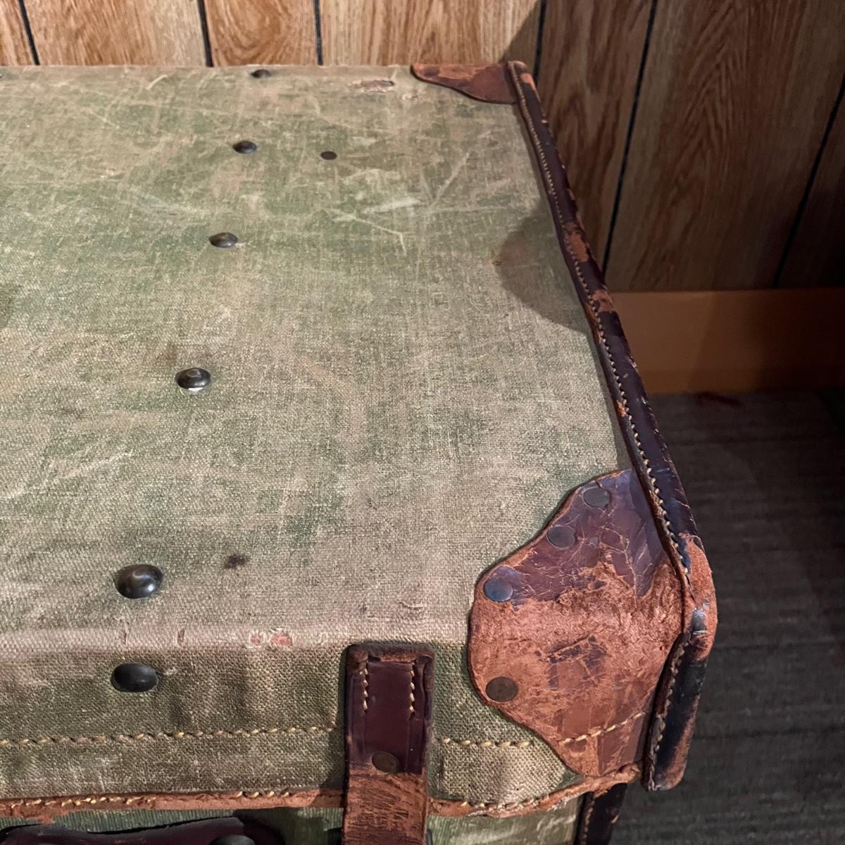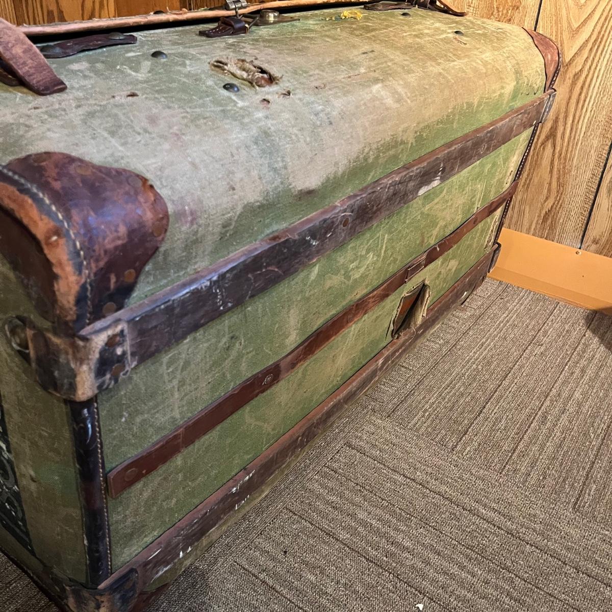 Lot includes a vintage J.C. Sweeney trunk that is covered with a faded green canvas. Trunk has key and includes a tray that appears to be from another trunk. Canvas is faded and has tear on bottom, see pictures. Trunk measures 23” x 42” x 16”.