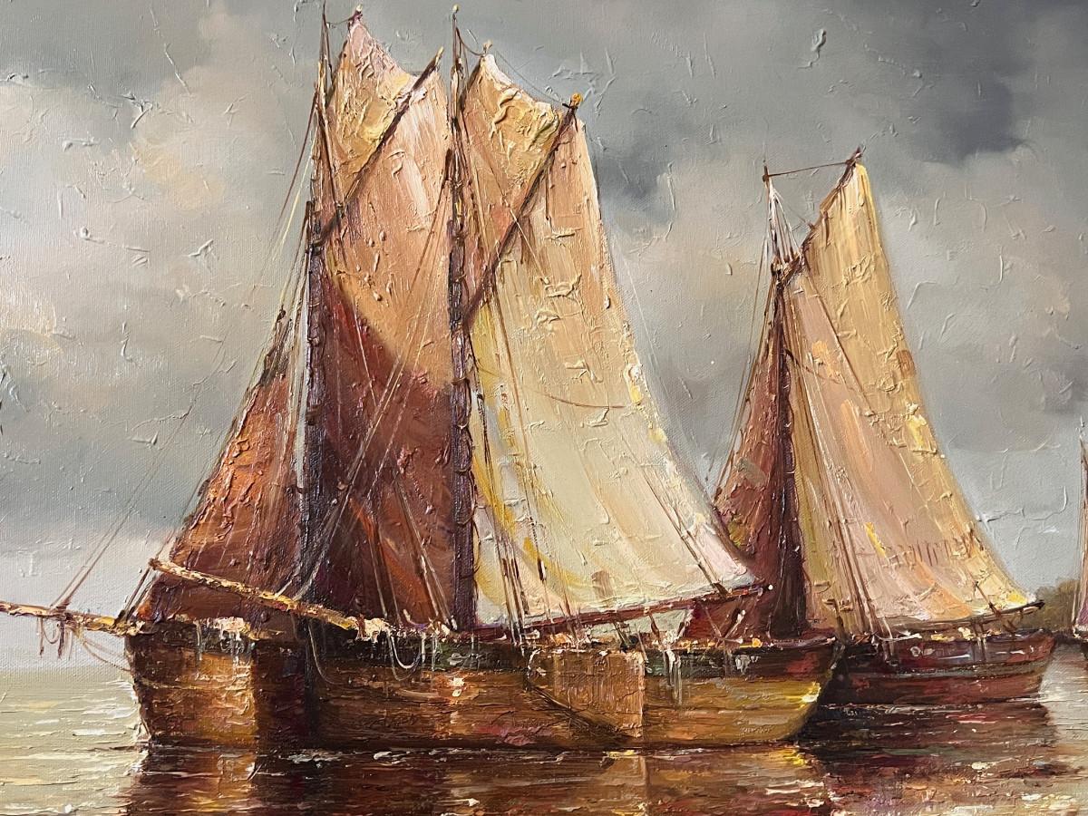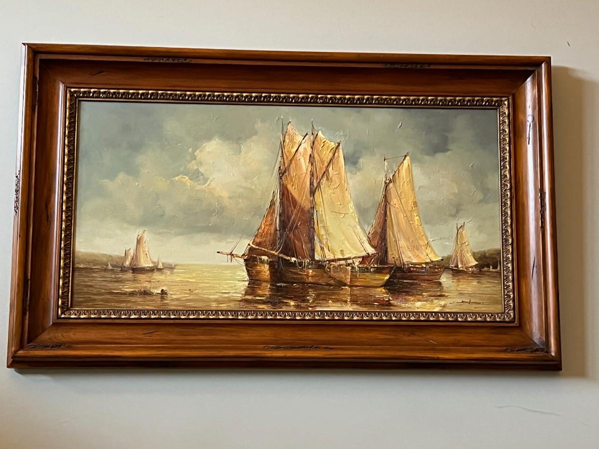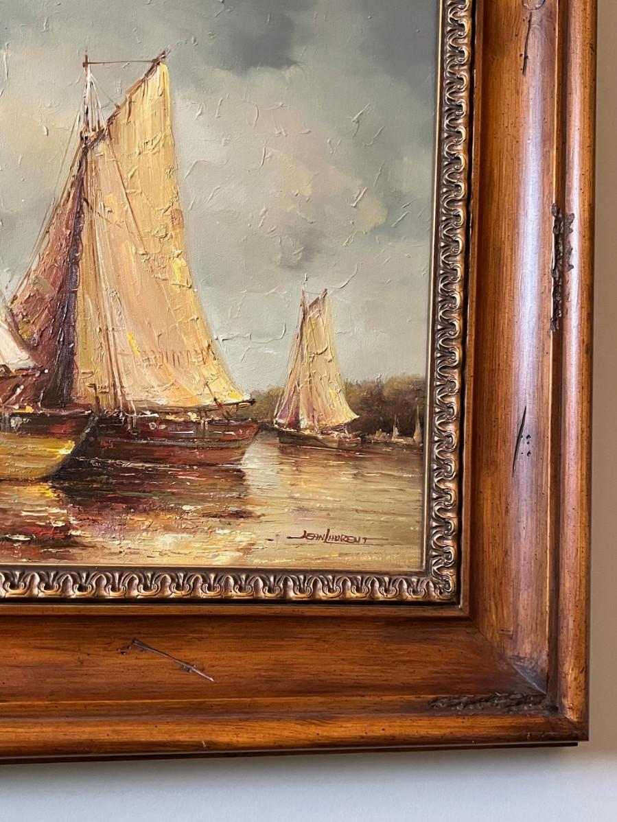 Jean Laurent MId Century Modern-ish original painting Sailboats Ships o/c
