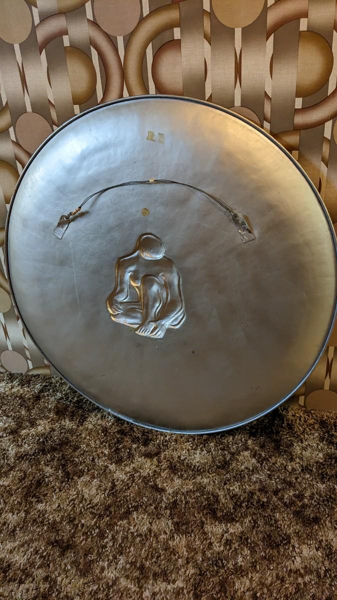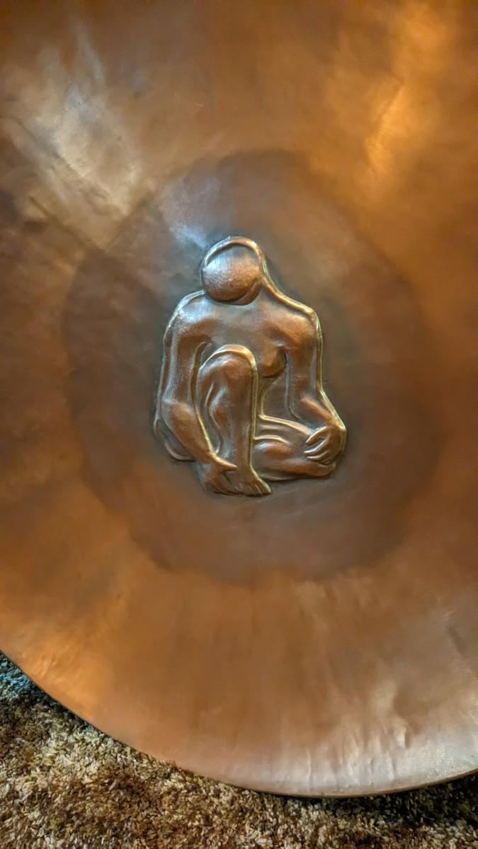 36.5" around. This stunning copper tone piece was made in Belgium, is unmarked otherwise, and is SO neat in person. A very mid-mod feeling piece with a stunning impression of lone figure in the center with slightly darker copper tones surrounding it. In excellent condition. Includes braided fan/wall hanging that shows some wear from age, no broken spots though. oversized shipping will apply. Inquire for details before bidding. basement