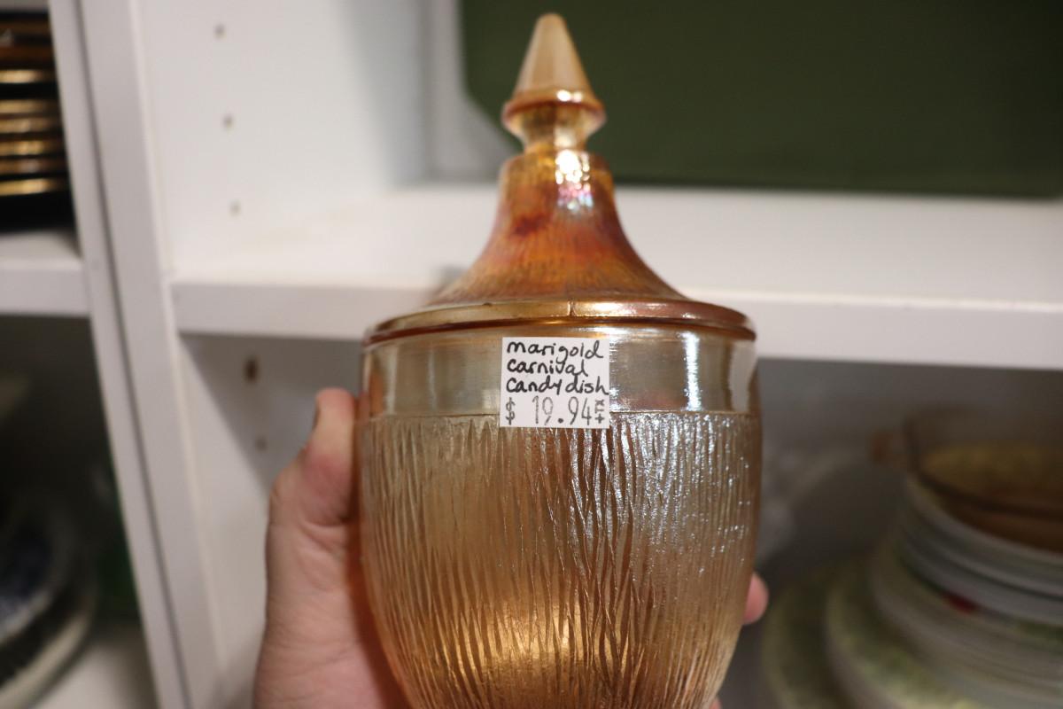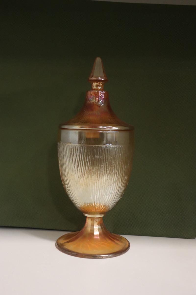 Jeanette Iridescent Marigold Carnival Glass Candy Dish &Lid Tree Bark Design 618