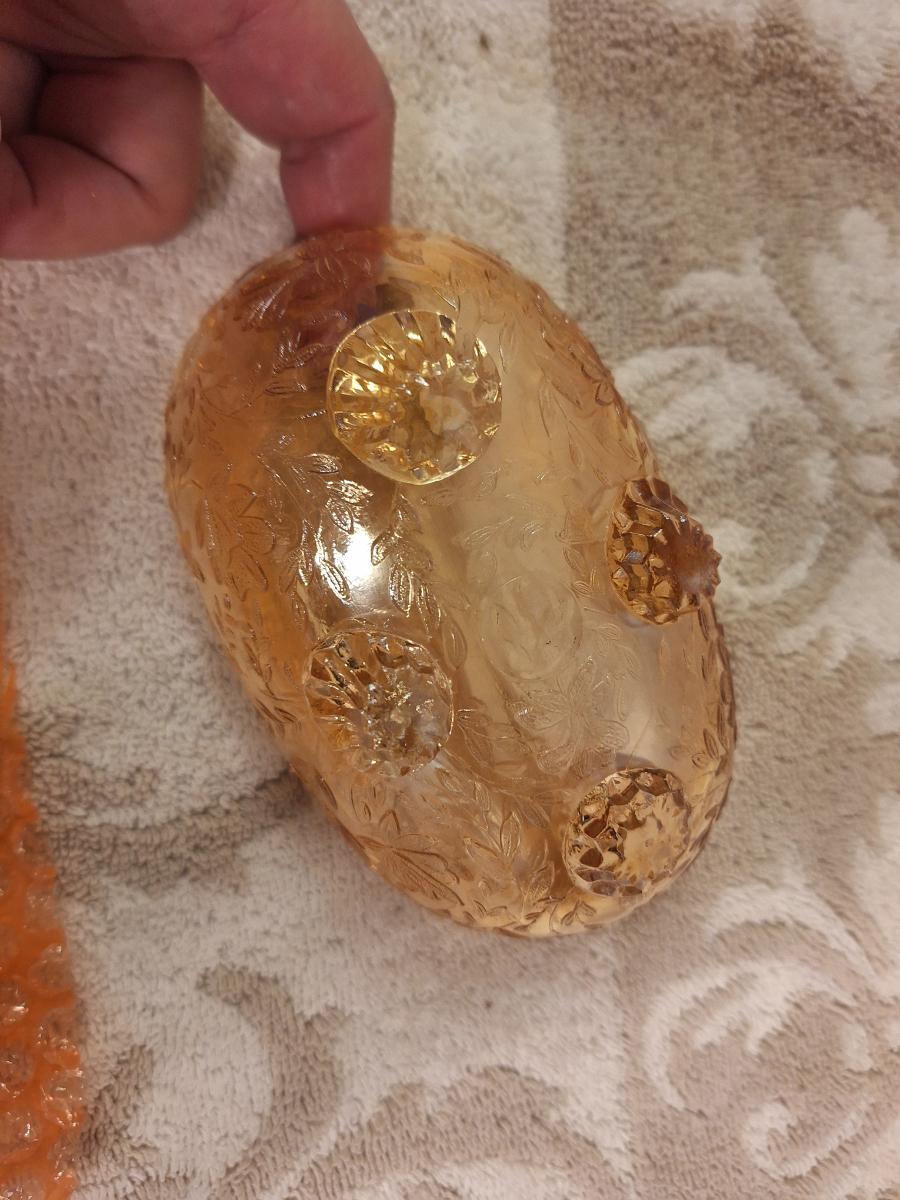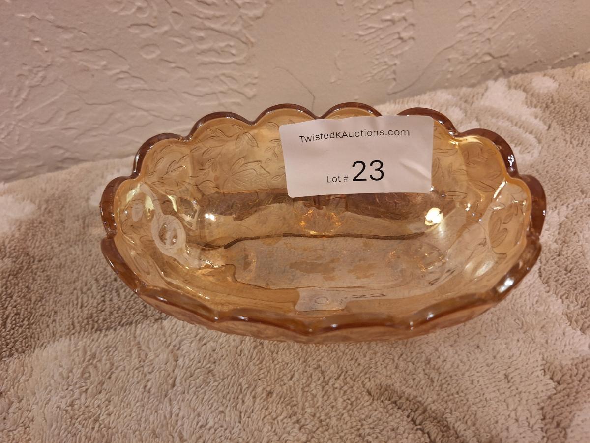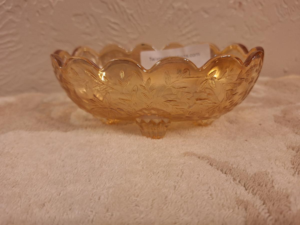 Jeannette Glass Floragold iridescent carnival glass 4-toed open candy dish in the "Louisa" pattern. (small)