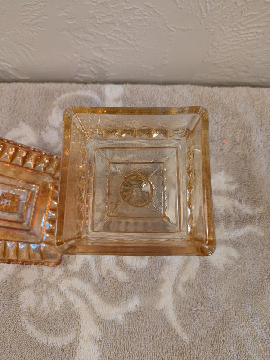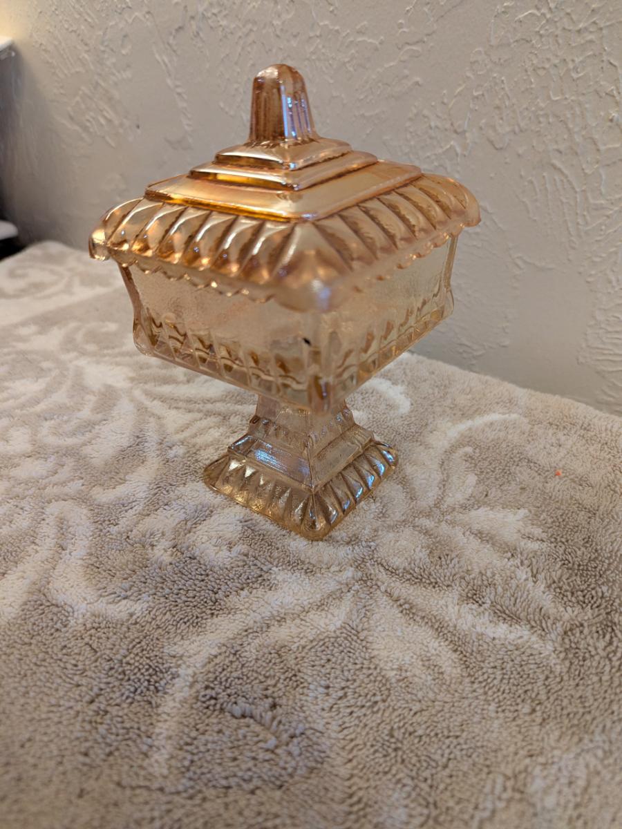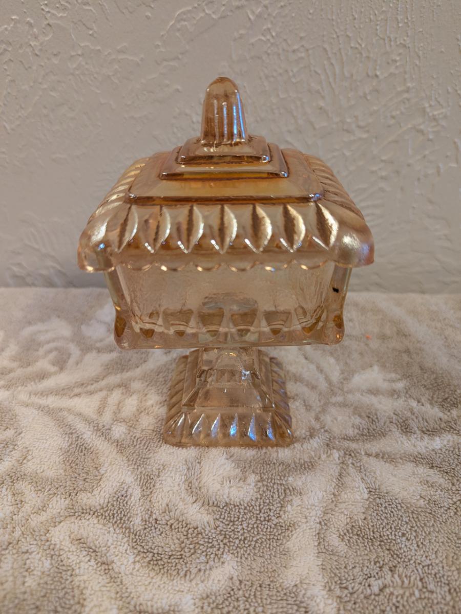 Jeannette Glass wedding box or wedding cake box saure pedestal candy dish in marigold carnival glass