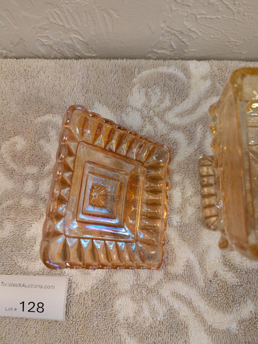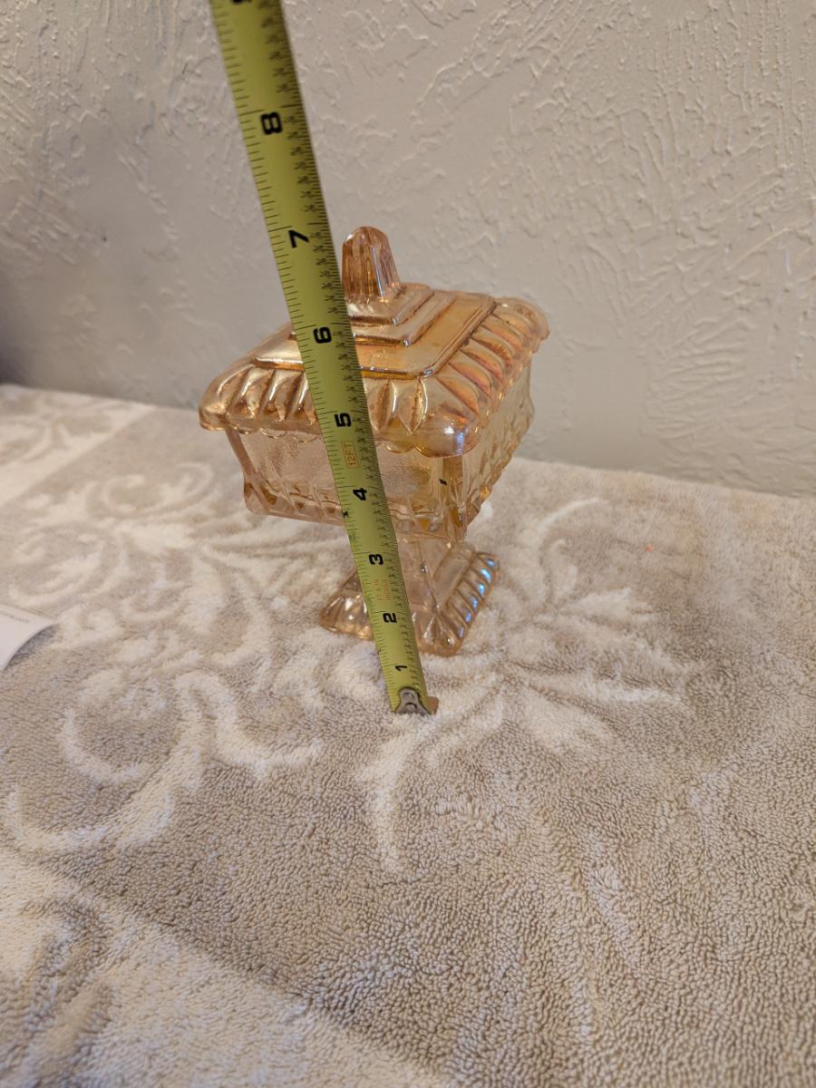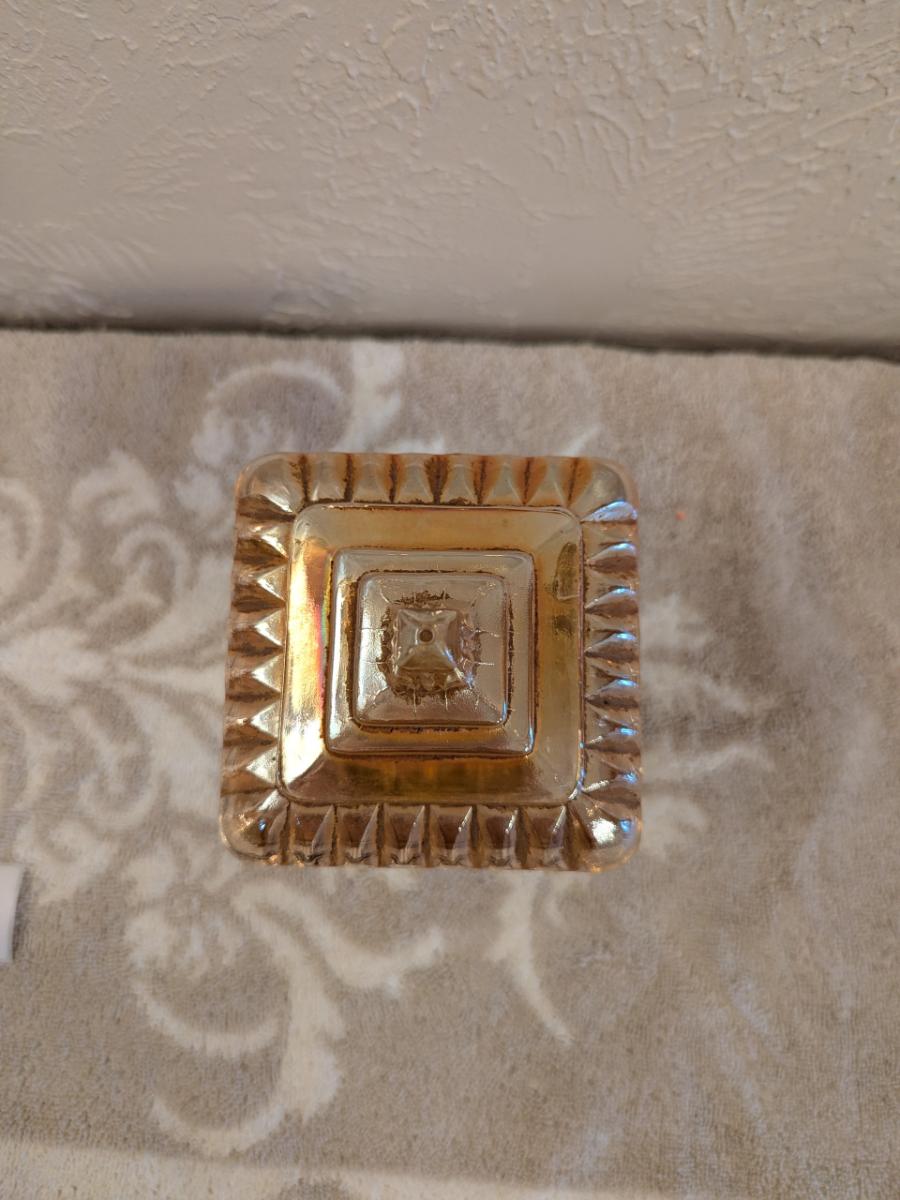 Jeannette Glass wedding box or wedding cake box saure pedestal candy dish in marigold carnival glass