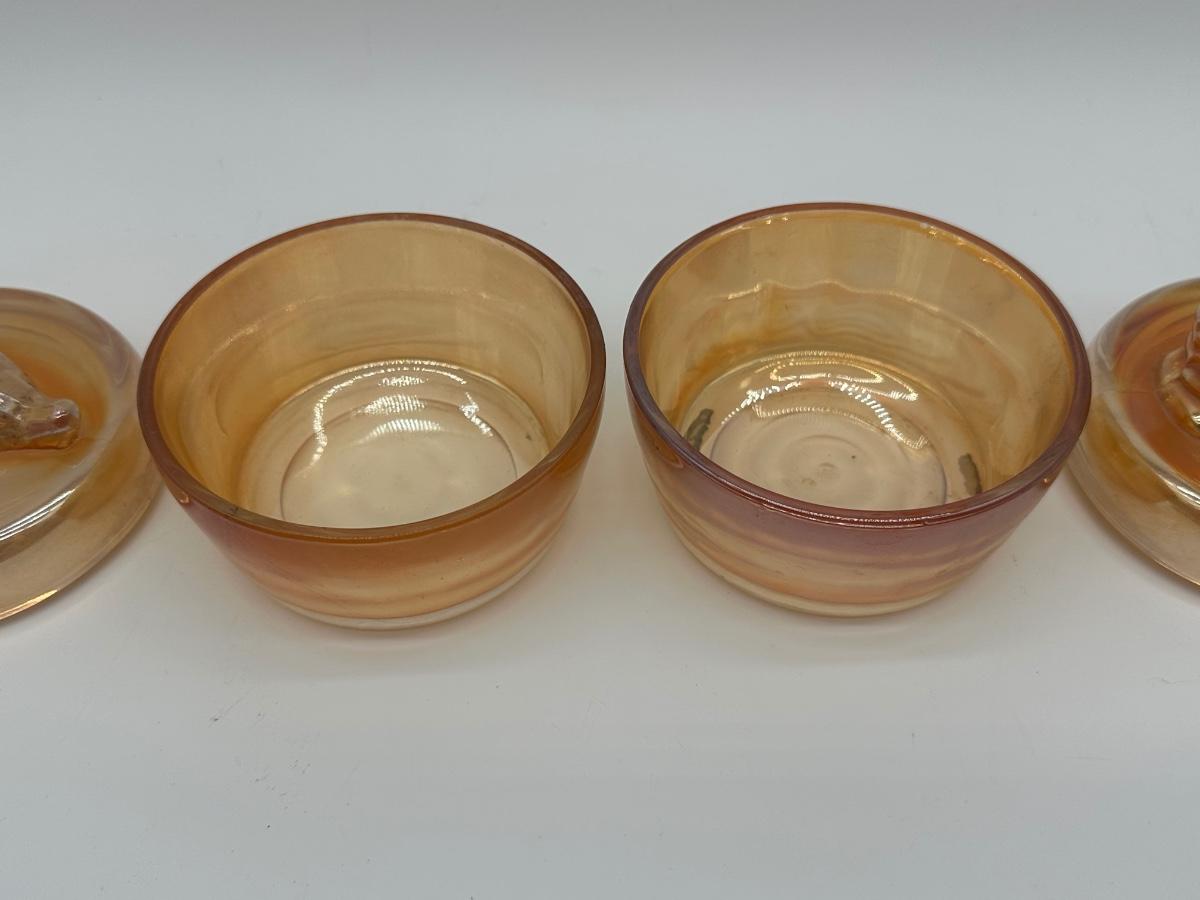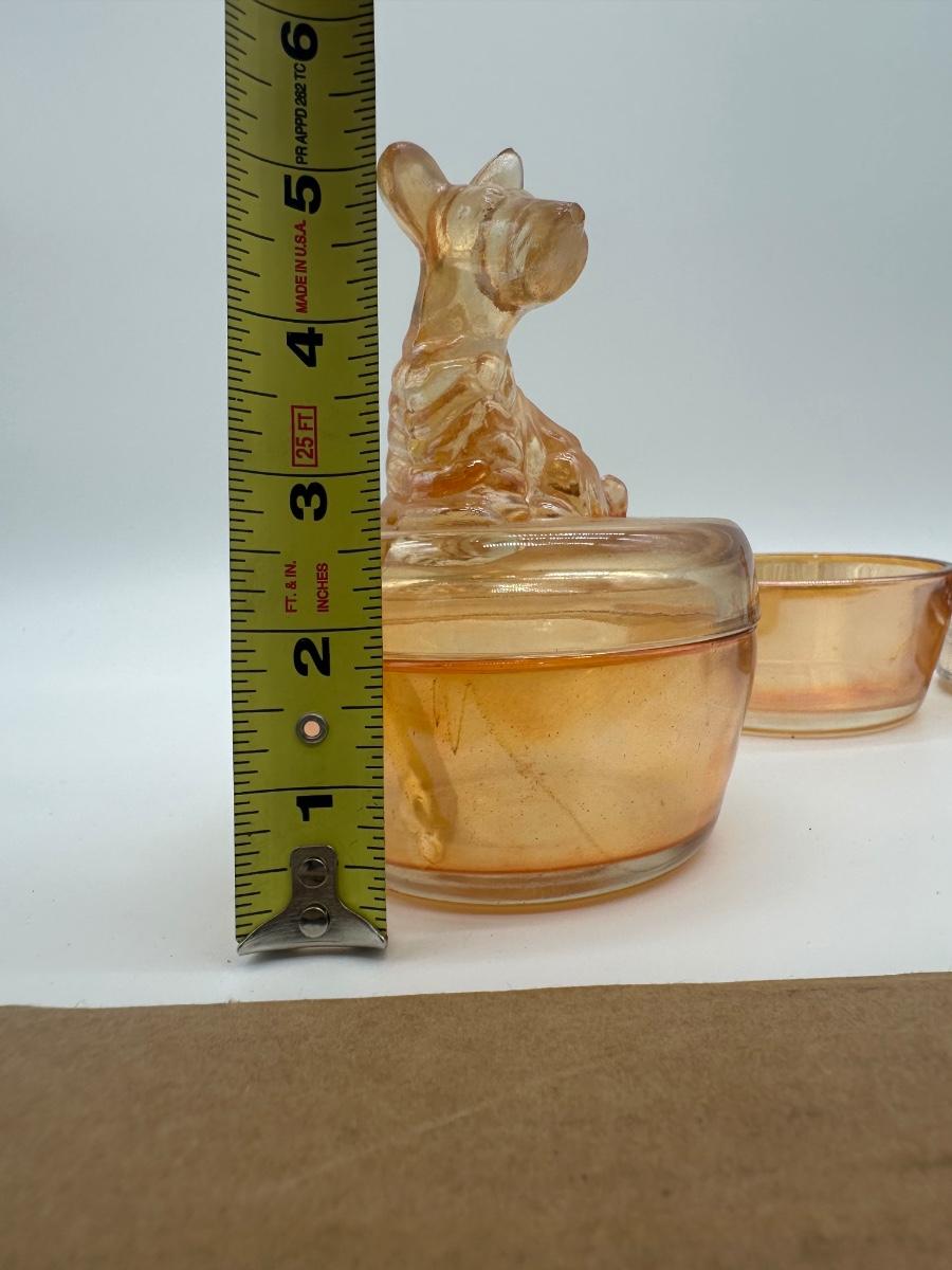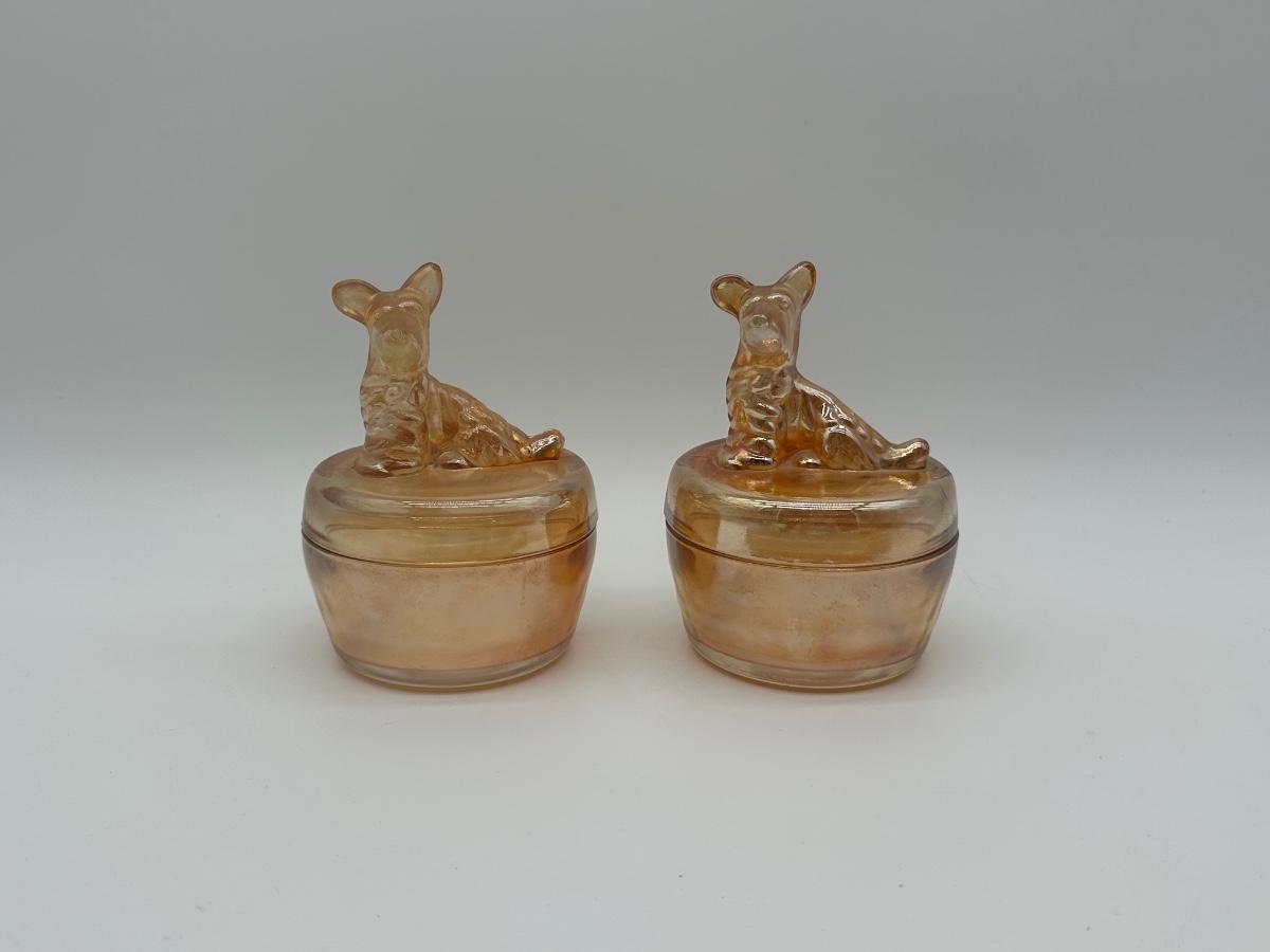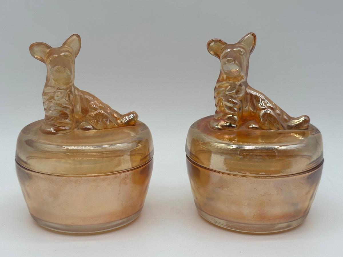 Pair of Jeannette marigold carnival glass covered dishes featuring seated Scottie dog finial lids. Each measures approximately 4” in diameter and about 5” tall with lid in place.
