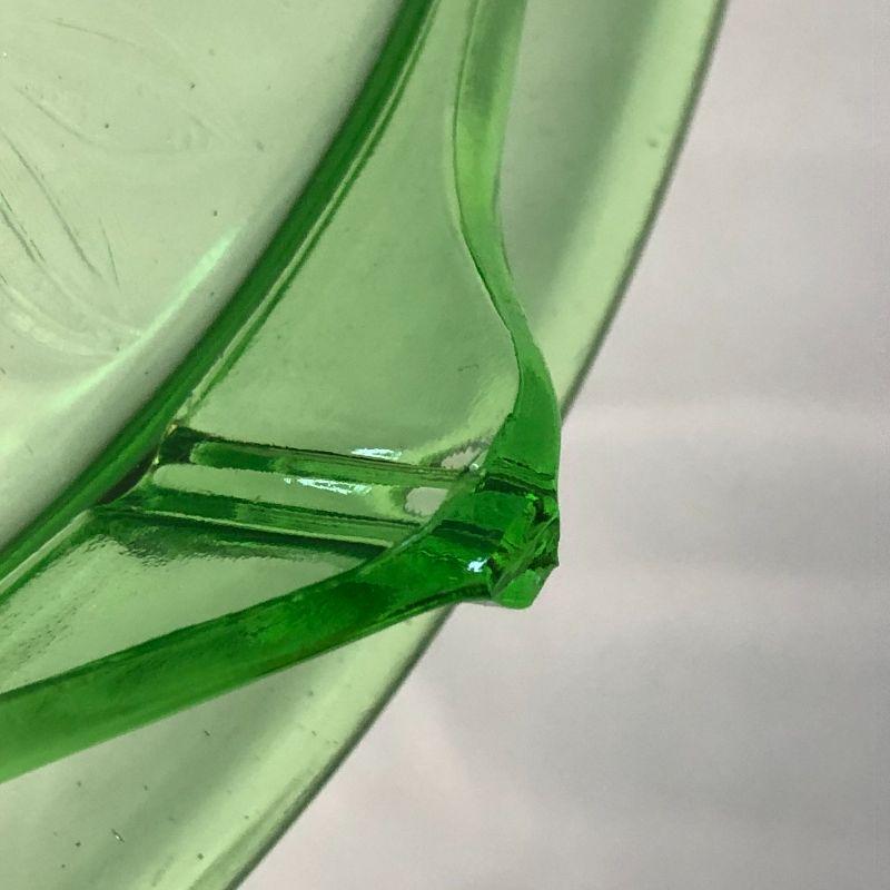 Jennette Glass made this pattern between 1930-1935. This plate is in excellent condition, but there is a very minor chip on the edge of one foot (something that you feel rather than see). It is just under 10" in diameter.