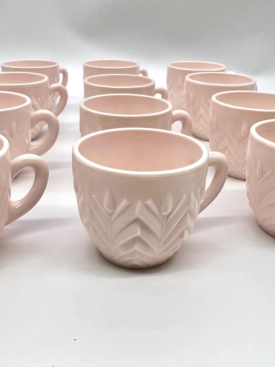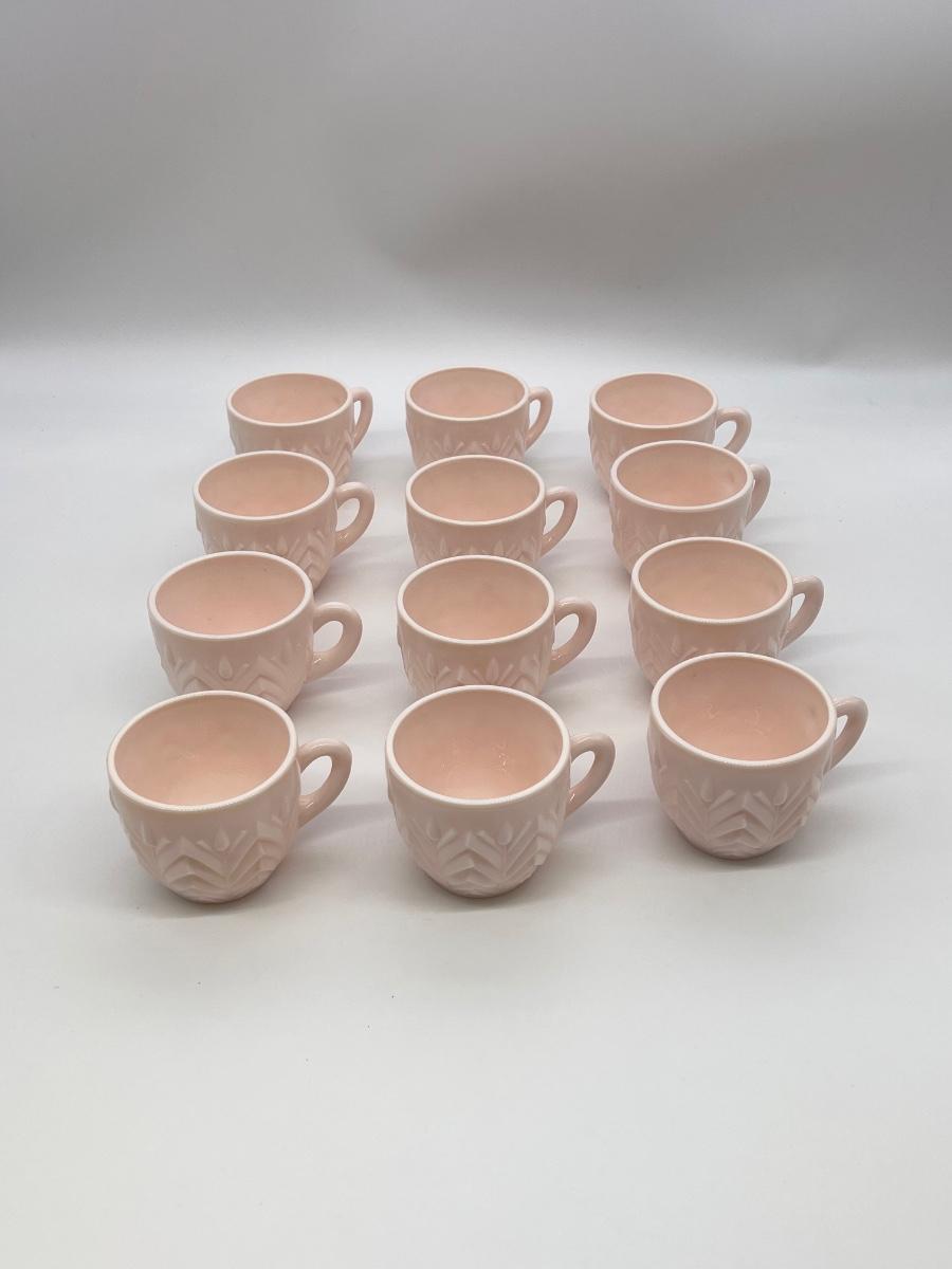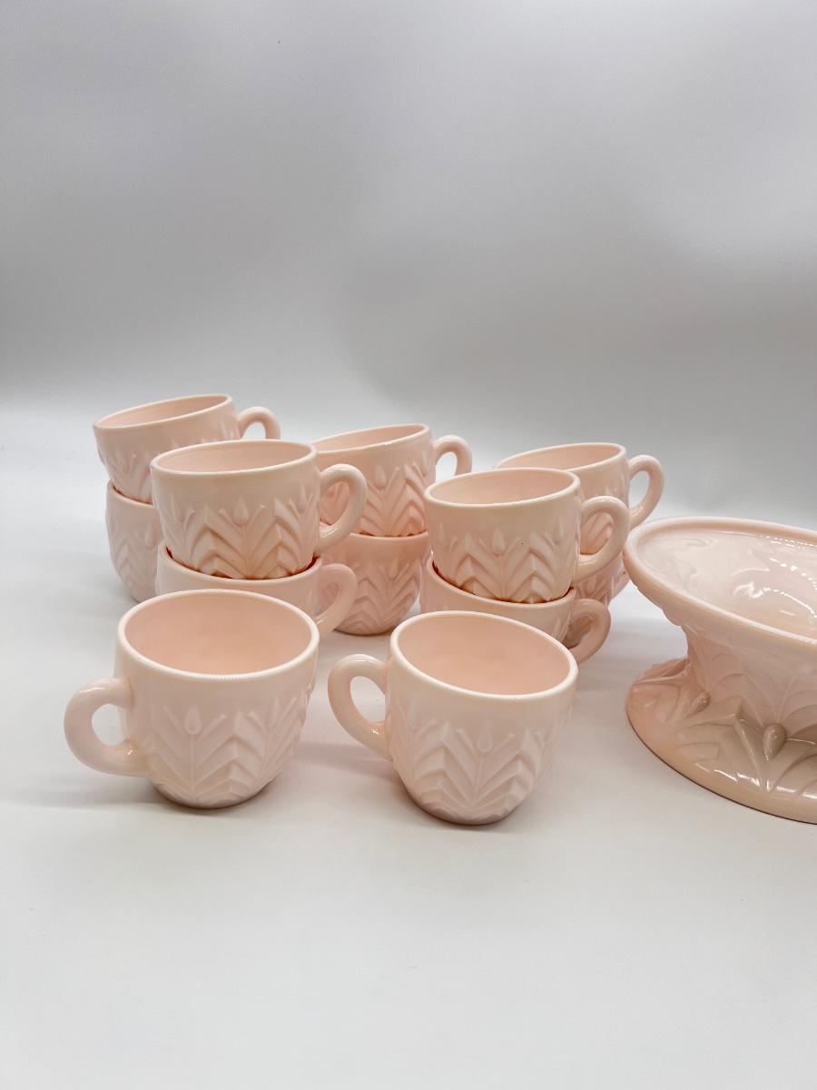 Jeannette ~ Twelve (12) Shell Pink Milk Glasses & One (1) Punch Bowl Pedestal