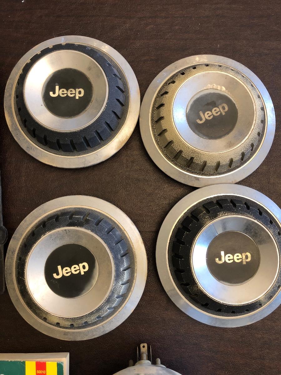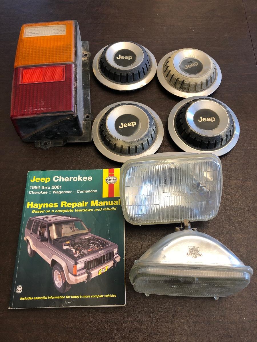 Jeep tail light, headlights, hubcaps, and Haynes repair manual.