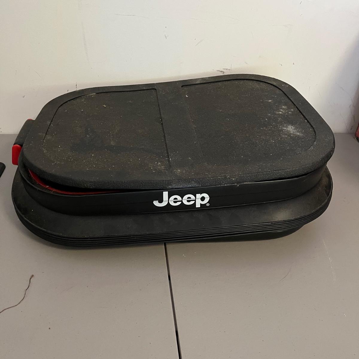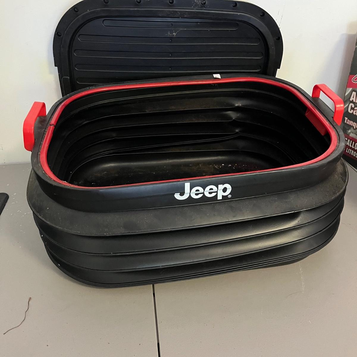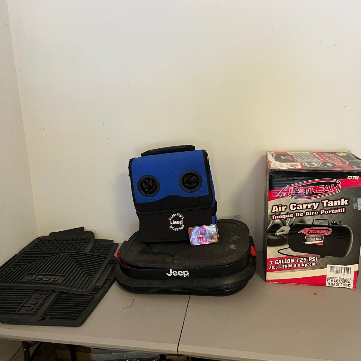Lot includes three Jeep rubber floor mats, Air Stream 7 gallon air tank, Jeep rolling cooler and a Jeep plastic storage box. That measures 20” x 24” x 8”.