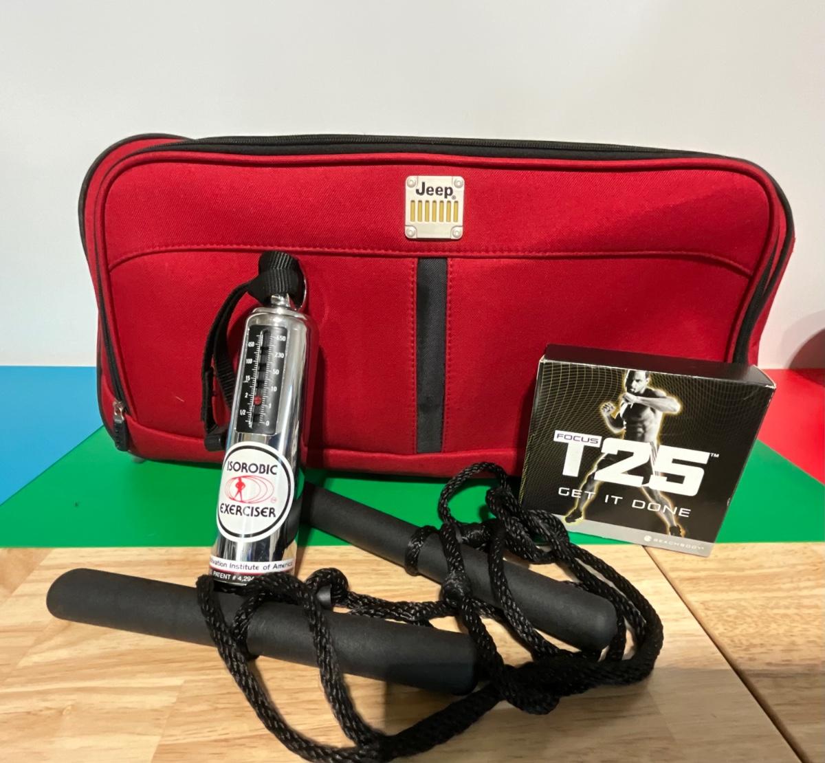 Jeep duffle bag, Isorobic Exerciser, T25 Focus