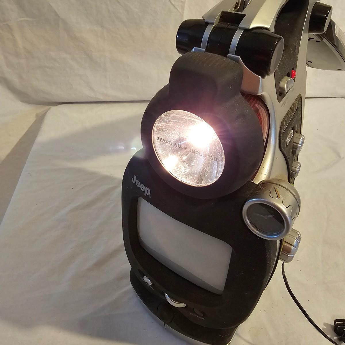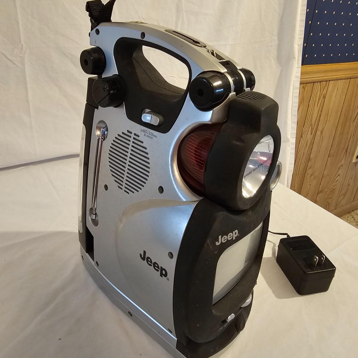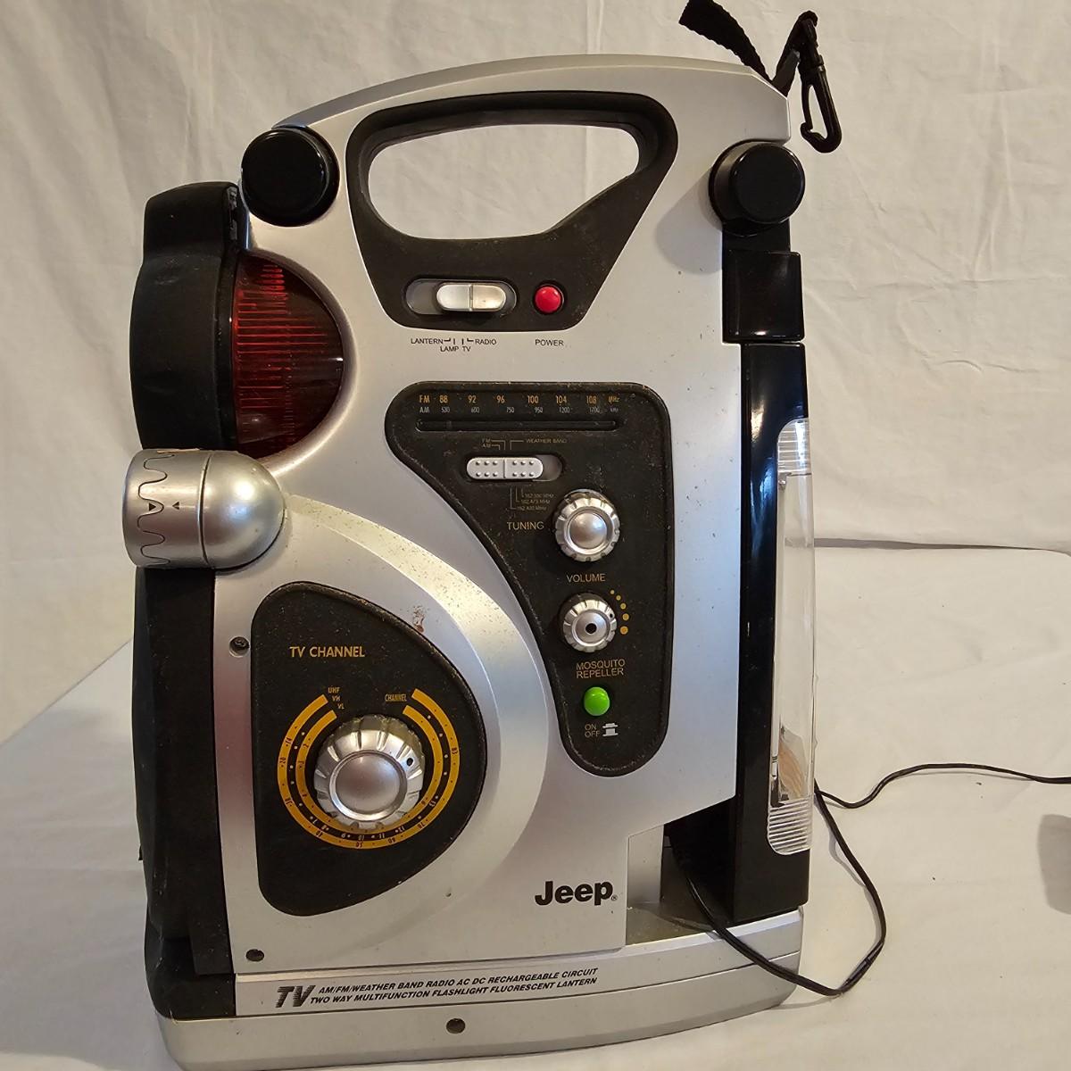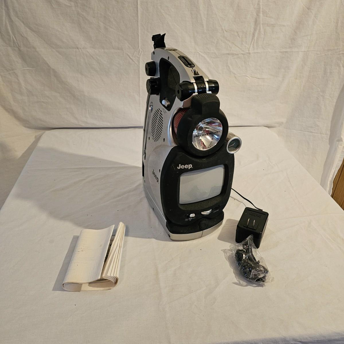 Jeep brand light, radio, lantern, tv and more. Unit has am/fm band, three tv settings, compass, thermometer. Powered by AC or DC and rechargeable battery. Includes both power adapters, unit powered on when plugged into AC, not tested on DC. Carry strap and handle. Unit measures 7" x 11" x 15"H. See photos for details. Shipping available.