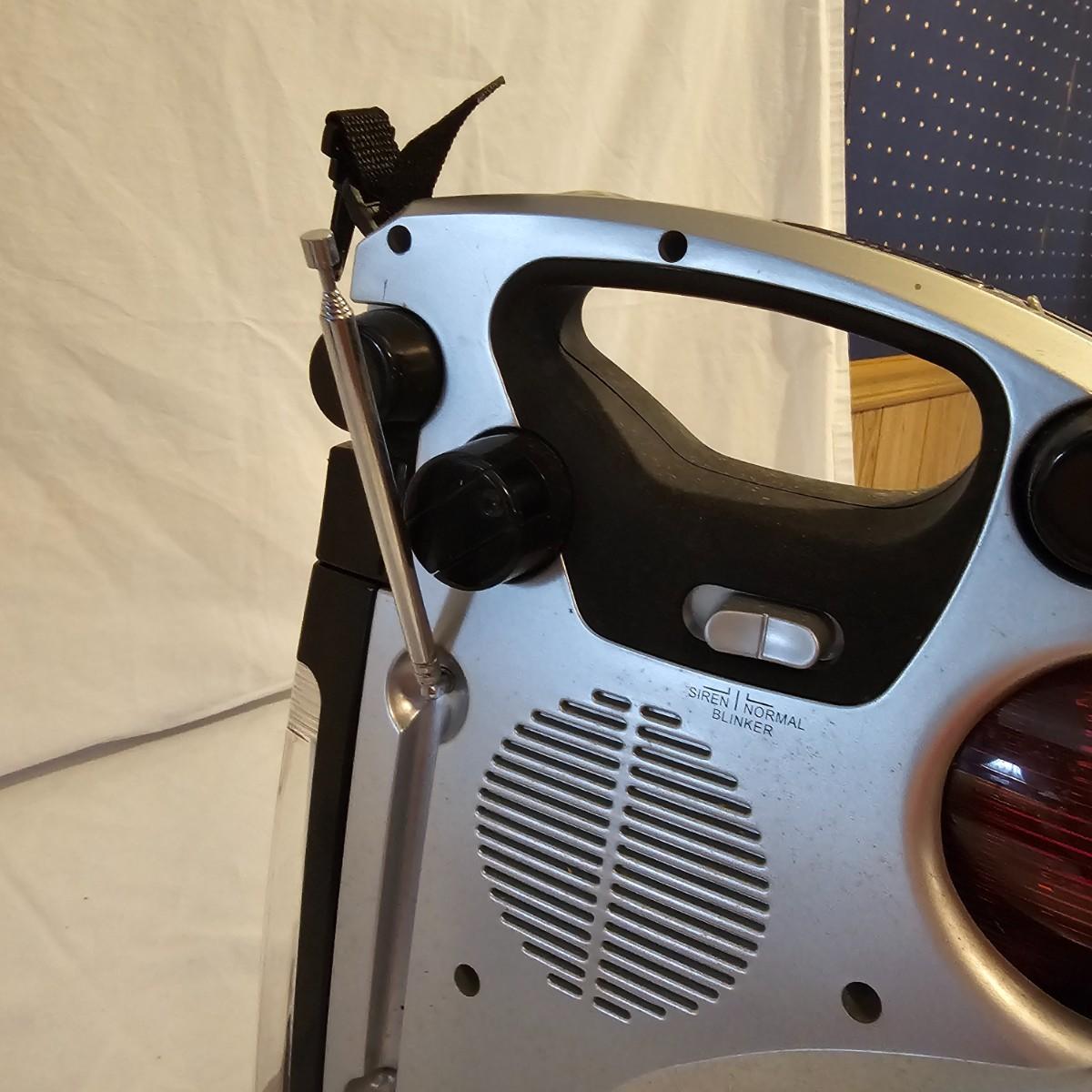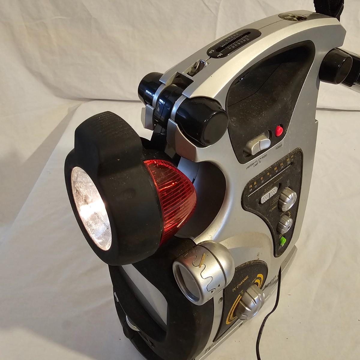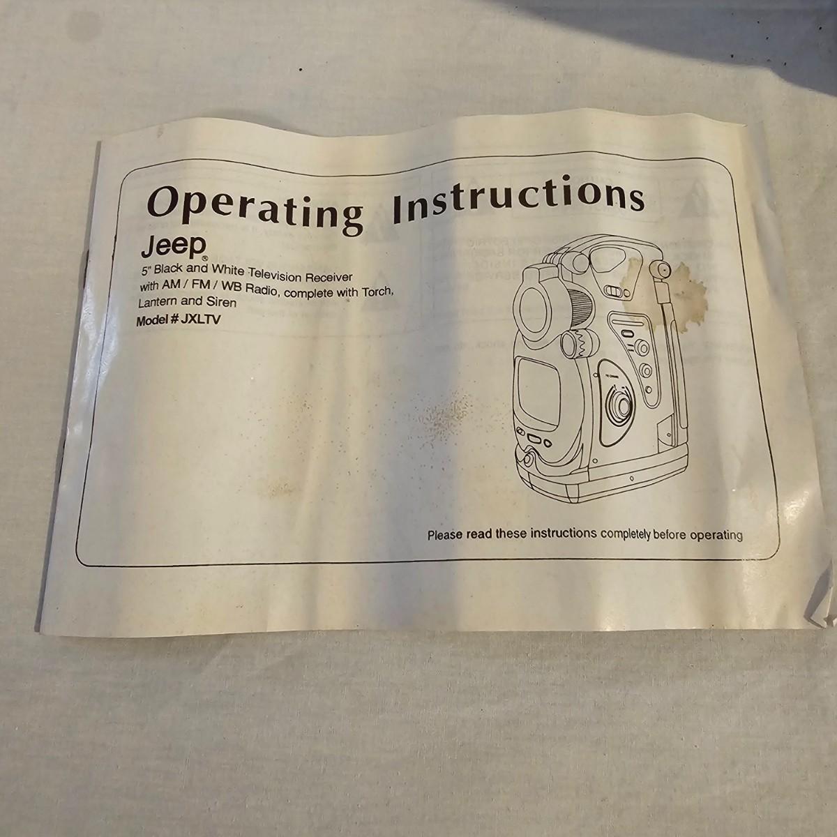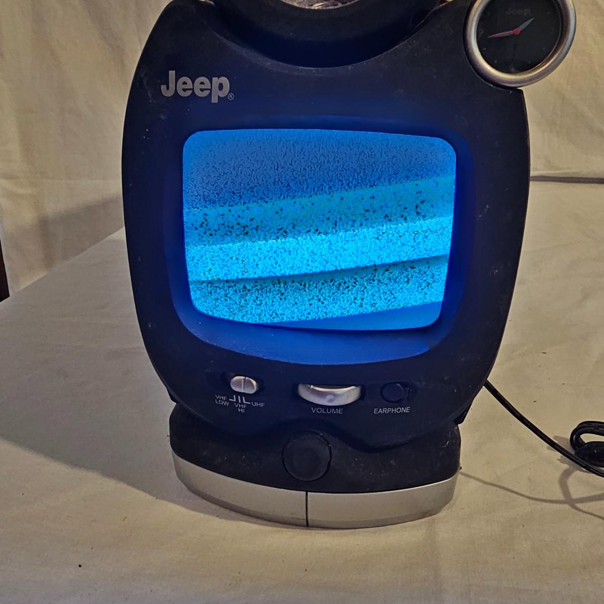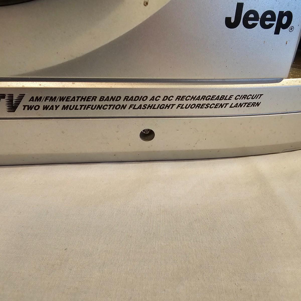 Jeep brand light, radio, lantern, tv and more. Unit has am/fm band, three tv settings, compass, thermometer. Powered by AC or DC and rechargeable battery. Includes both power adapters, unit powered on when plugged into AC, not tested on DC. Carry strap and handle. Unit measures 7" x 11" x 15"H. See photos for details. Shipping available.