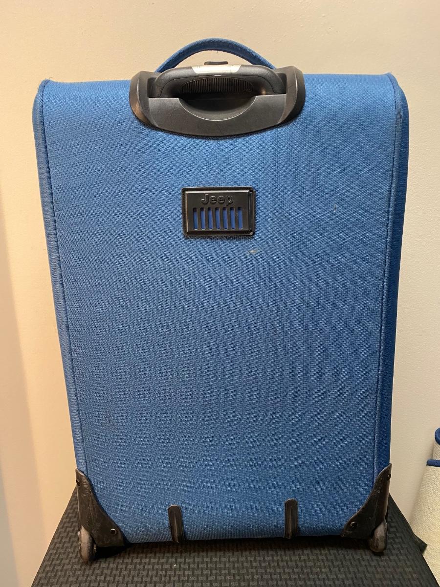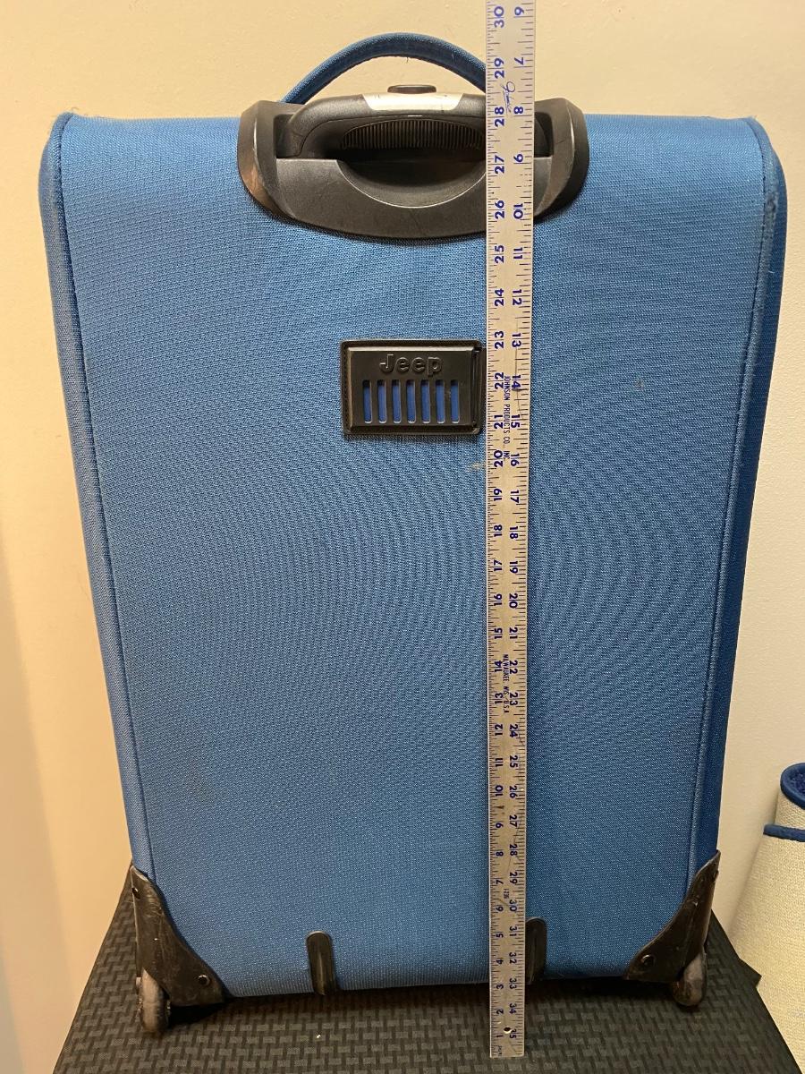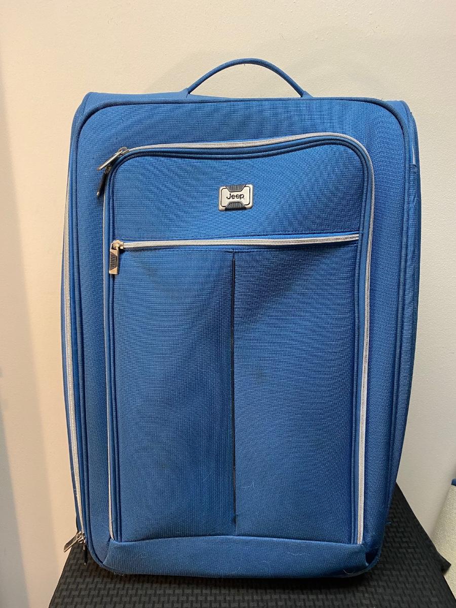 Jeep Rolling Travel Suitcase Luggage, there is some light tearing and discolor on the front of the luggage, but there is no other significant damage to the luggage and is in good useable condition. Check pictures for more details and for sizing.