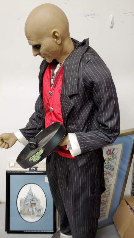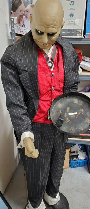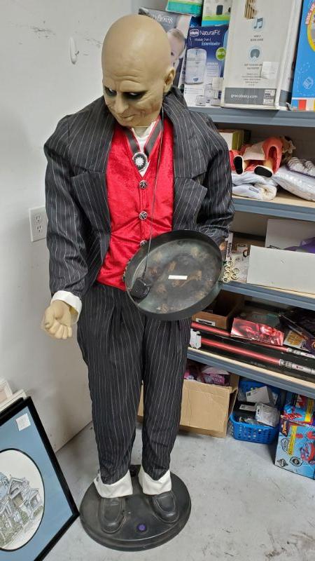 Jeeves 6' Animated Butler - Talks, Motion Sensor, Eyes Move - Hand Has Been Repaired - Collapses down to 3' for easy storage. Shipping available, please ask for quote before bidding.