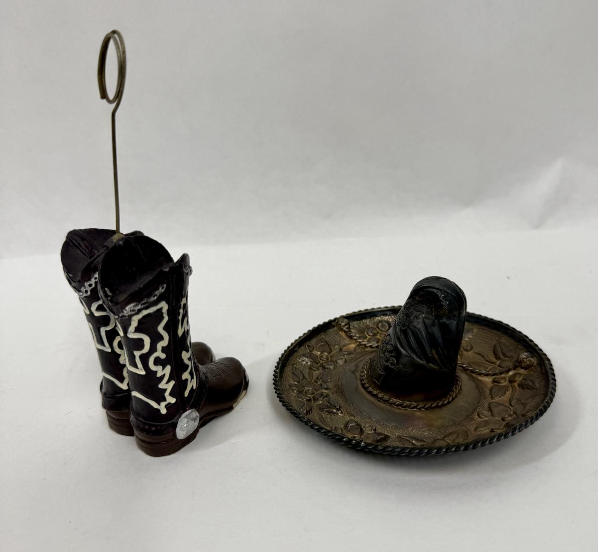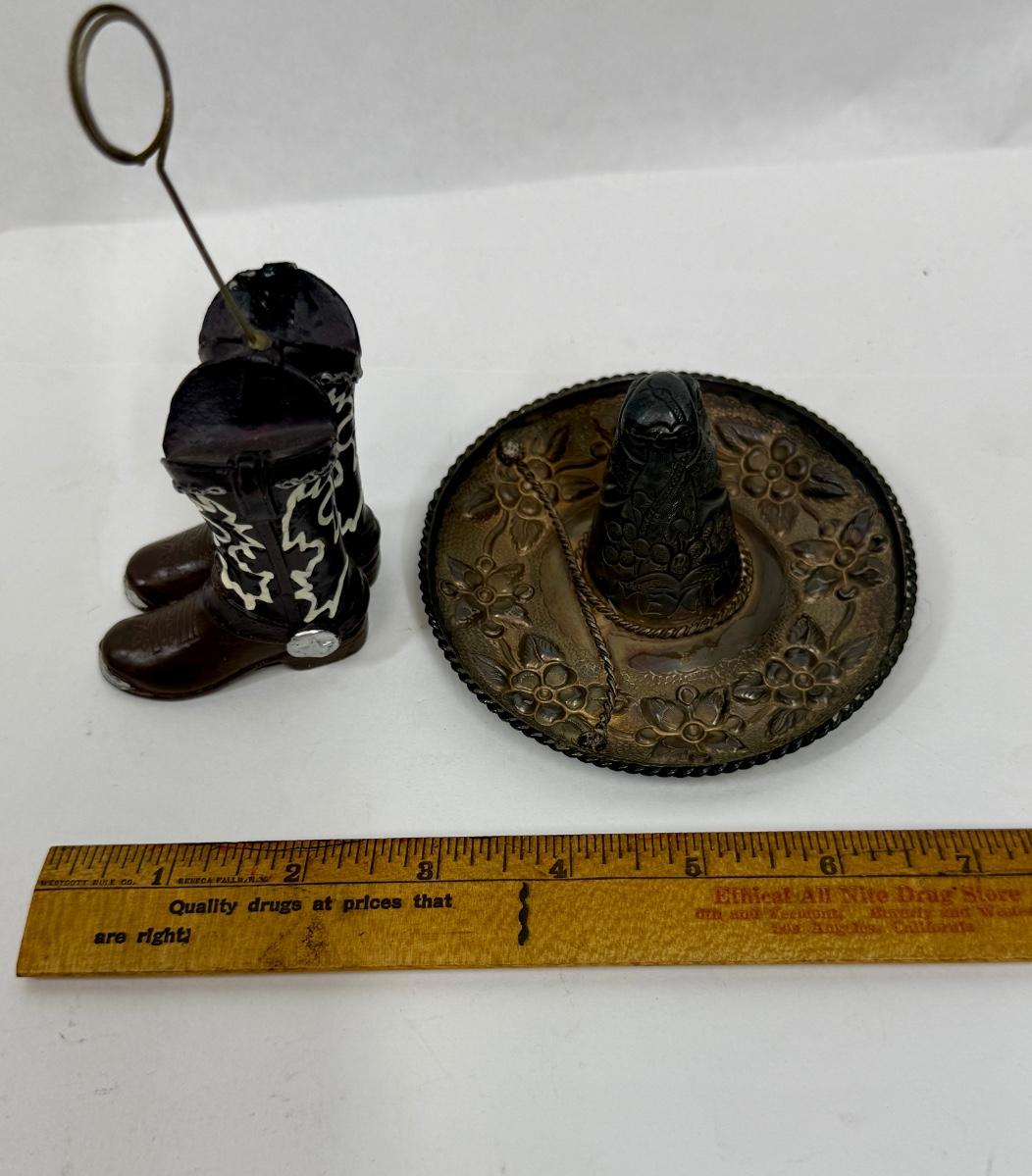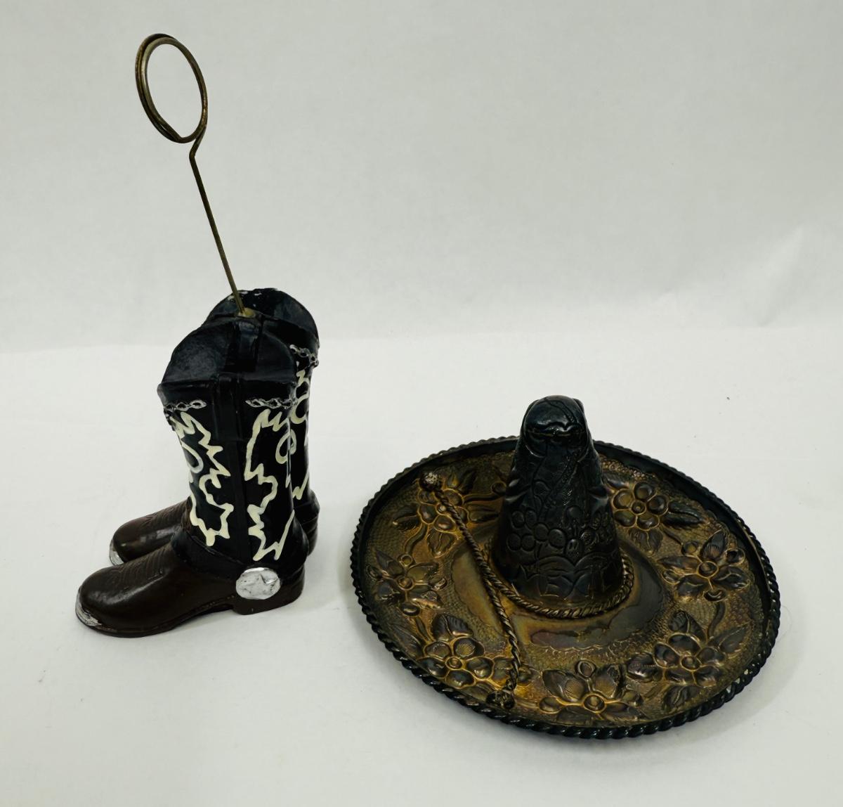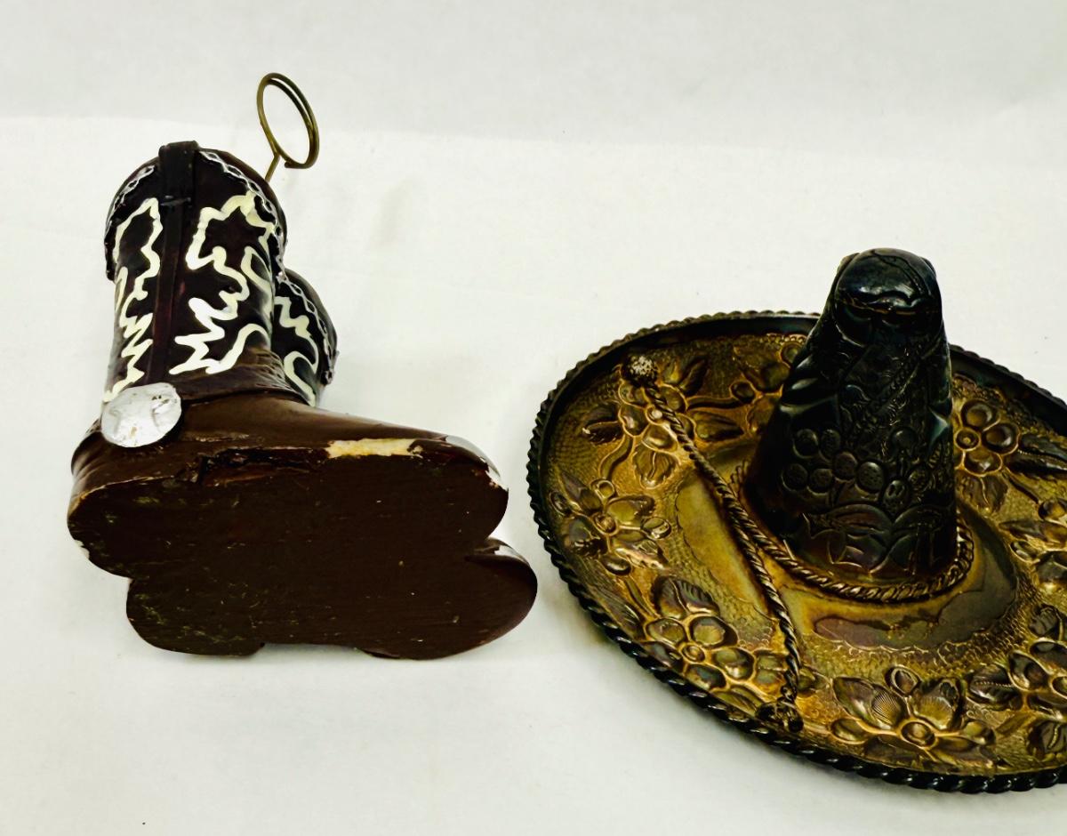 Sombrero marked "MEXICO" but no other markings. Approx. 4.25" across, boots are approx. 5.5" tall at the top of the holder ring. Both are in good condition.
