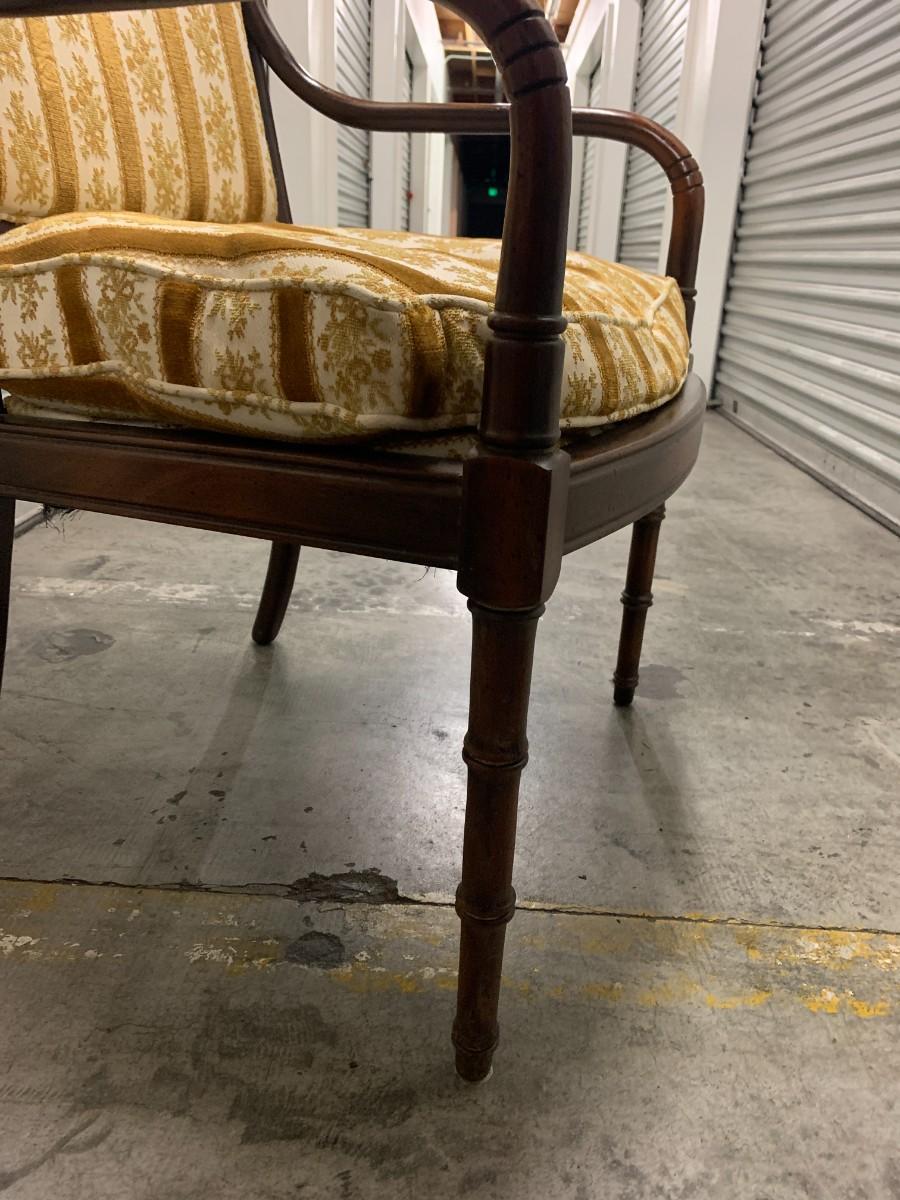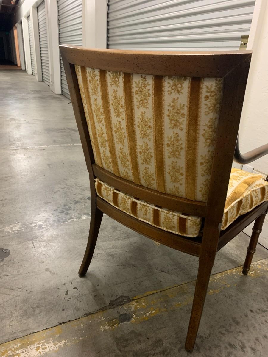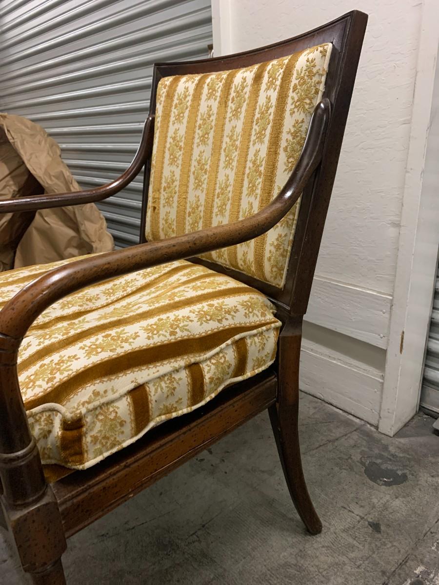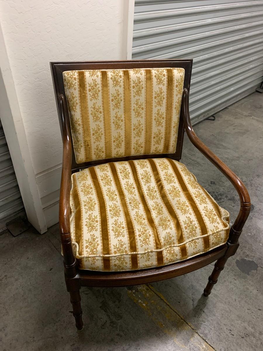 Also called a Federalist chair, this item is 35"h, with gold striped and floral upholstery. May have wear, scratches but in overall very good condition