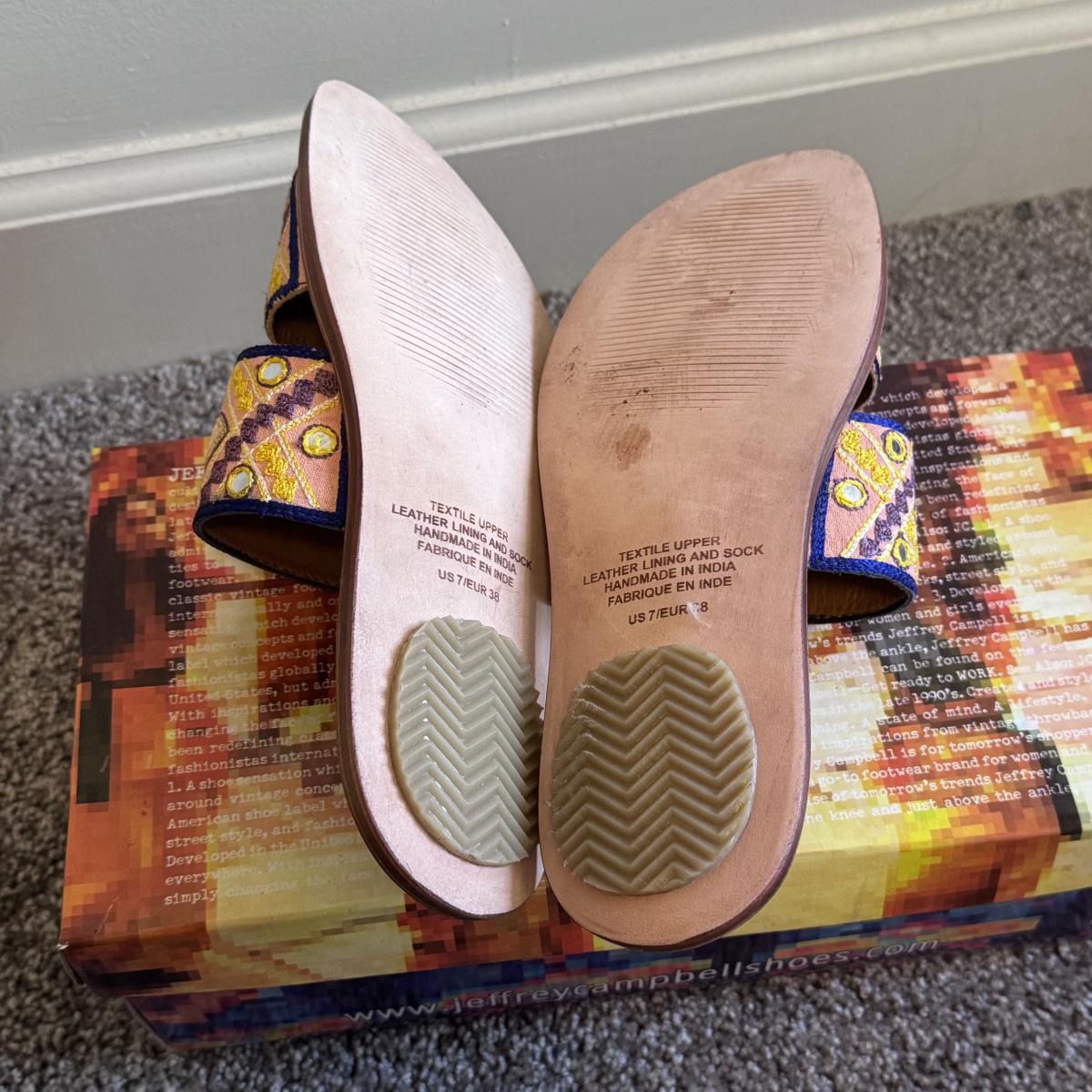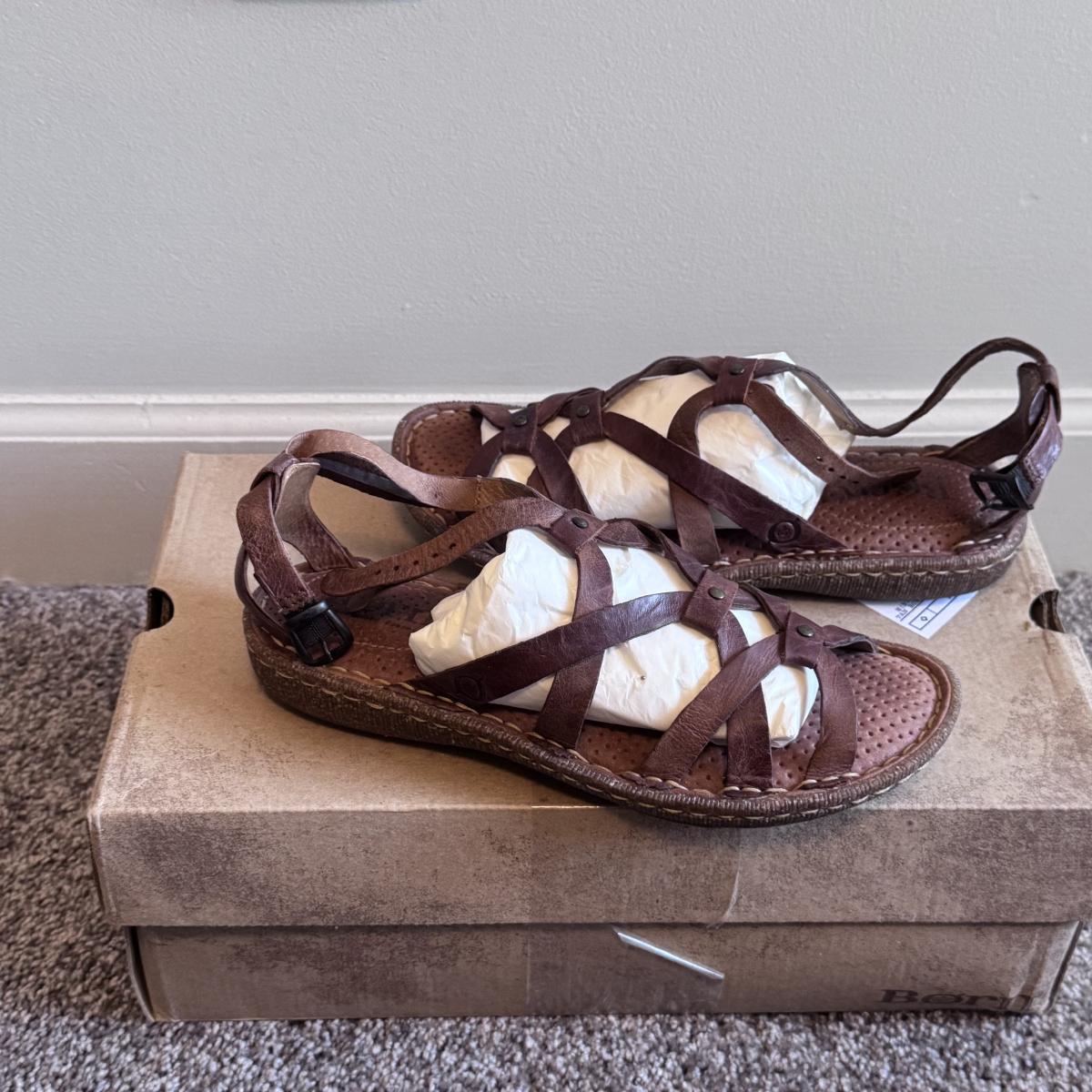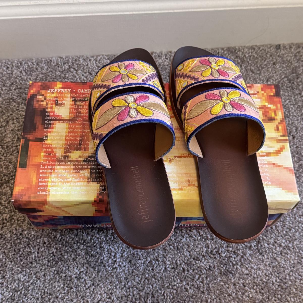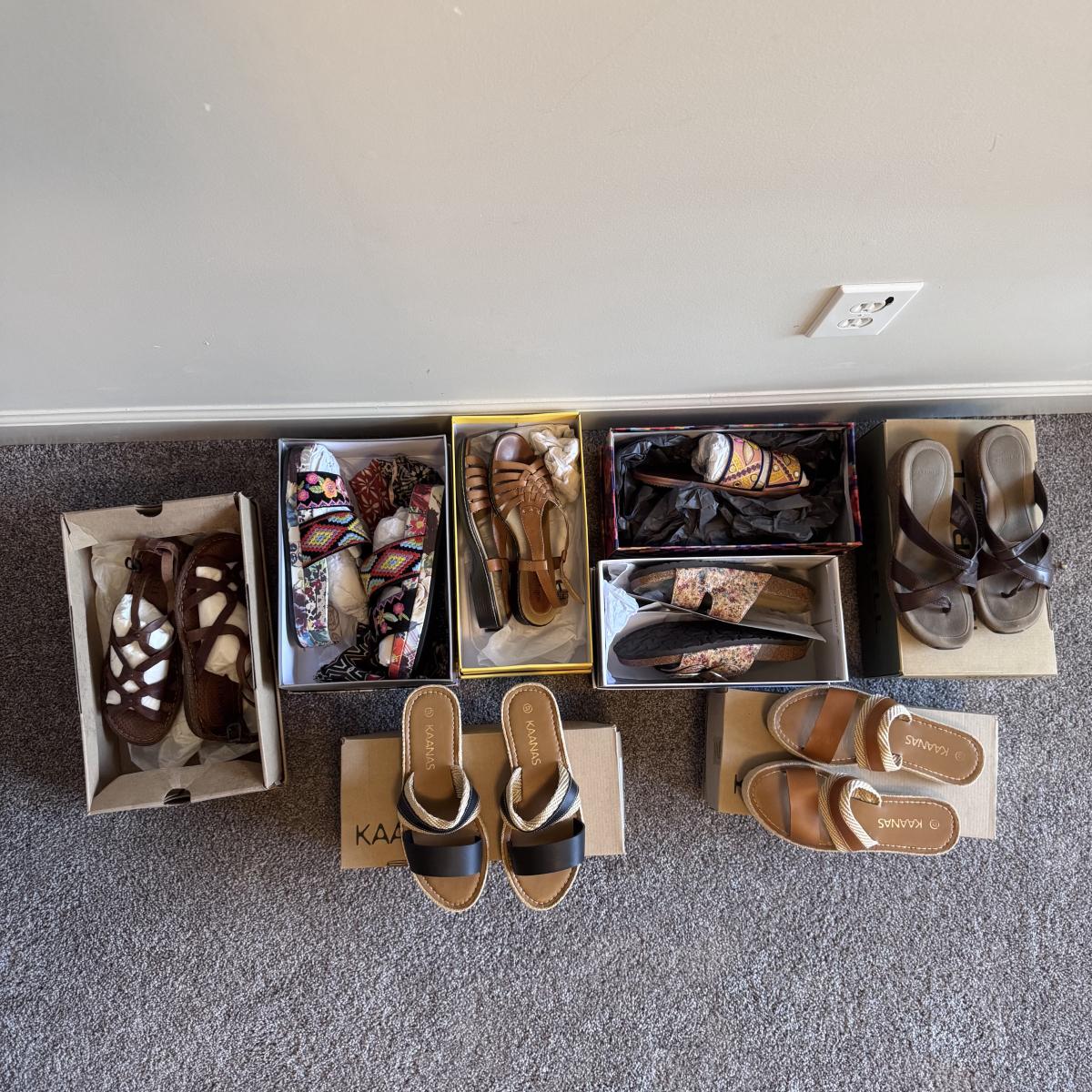 This lot of includes eight pairs of size 7 women’s sandals from Jeffrey Campbell, Merrell, Kaanas, White Mountain, Johnny Was, Born, and Soft Spots. A few of the shoes appear unworn - see pictures for details. All shoes have their original shoe box. Shipping available.