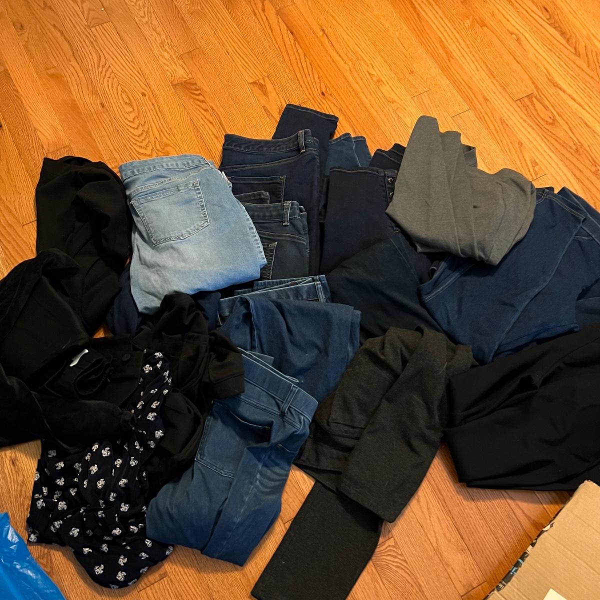 Large lot of mostly Jeggins style pull-on pants are size 14-16 with one sized medium. Lot also includes black plus grey soft pull-on pants and a pair of denim shorts. 19 pants in lot.