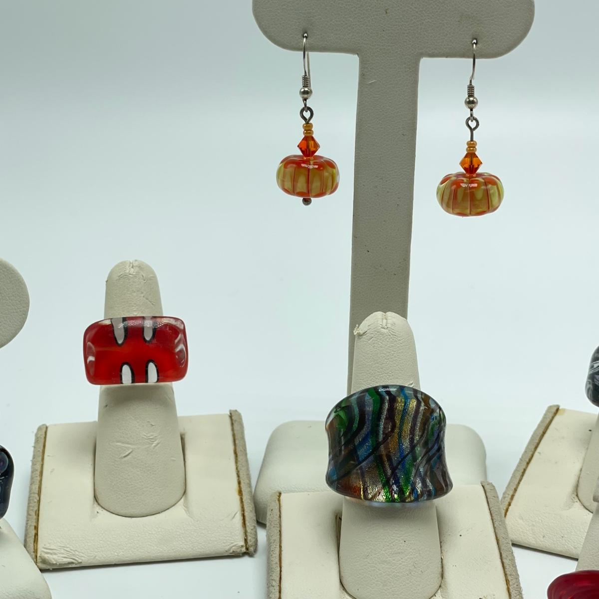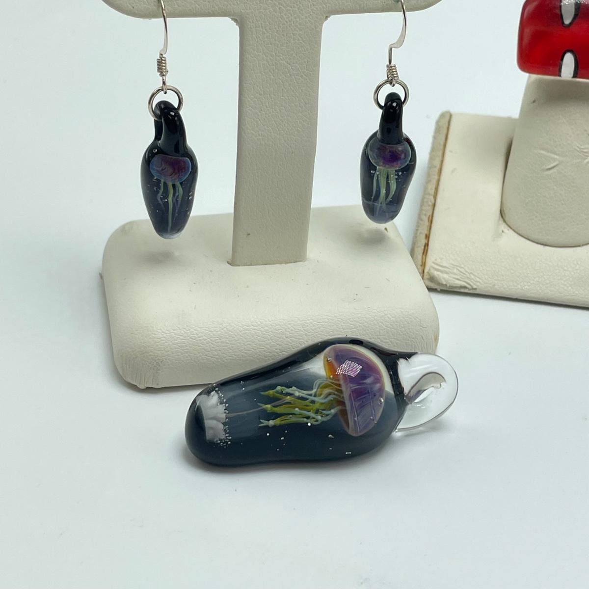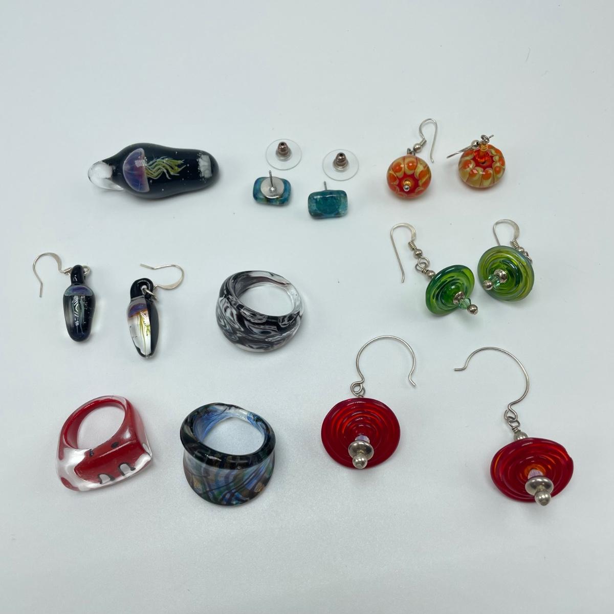 Fun jellyfish pendant and earring set with four pairs of earrings and three rings. The red disc earrings have a small chip. All jewelry appears to be glass or quality artisan resin. See images. All sales are final. No returns or refunds. Please bid accordingly.