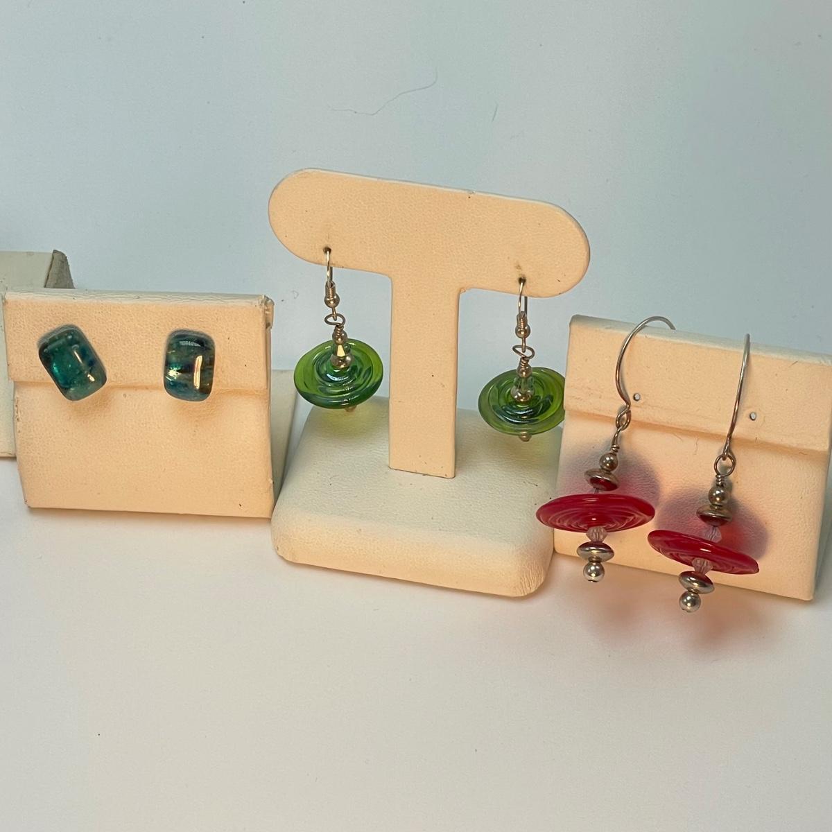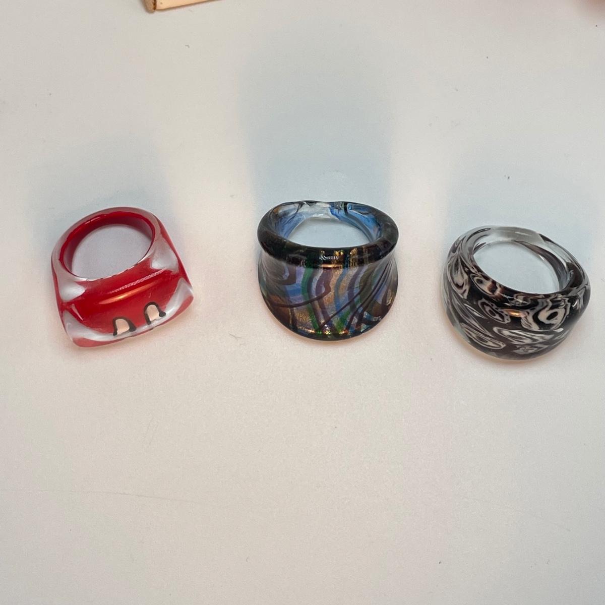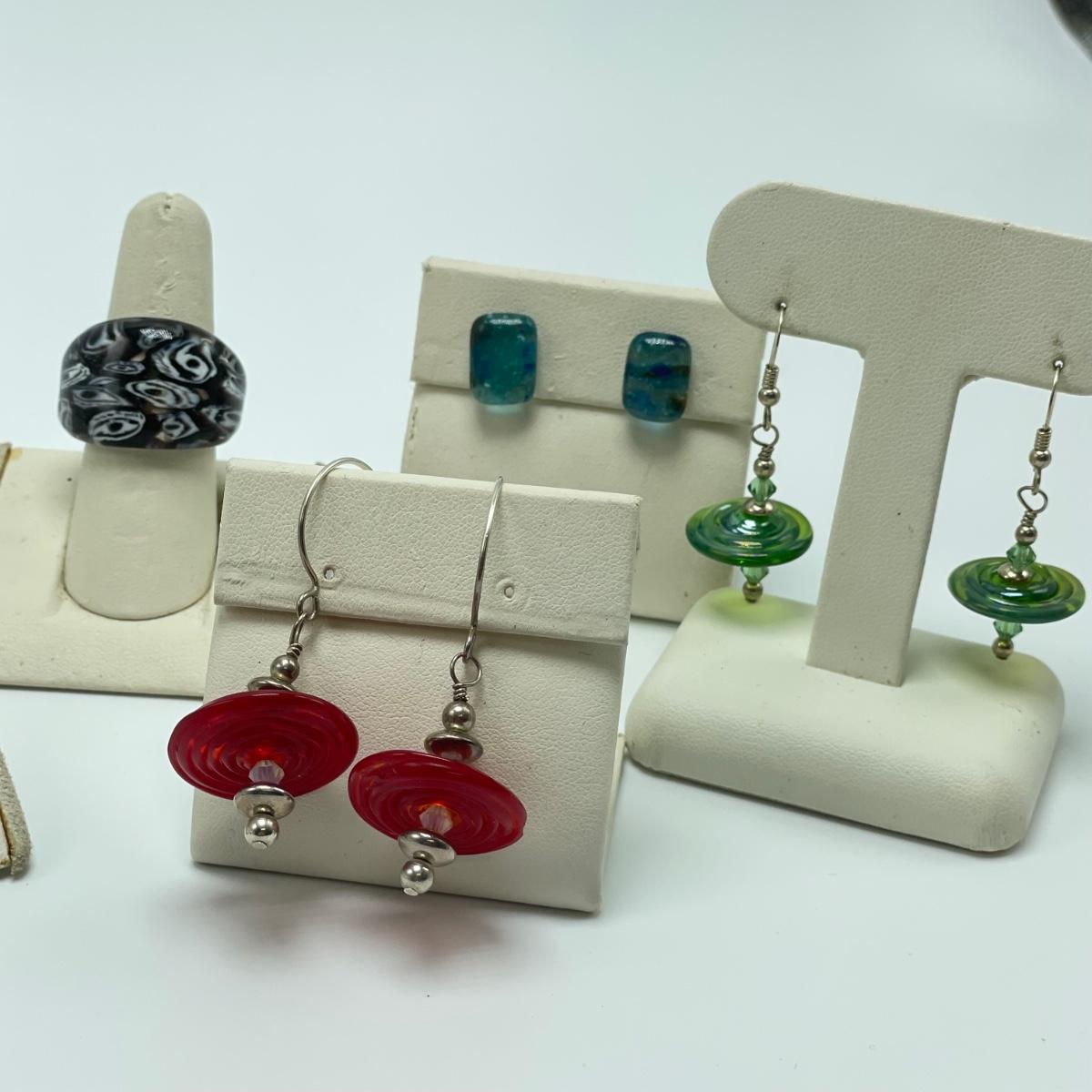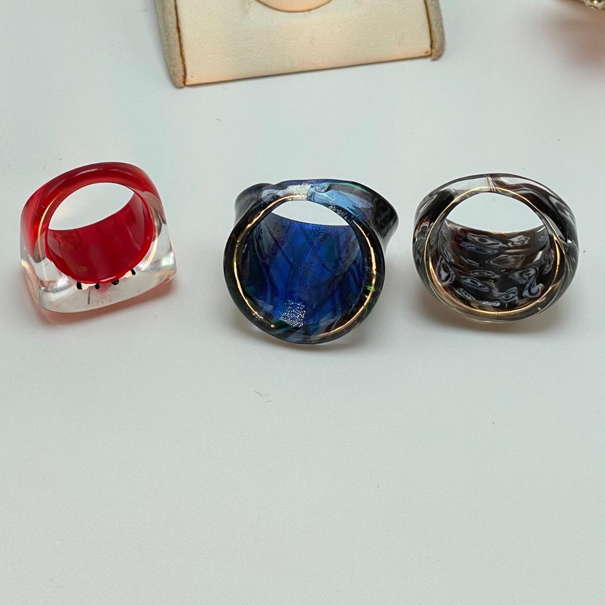Fun jellyfish pendant and earring set with four pairs of earrings and three rings. The red disc earrings have a small chip. All jewelry appears to be glass or quality artisan resin. See images. All sales are final. No returns or refunds. Please bid accordingly.