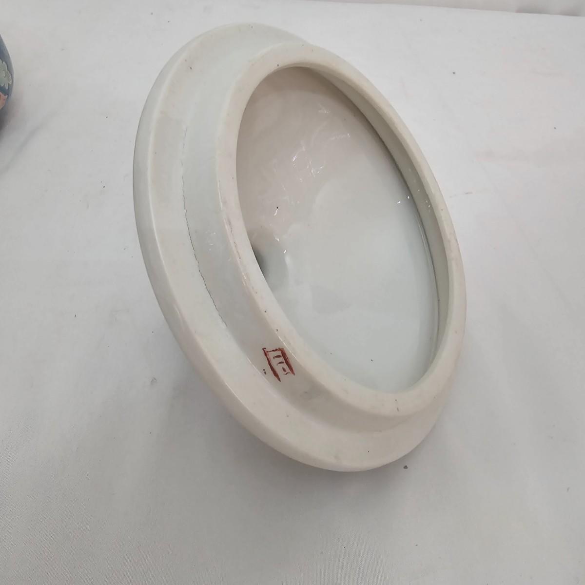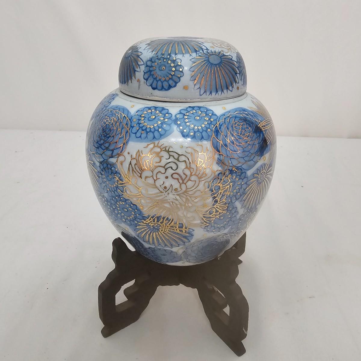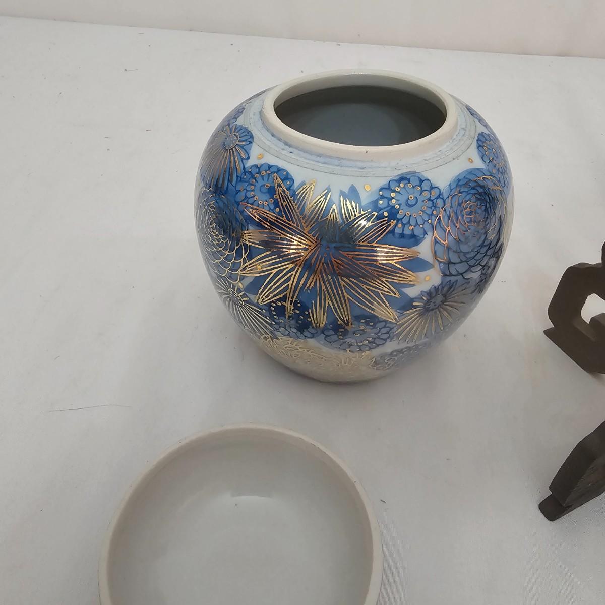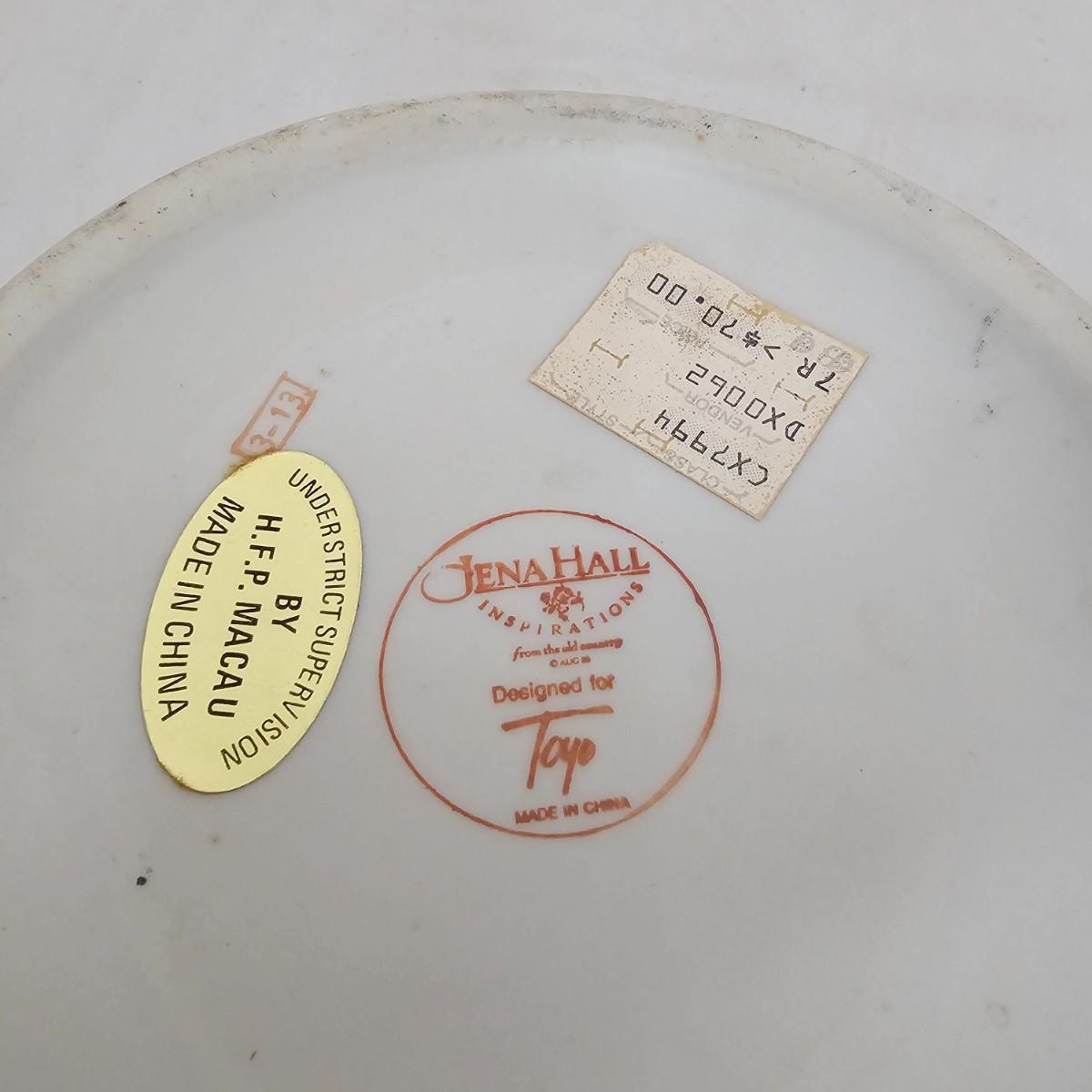 Beautiful turquoise color patterned bowl with lid by Jena Hall, made for Toyo. Bowl measures 7.5"D x 6"H. Gold accented ginger jar and stand are from Japan, measure 4.25"D x 7"H. Flowered plate is 8'SQ. See photos for details. Shipping available.