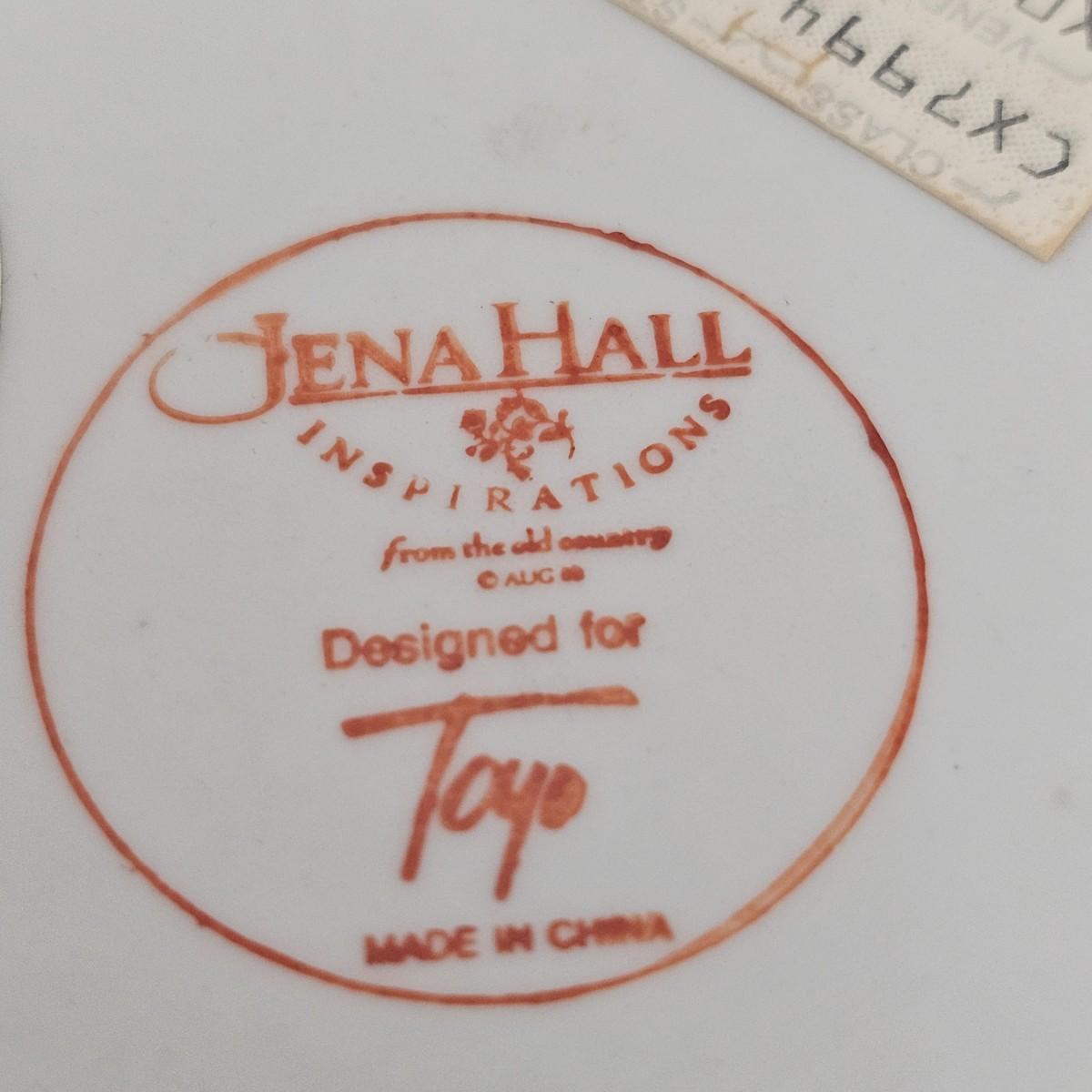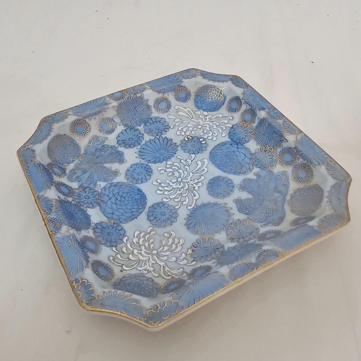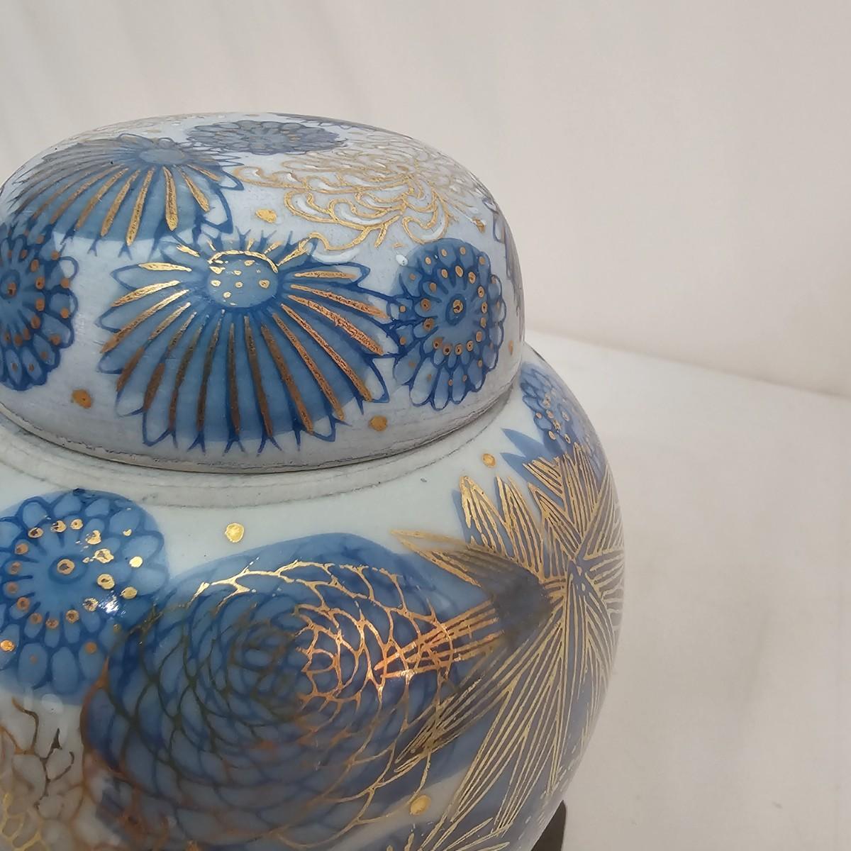 Beautiful turquoise color patterned bowl with lid by Jena Hall, made for Toyo. Bowl measures 7.5"D x 6"H. Gold accented ginger jar and stand are from Japan, measure 4.25"D x 7"H. Flowered plate is 8'SQ. See photos for details. Shipping available.