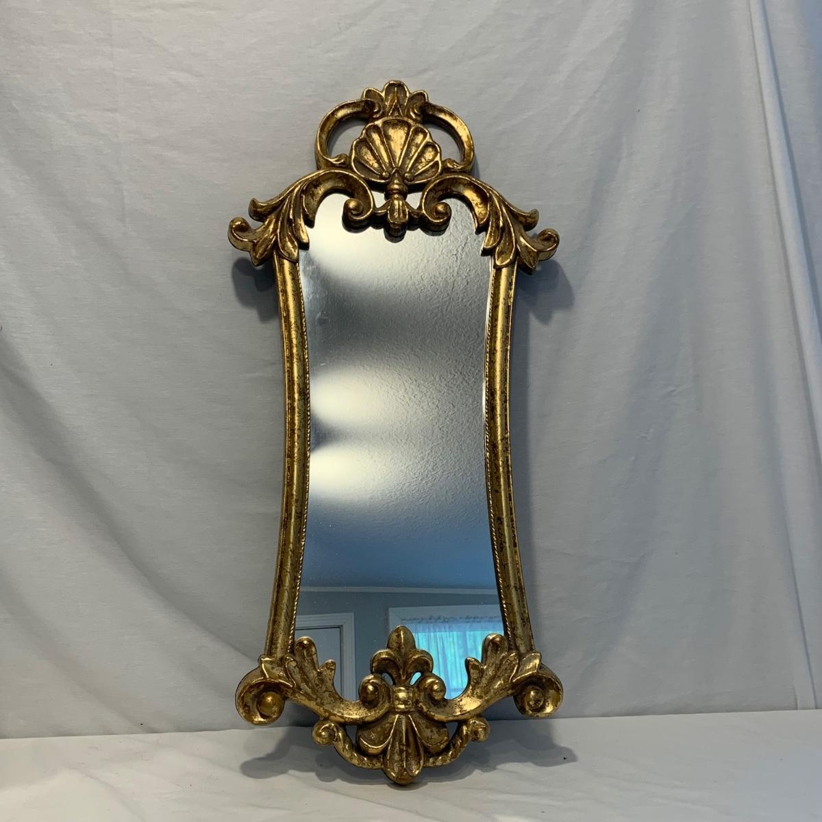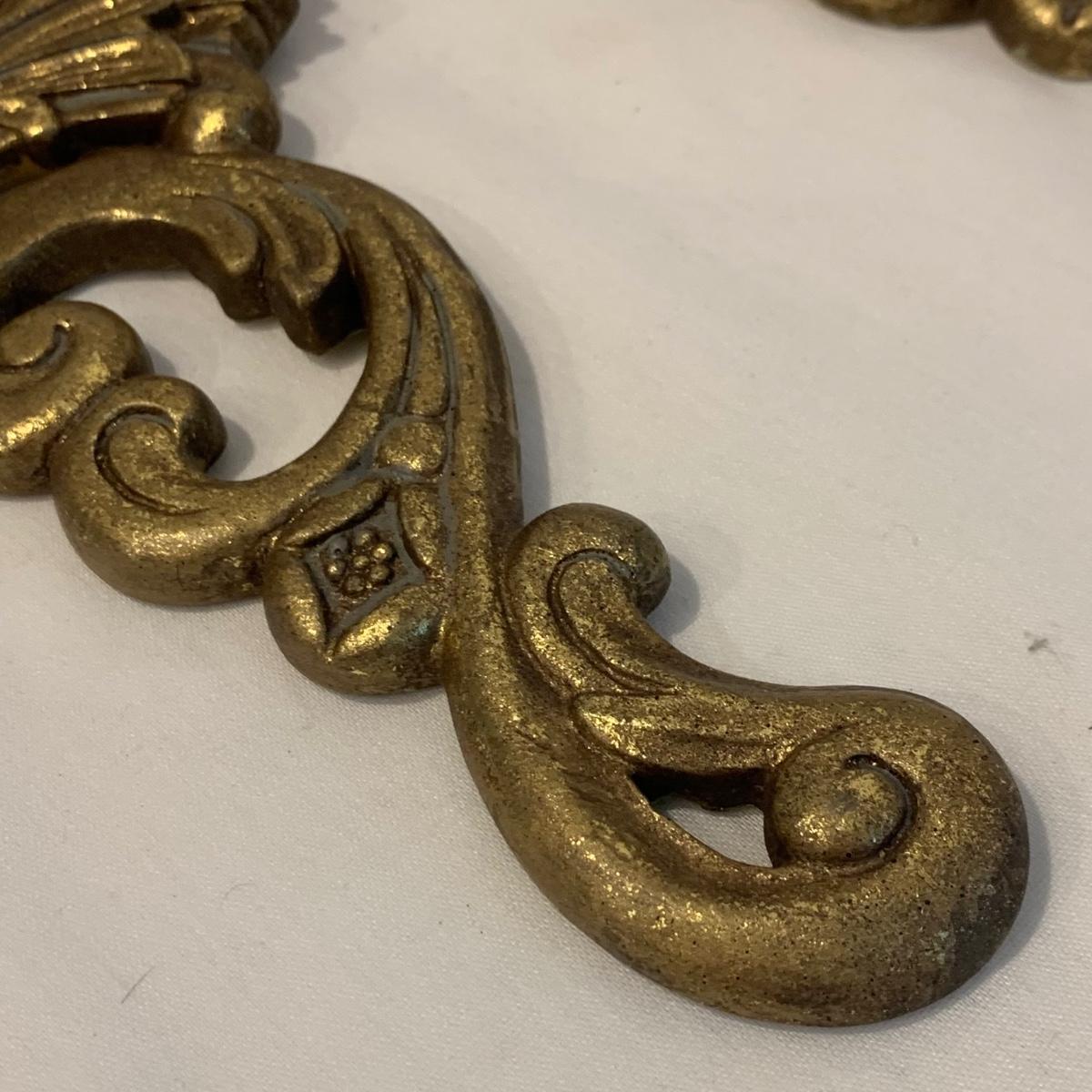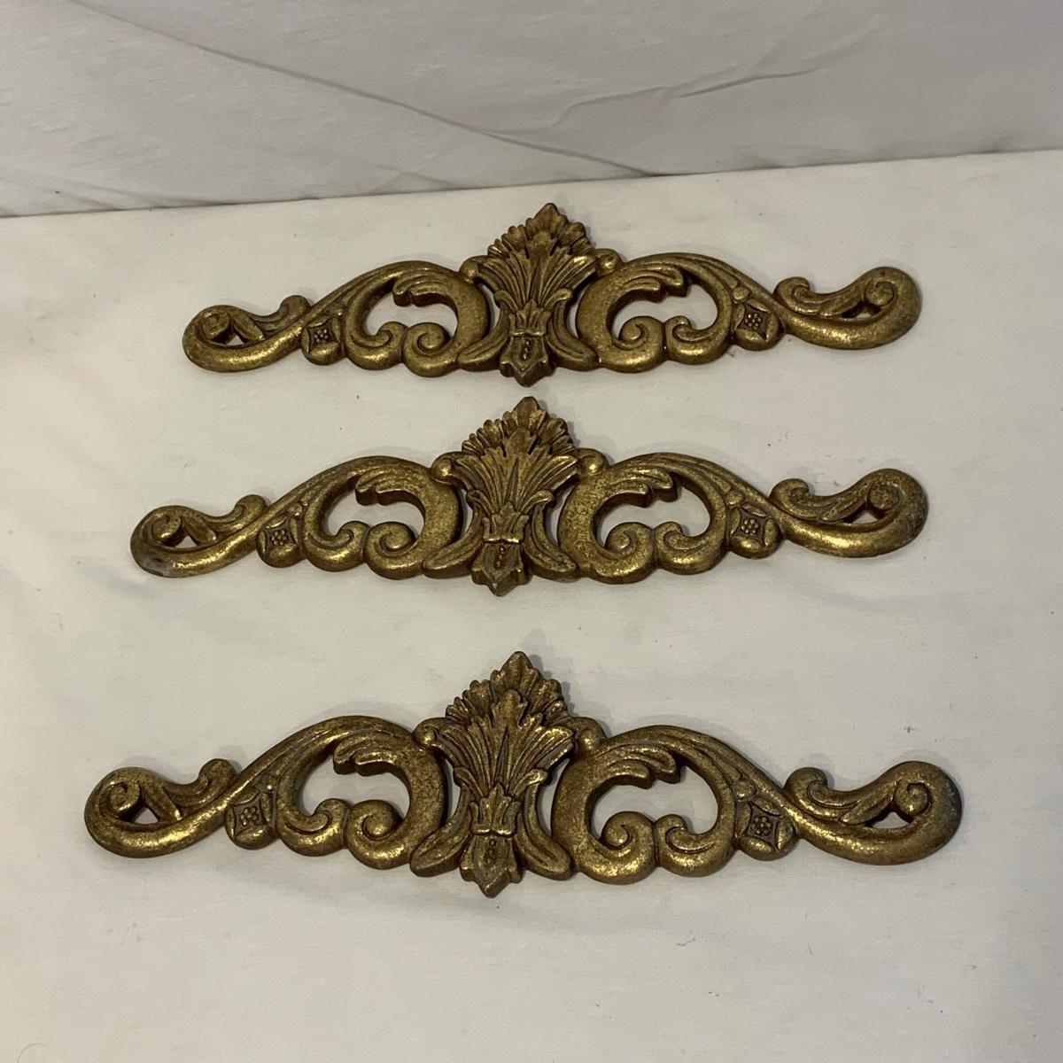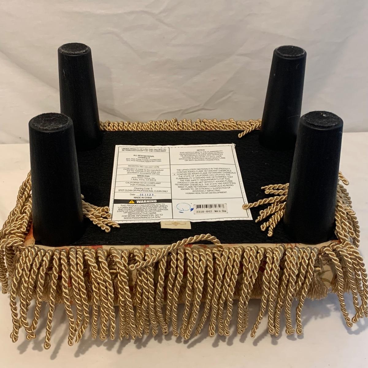 Cushioned upholstered footstool by Jennifer Taylor. Legs are a plastic material that are hidden behind tassels. Footstool measures 15” x 12” x 10.5”H. Also included is an ornately framed mirror. It is approximately 15.5” x 32”. The frame feels like it is plastic. There is a small mark on the top right corner of the mirror and the backing is separating from the mirror in some places. Three gold colored wall decor items are included as well. Material of these is unknown, perhaps a hard resin or wood.
