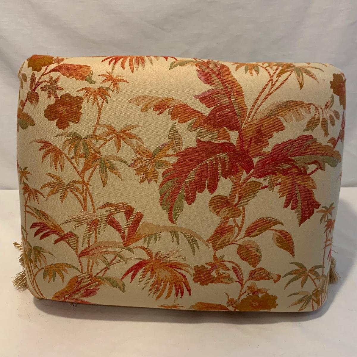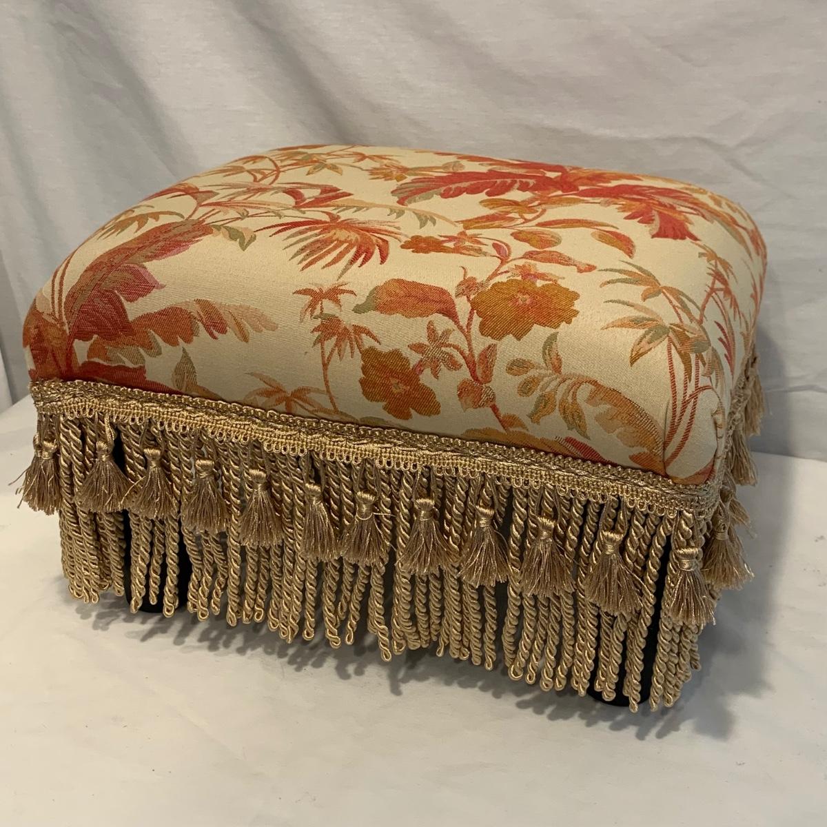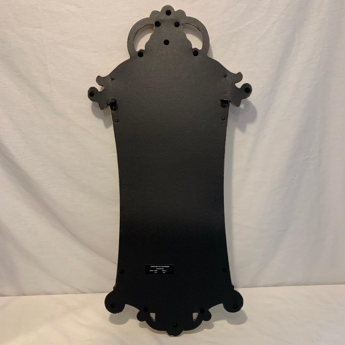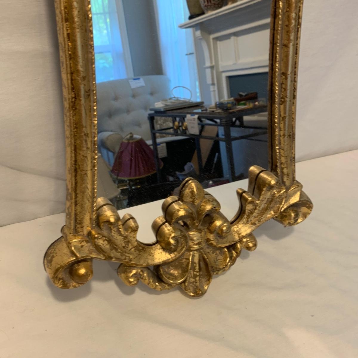 Cushioned upholstered footstool by Jennifer Taylor. Legs are a plastic material that are hidden behind tassels. Footstool measures 15” x 12” x 10.5”H. Also included is an ornately framed mirror. It is approximately 15.5” x 32”. The frame feels like it is plastic. There is a small mark on the top right corner of the mirror and the backing is separating from the mirror in some places. Three gold colored wall decor items are included as well. Material of these is unknown, perhaps a hard resin or wood.