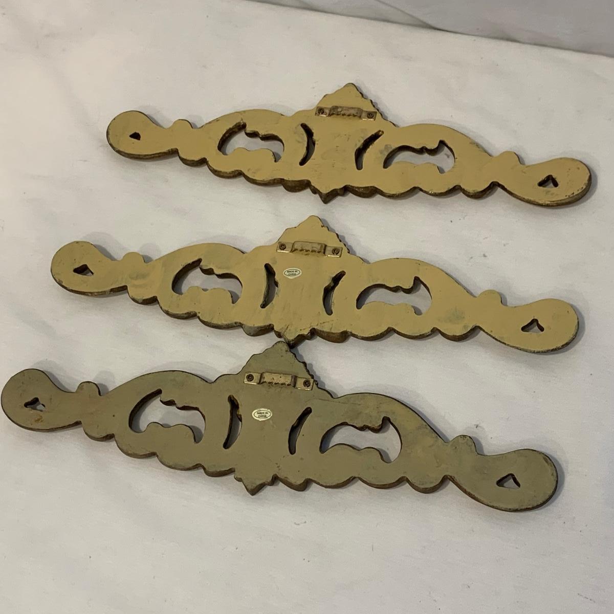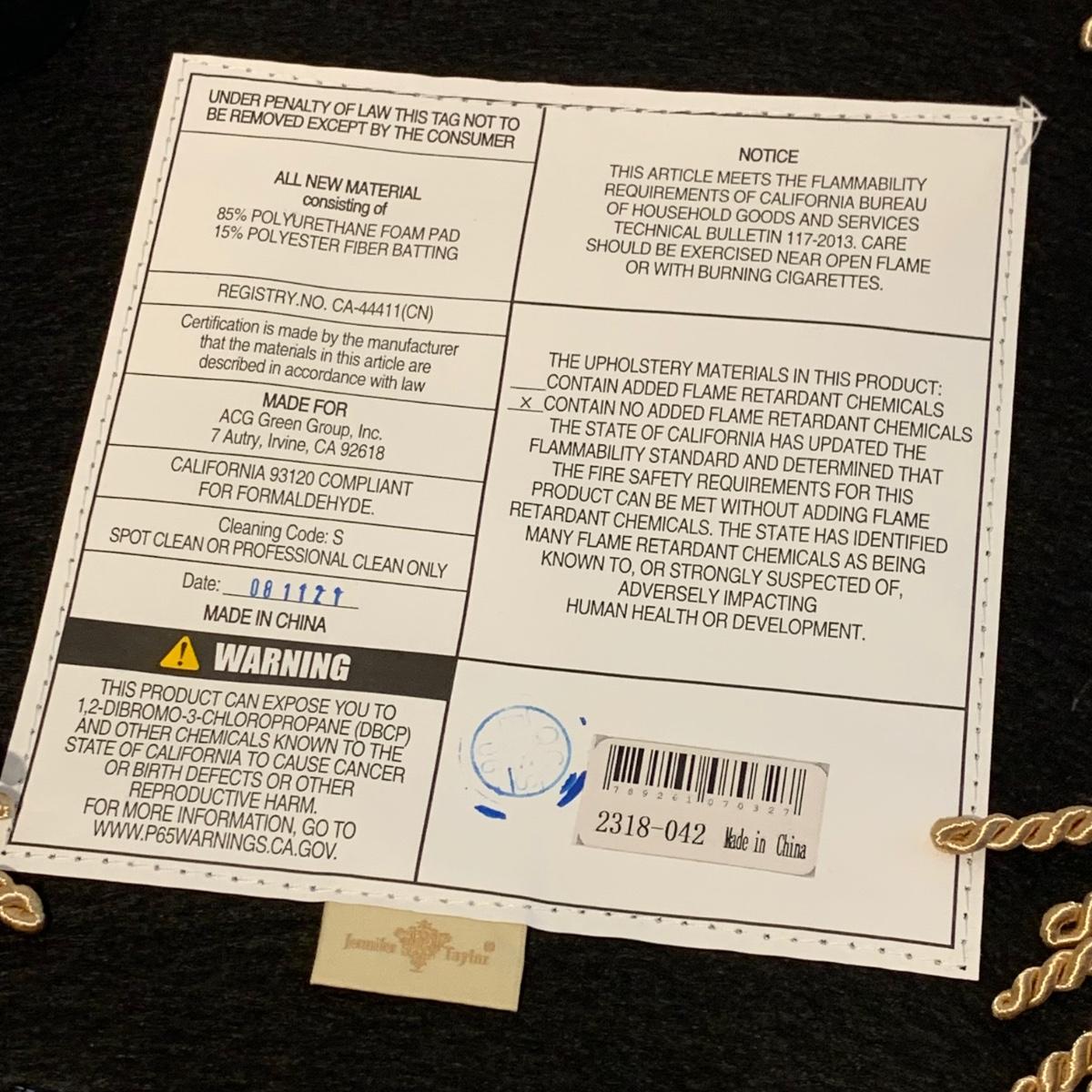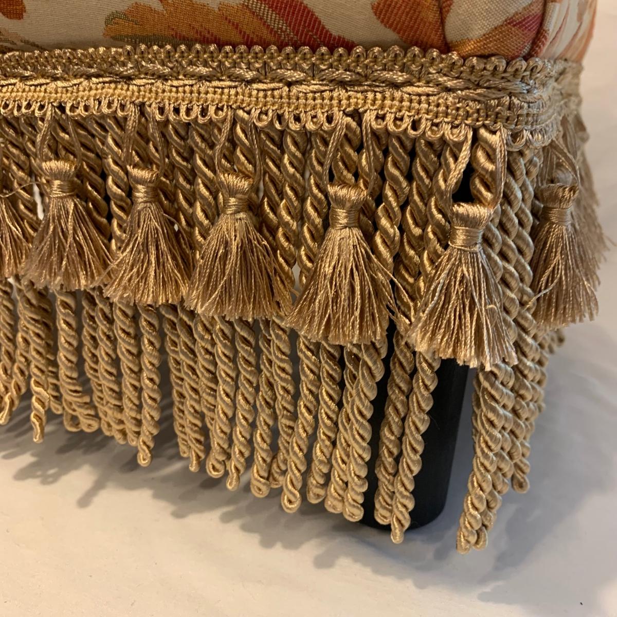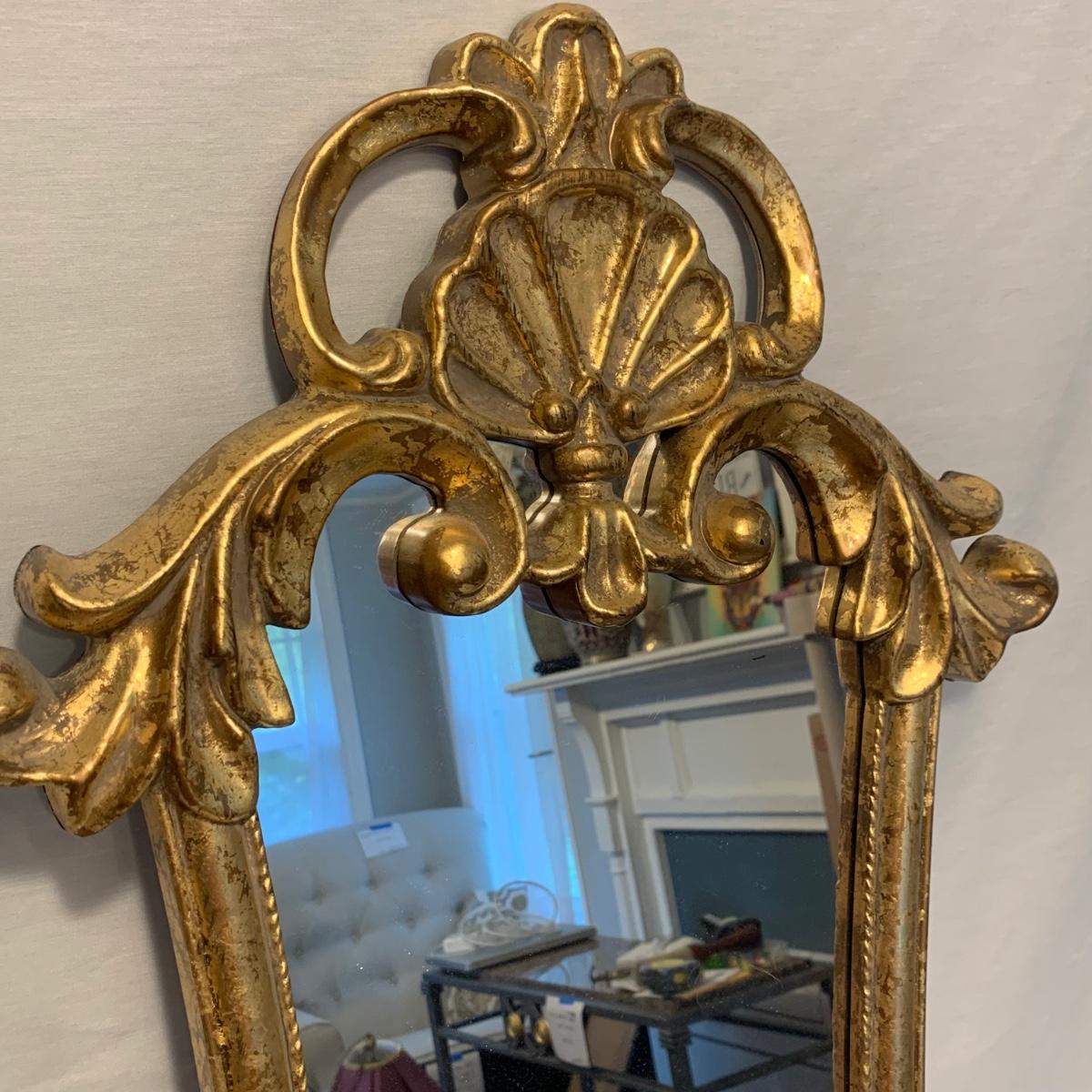 Cushioned upholstered footstool by Jennifer Taylor. Legs are a plastic material that are hidden behind tassels. Footstool measures 15” x 12” x 10.5”H. Also included is an ornately framed mirror. It is approximately 15.5” x 32”. The frame feels like it is plastic. There is a small mark on the top right corner of the mirror and the backing is separating from the mirror in some places. Three gold colored wall decor items are included as well. Material of these is unknown, perhaps a hard resin or wood.