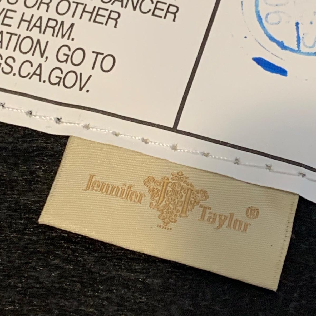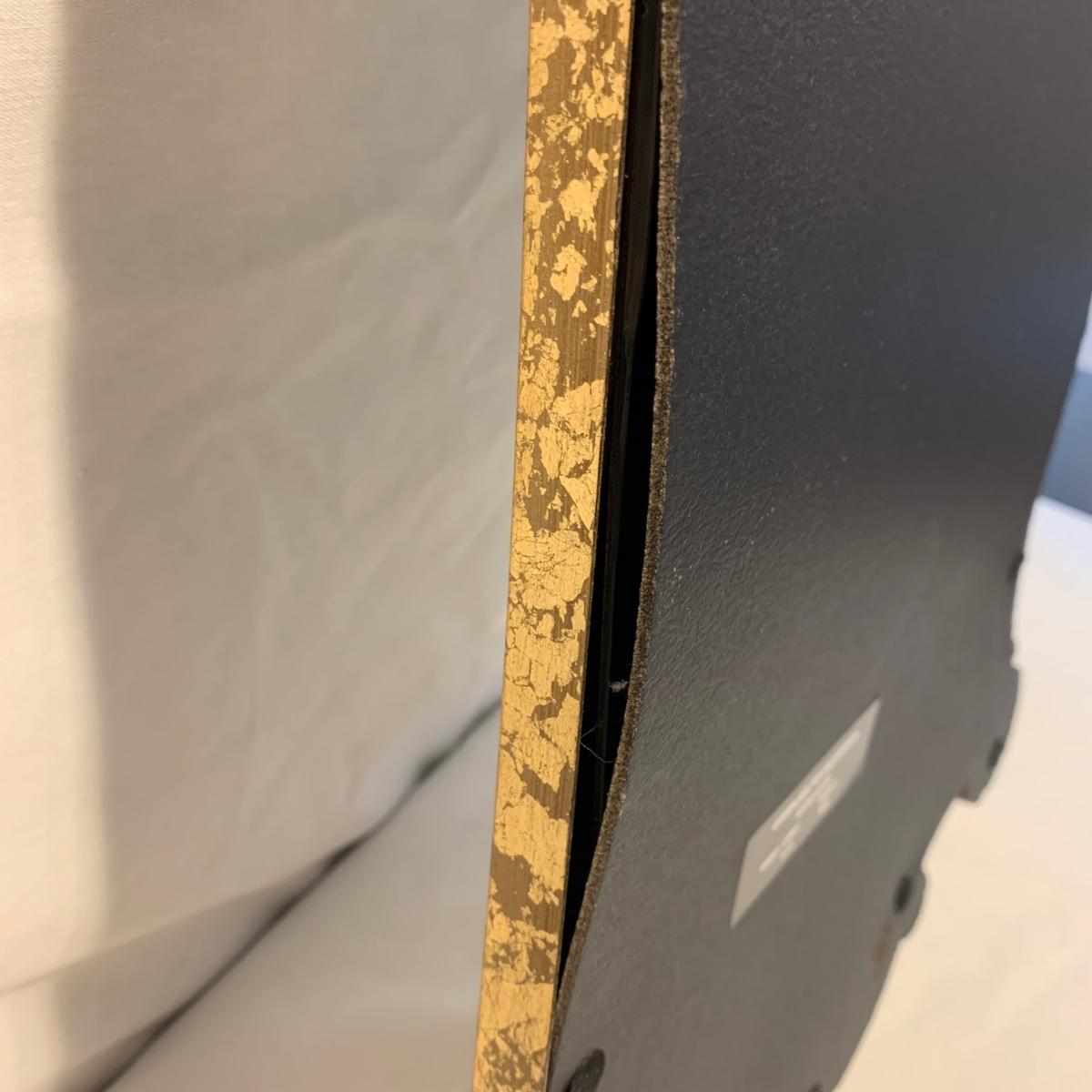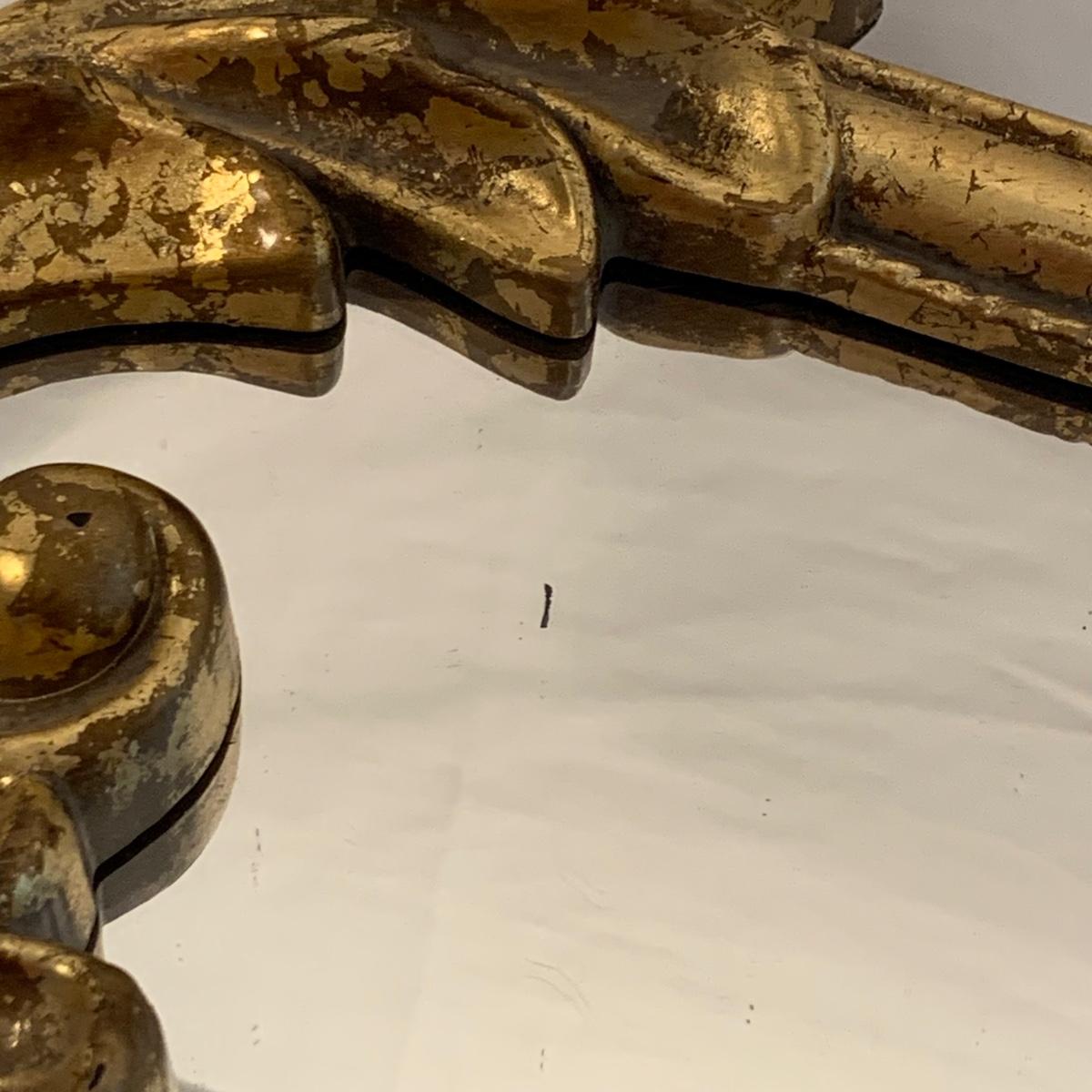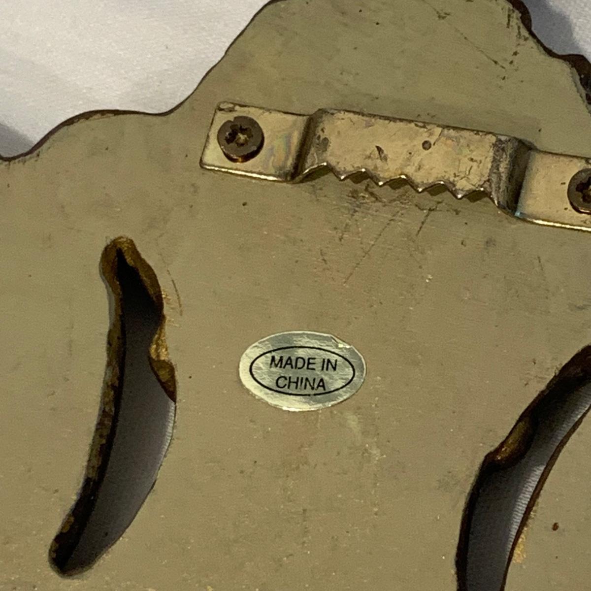 Cushioned upholstered footstool by Jennifer Taylor. Legs are a plastic material that are hidden behind tassels. Footstool measures 15” x 12” x 10.5”H. Also included is an ornately framed mirror. It is approximately 15.5” x 32”. The frame feels like it is plastic. There is a small mark on the top right corner of the mirror and the backing is separating from the mirror in some places. Three gold colored wall decor items are included as well. Material of these is unknown, perhaps a hard resin or wood.