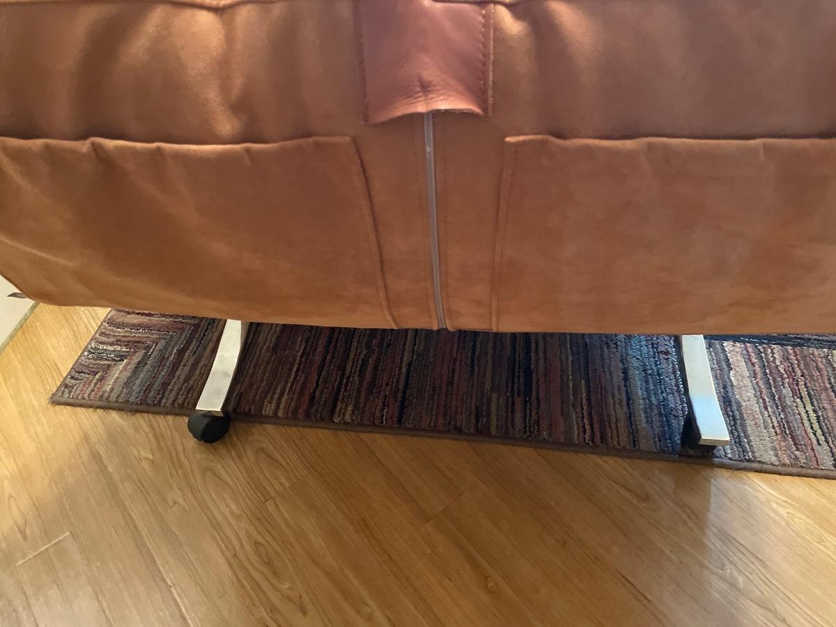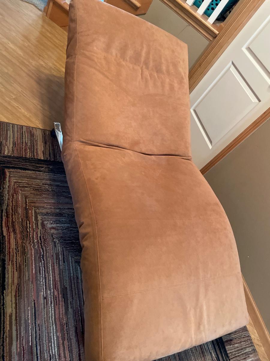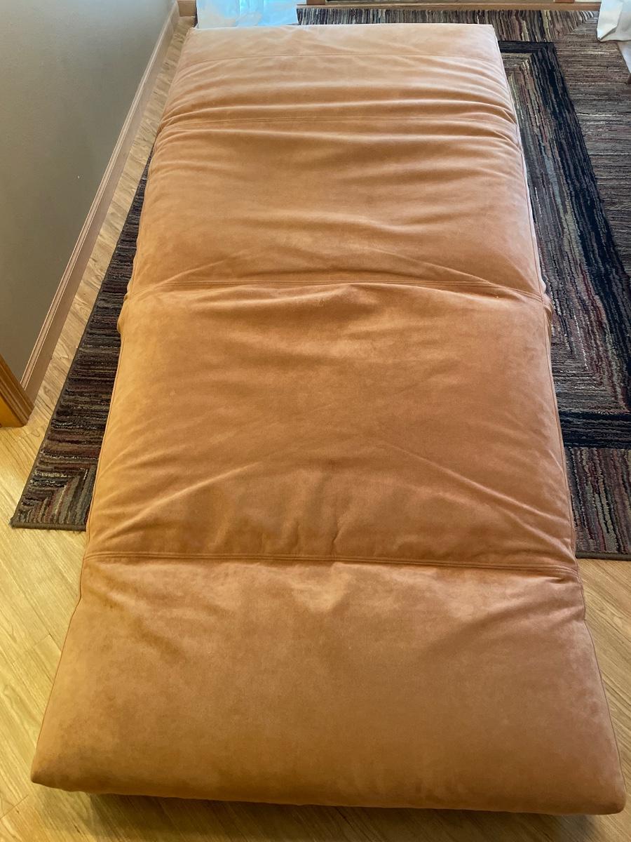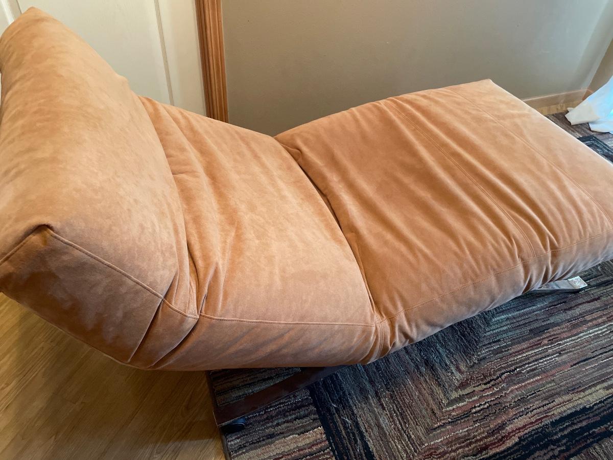 This is a very cool piece of High Quality Designer furniture from Eilersen. Soft salmon pink padding and silver tone base with wheels. Is in great shape but has a few marks in the crease. Has 2 pockets for storage and zipper to remove cover.