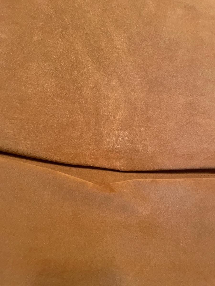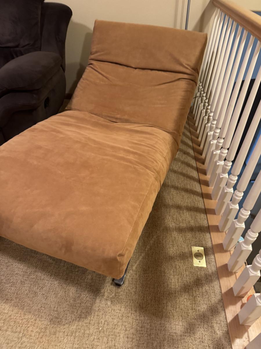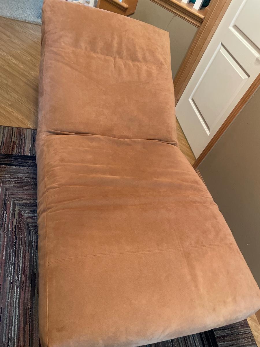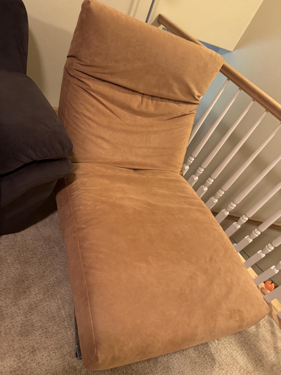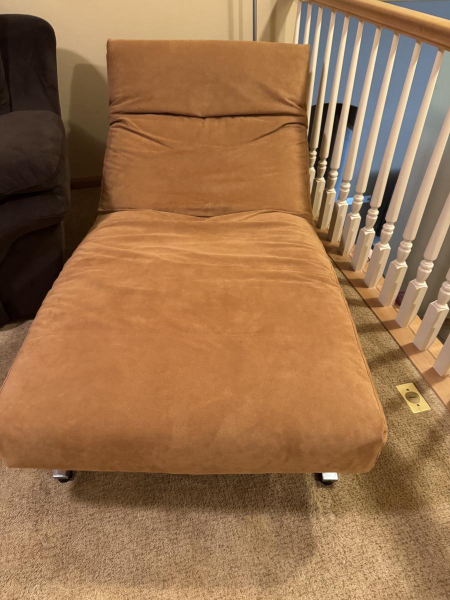This is a very cool piece of High Quality Designer furniture from Eilersen. Soft salmon pink padding and silver tone base with wheels. Is in great shape but has a few marks in the crease. Has 2 pockets for storage and zipper to remove cover.