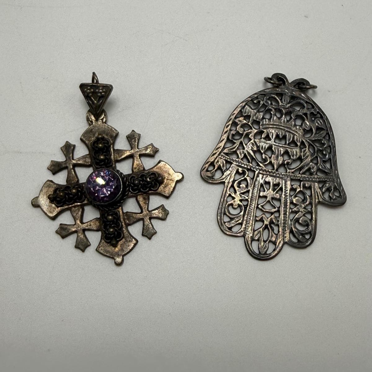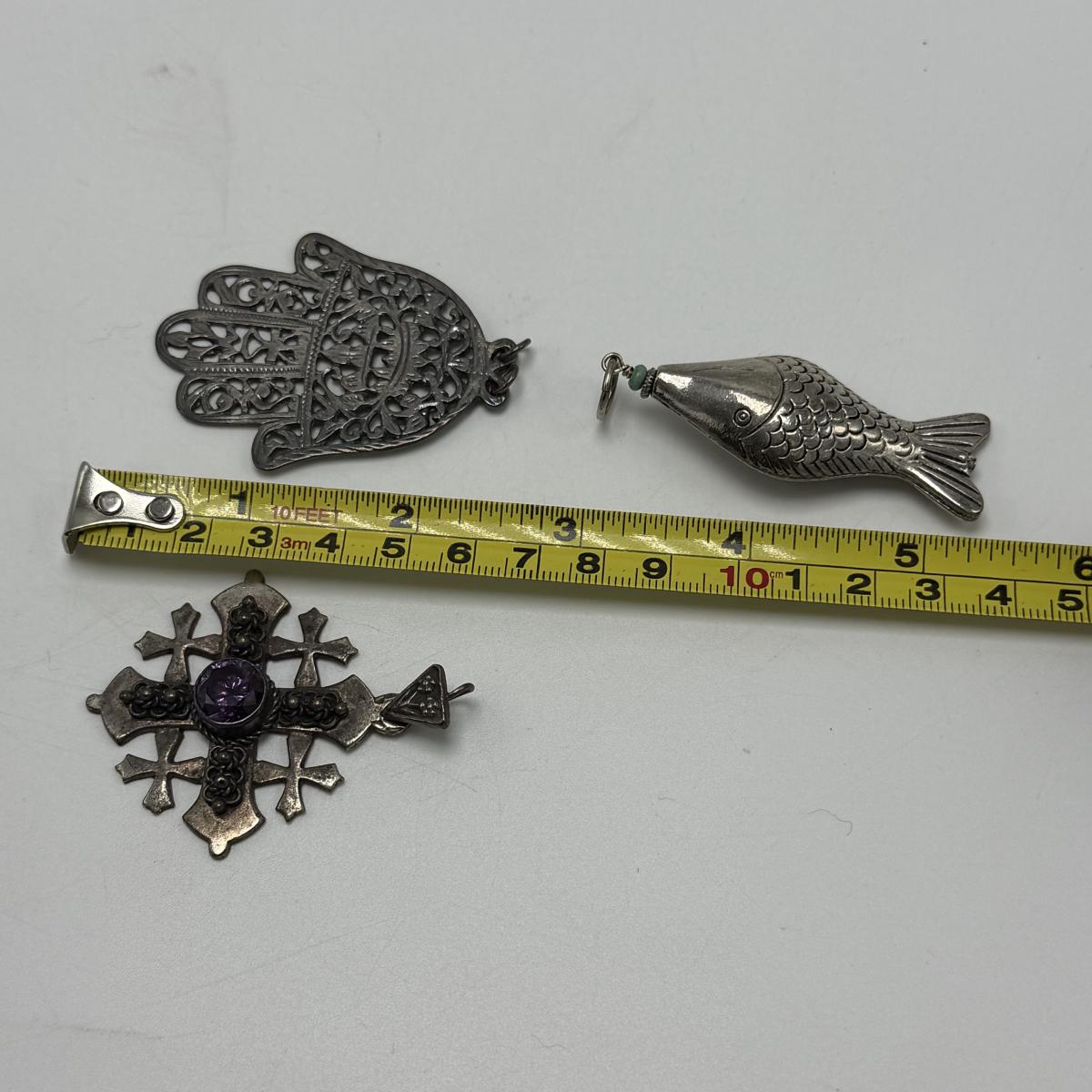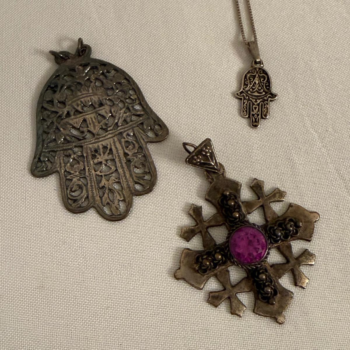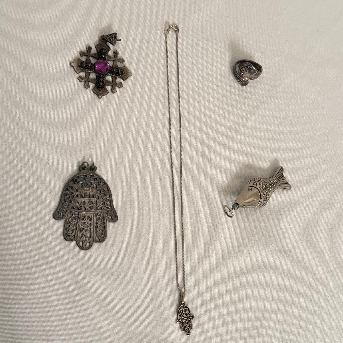 Jerusalem cross pendant has a faceted magenta colored stone in its center. The back is stamped with “Jerusalem Jordan Silver 900”. This pendant is 1.75” x 2.25”. Two Hamsa pendants are included as well. The smaller one and its 16” chain are both stamped with 925. A ring and fish pendant finish off this collection.