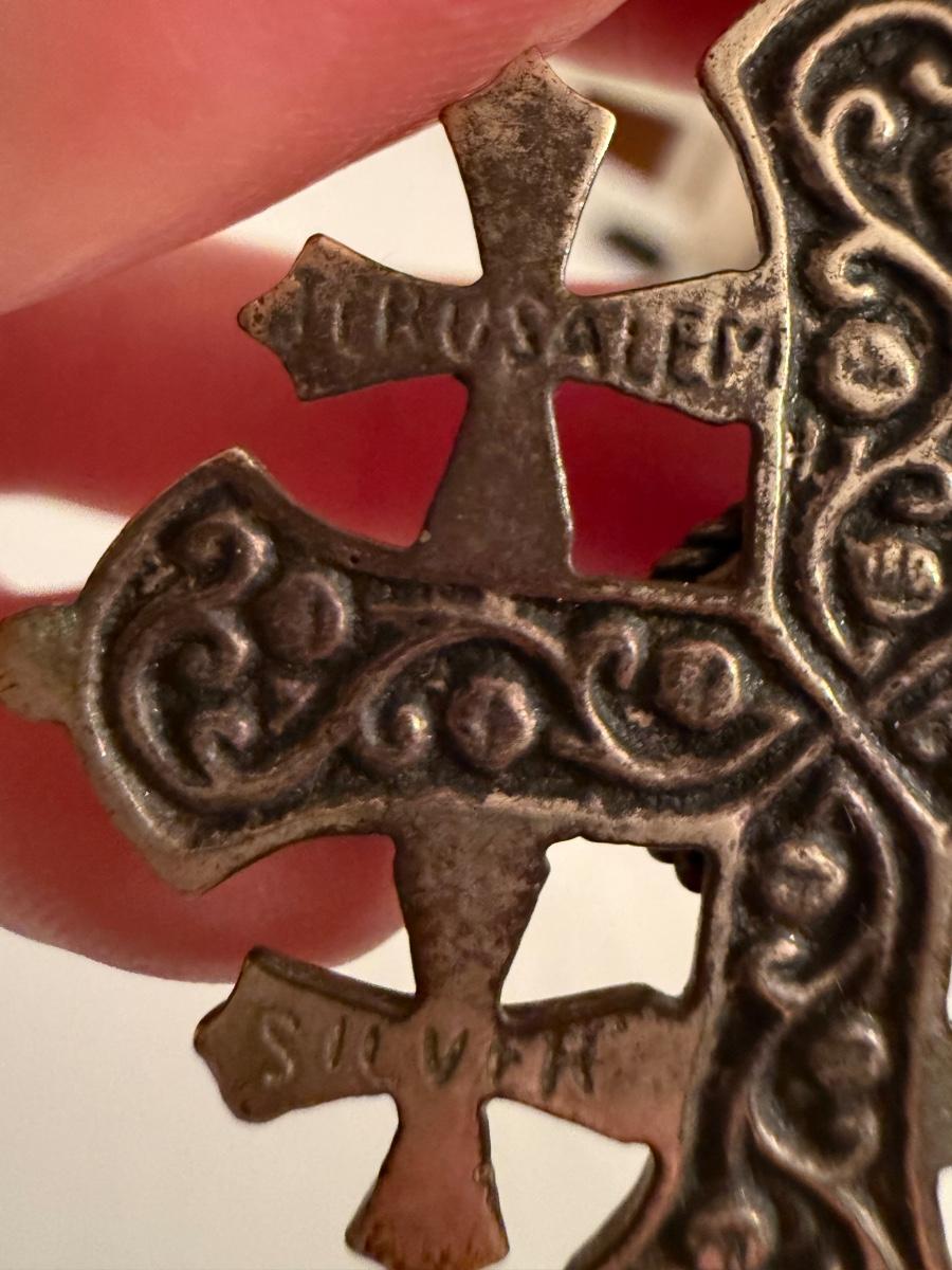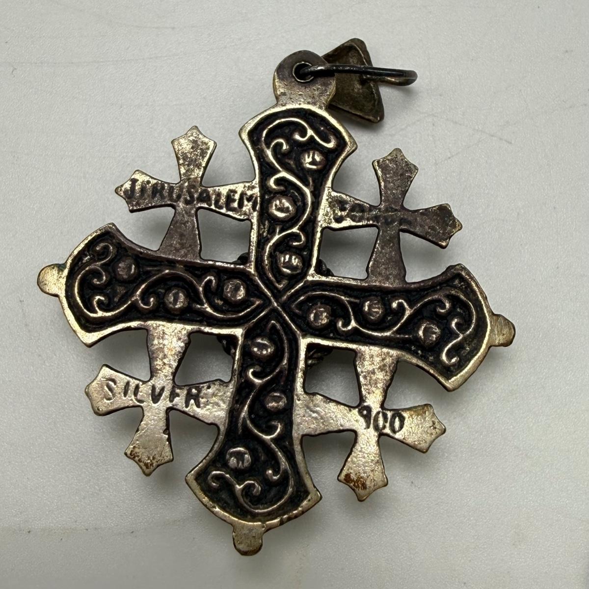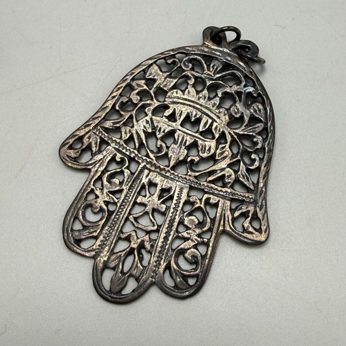 Jerusalem cross pendant has a faceted magenta colored stone in its center. The back is stamped with “Jerusalem Jordan Silver 900”. This pendant is 1.75” x 2.25”. Two Hamsa pendants are included as well. The smaller one and its 16” chain are both stamped with 925. A ring and fish pendant finish off this collection.