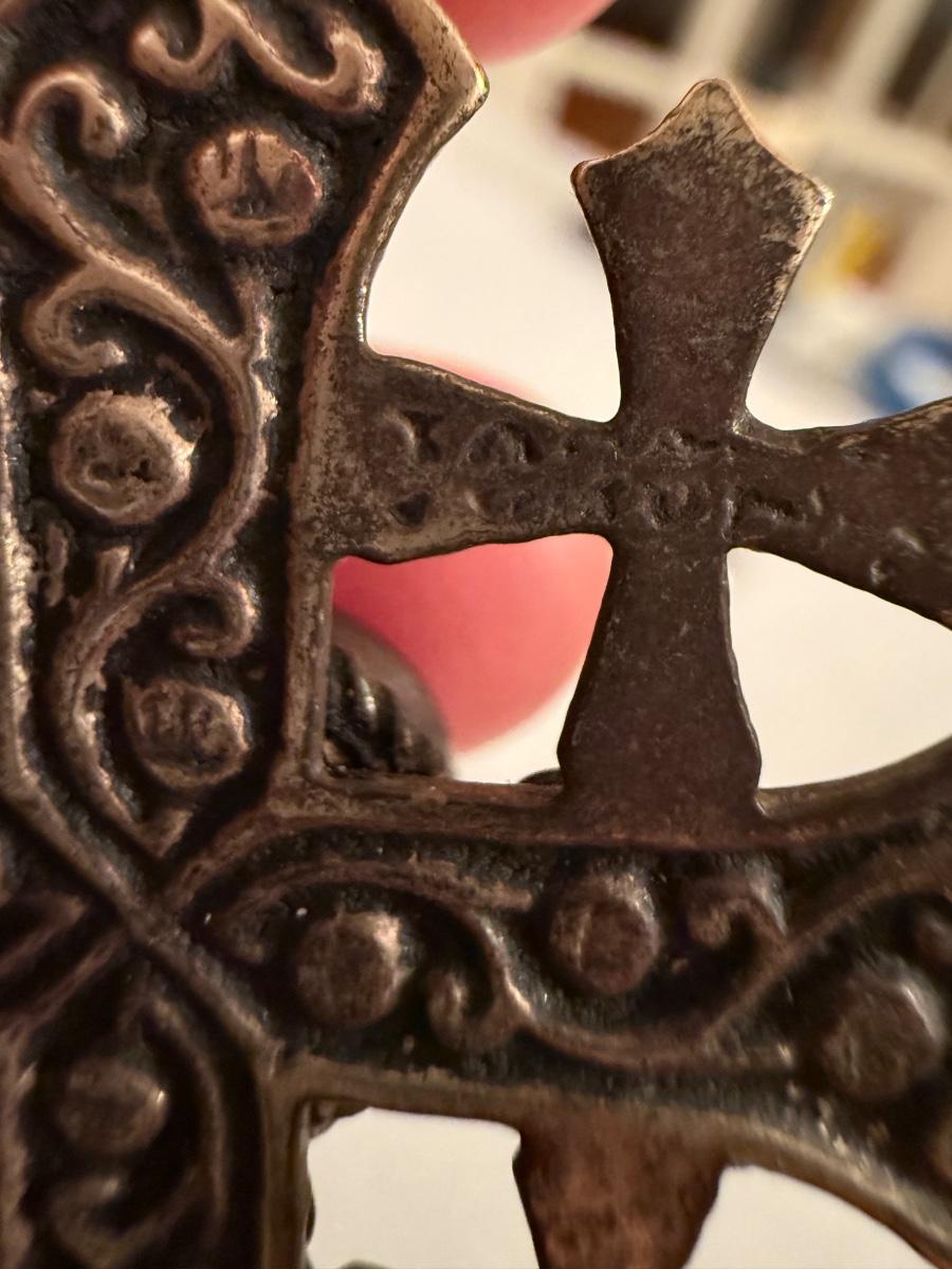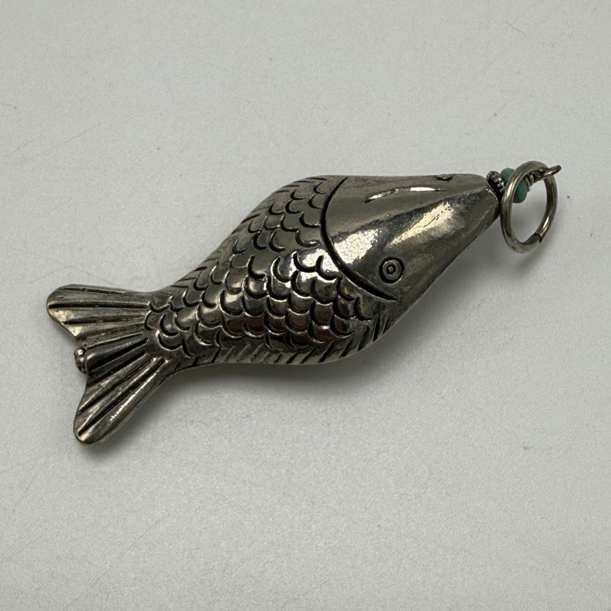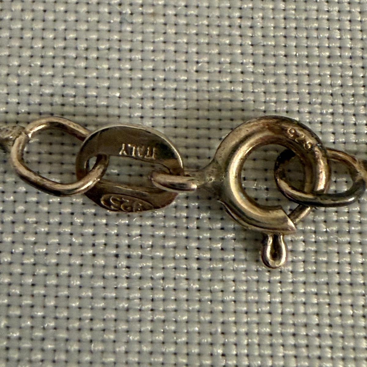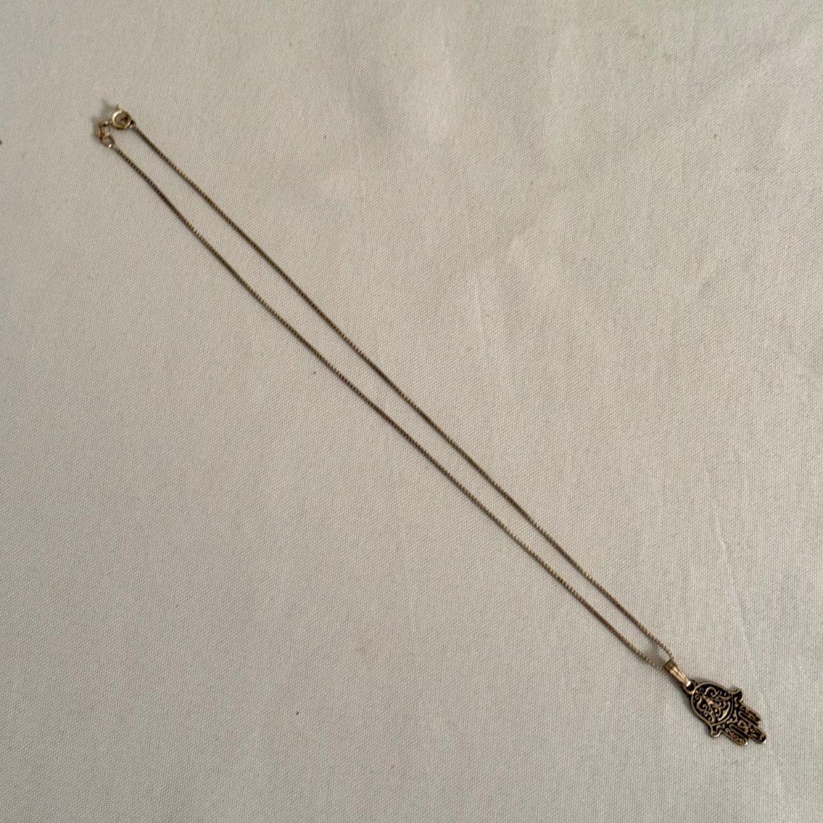 Jerusalem cross pendant has a faceted magenta colored stone in its center. The back is stamped with “Jerusalem Jordan Silver 900”. This pendant is 1.75” x 2.25”. Two Hamsa pendants are included as well. The smaller one and its 16” chain are both stamped with 925. A ring and fish pendant finish off this collection.