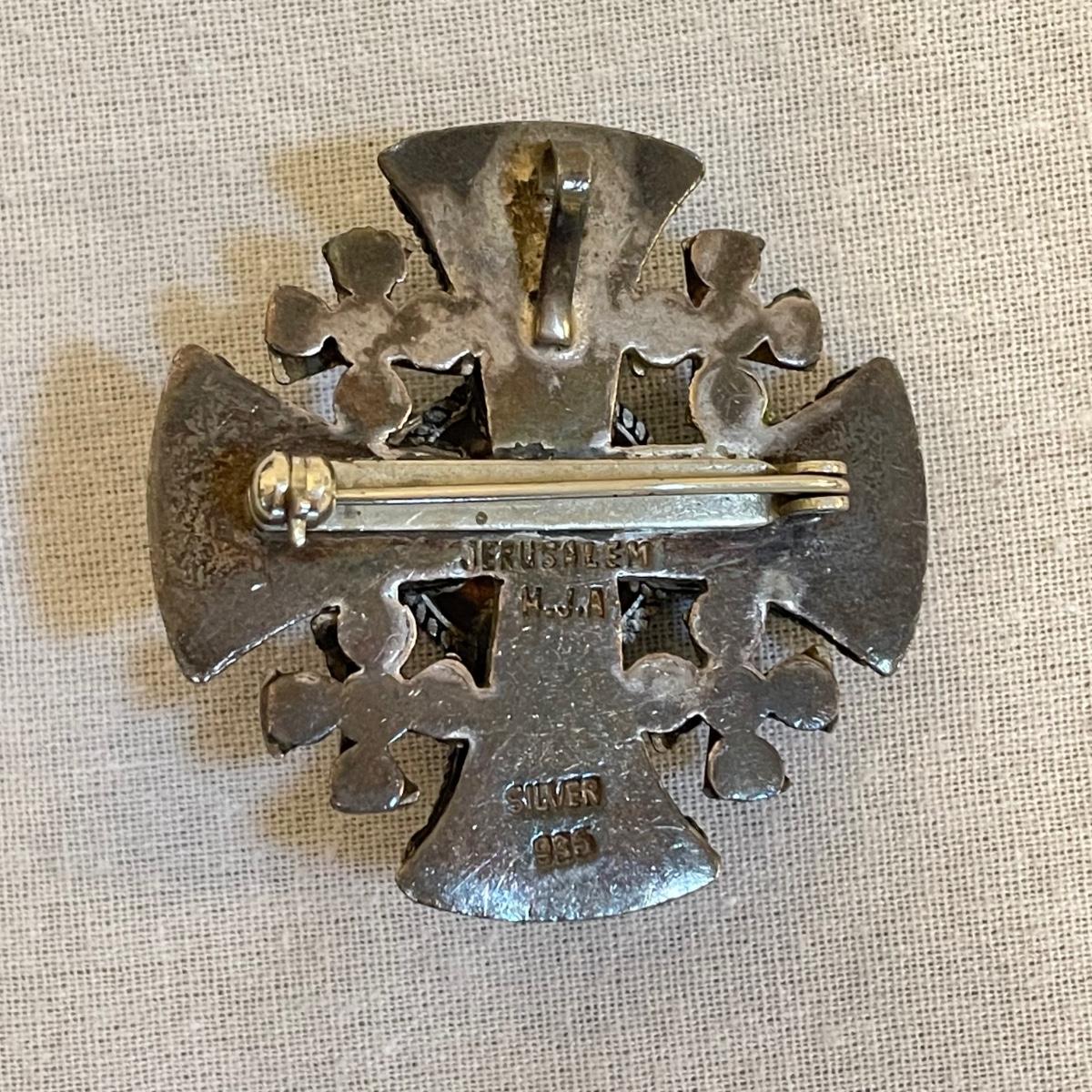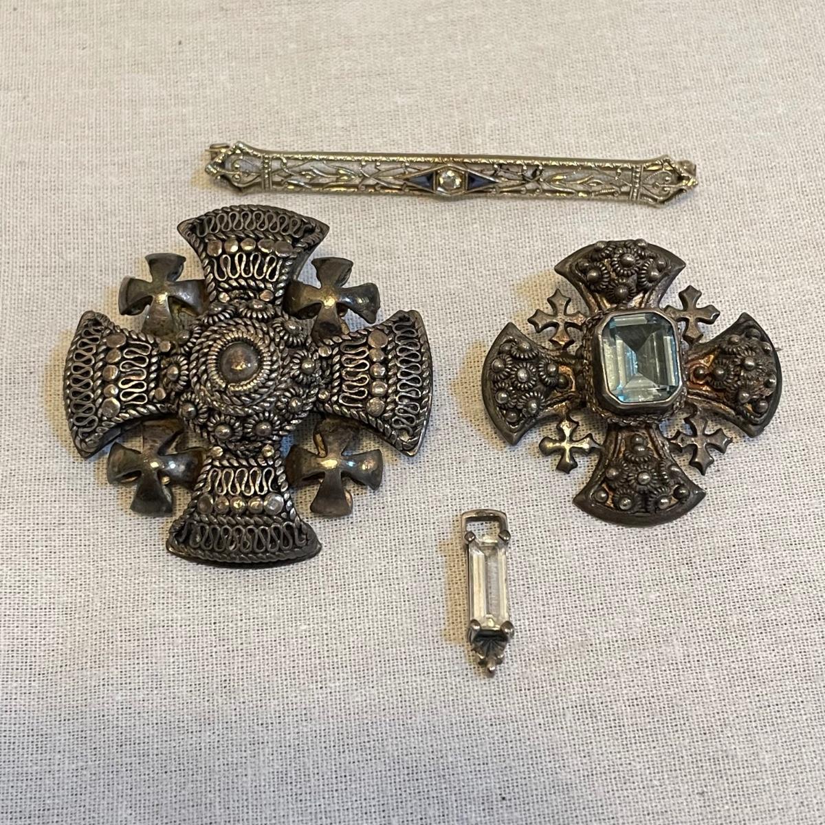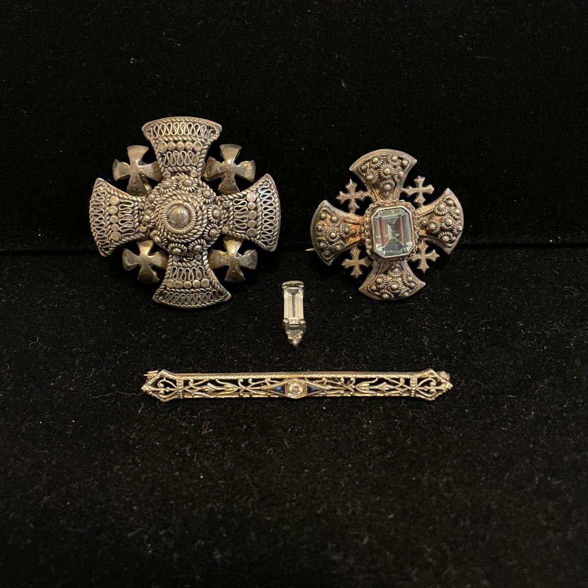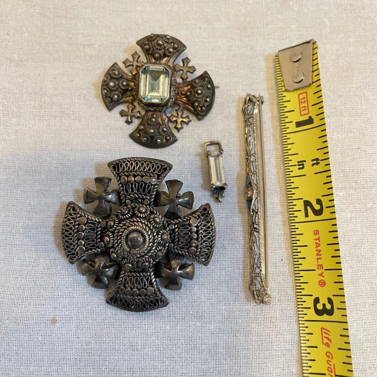 Two Jerusalem cross brooches, one with illegible silver marking and the larger one being stamped Silver 935. Also included is a petite unmarked silver and clear gemmed pendant plus a long pin with a rhinestone and onyx colored centerpiece.