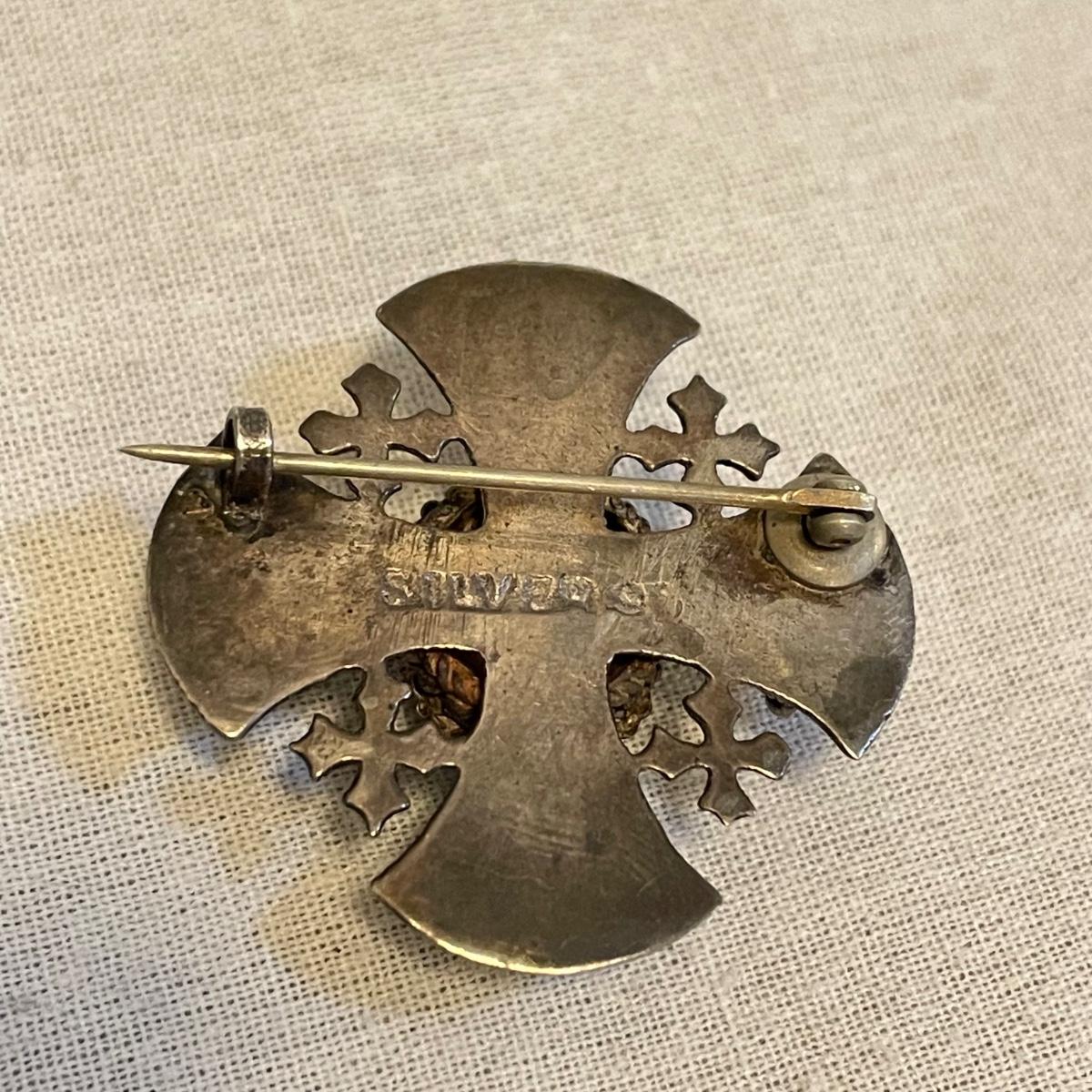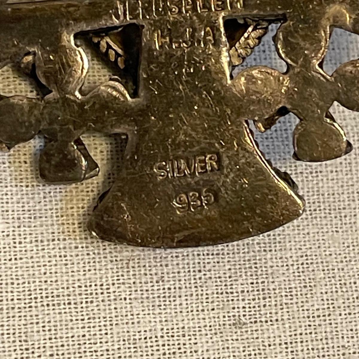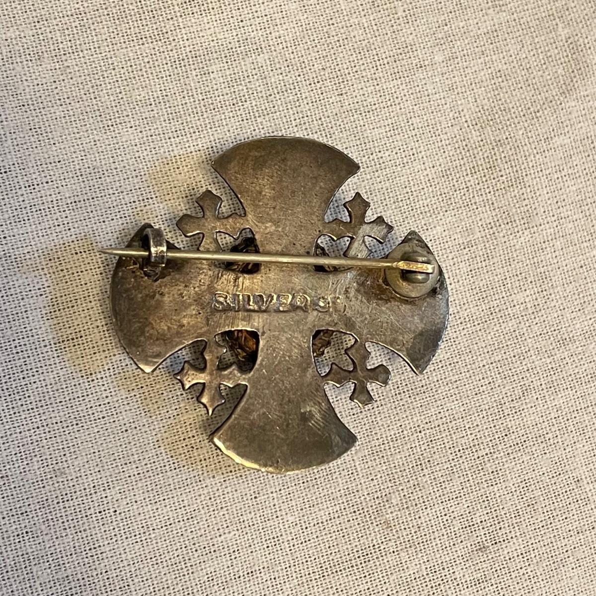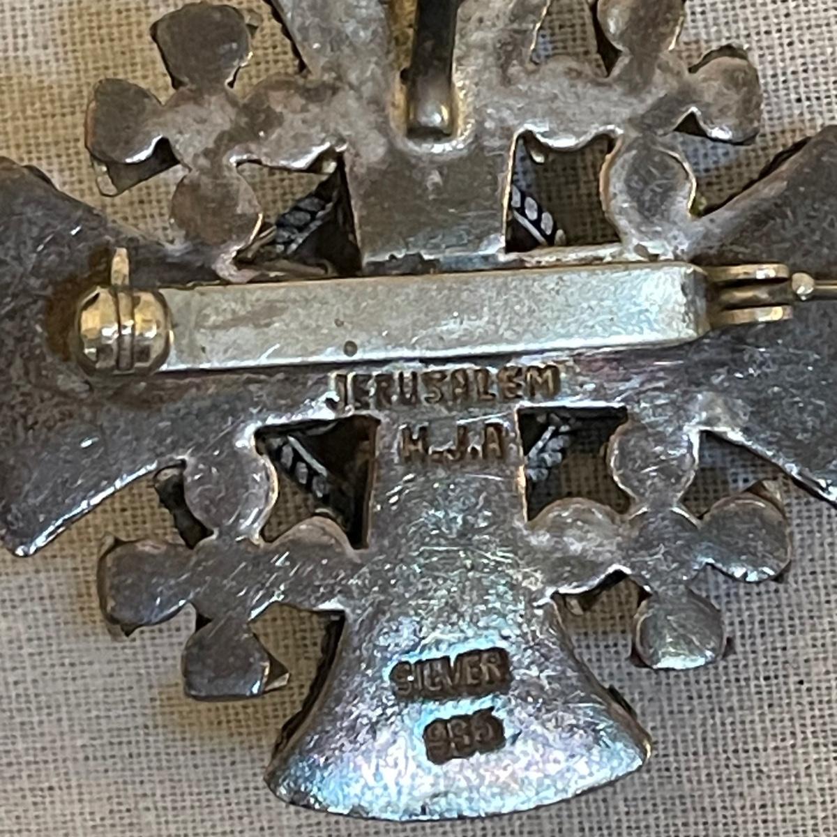 Two Jerusalem cross brooches, one with illegible silver marking and the larger one being stamped Silver 935. Also included is a petite unmarked silver and clear gemmed pendant plus a long pin with a rhinestone and onyx colored centerpiece.