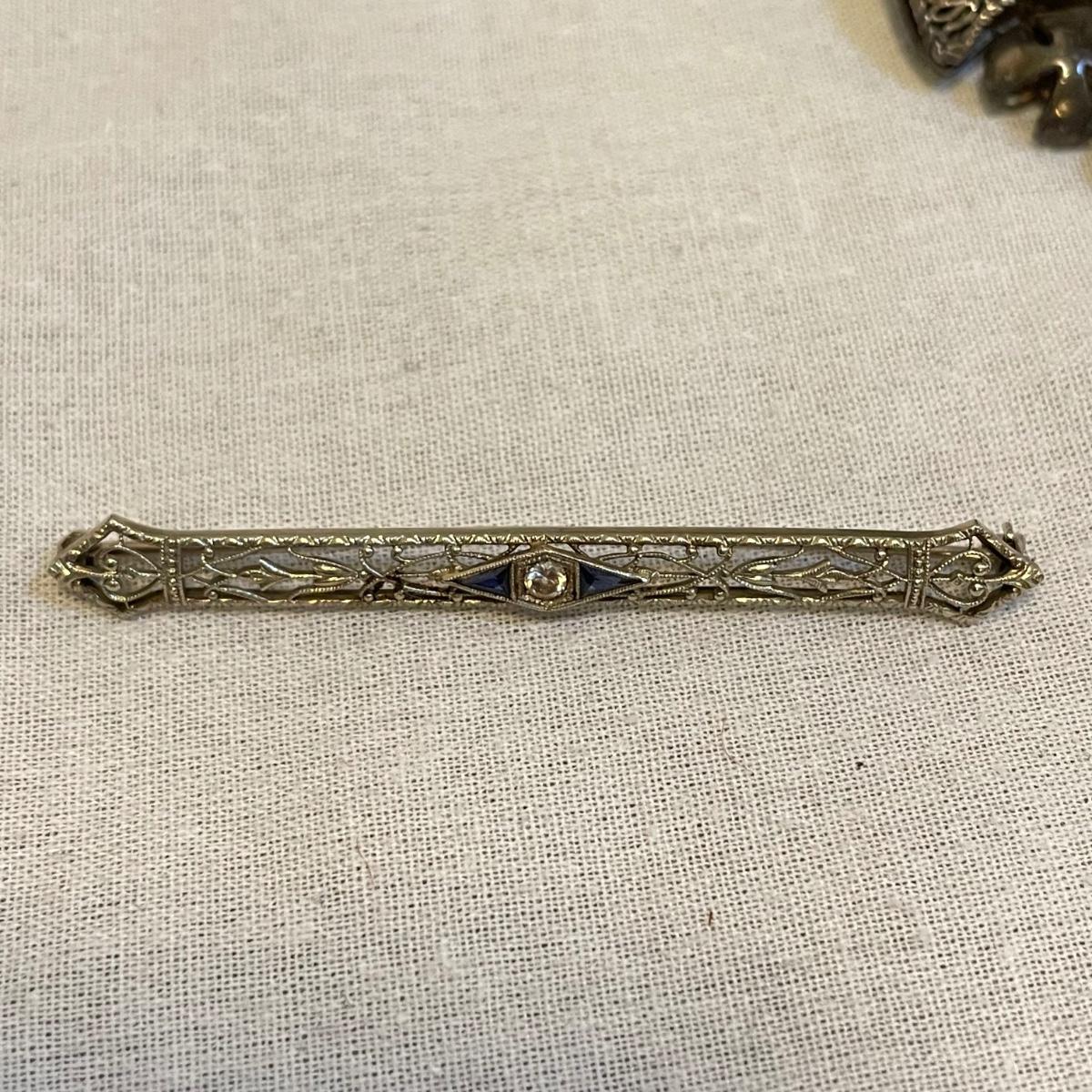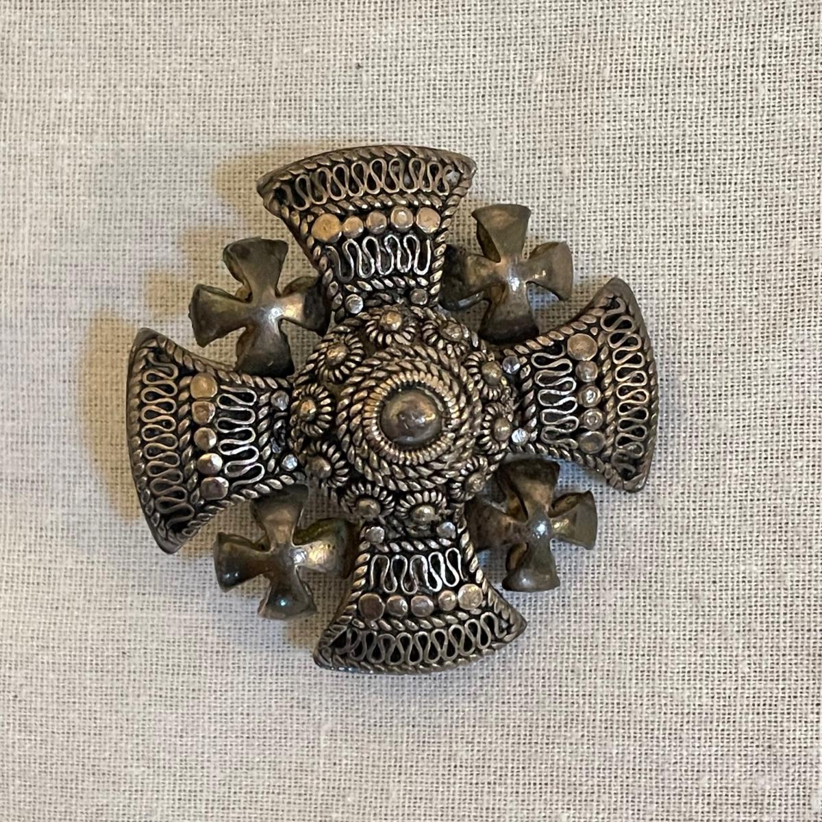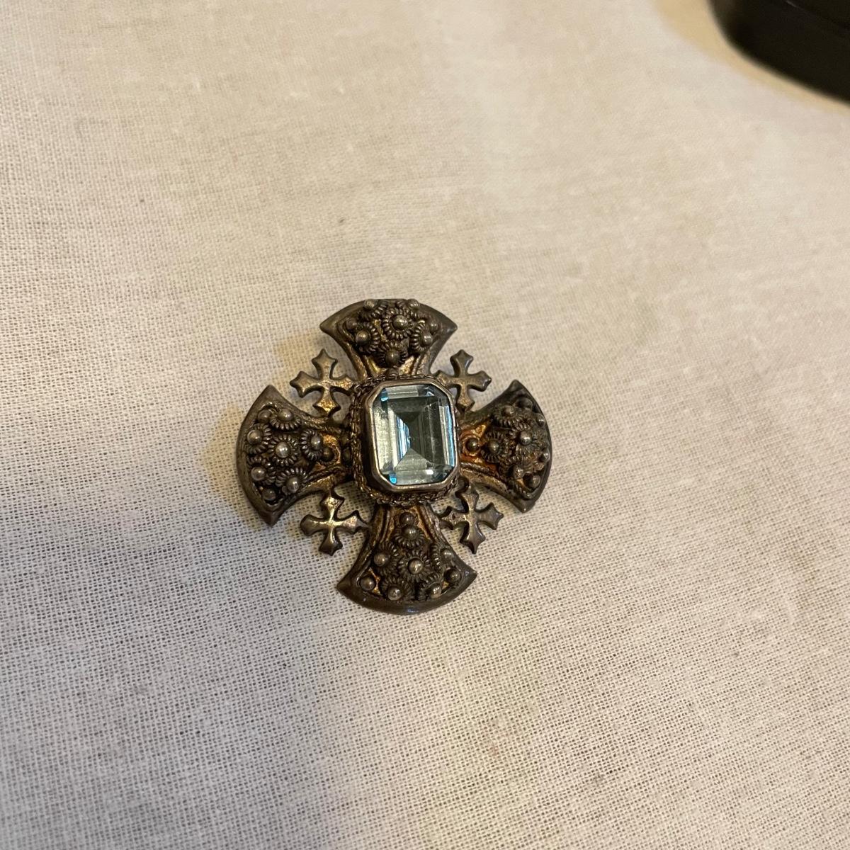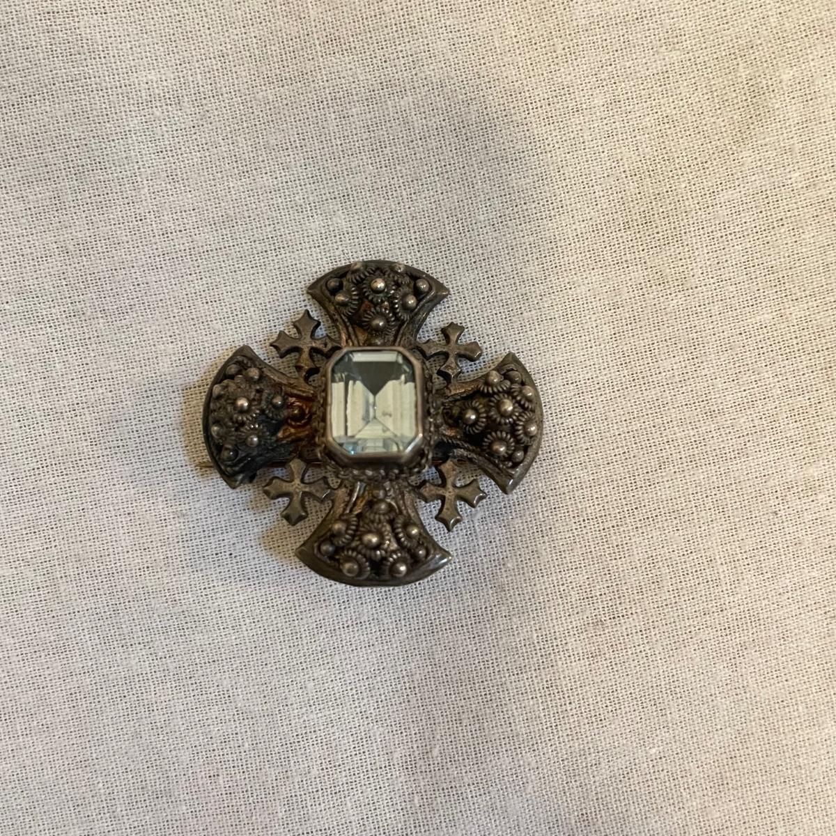 Two Jerusalem cross brooches, one with illegible silver marking and the larger one being stamped Silver 935. Also included is a petite unmarked silver and clear gemmed pendant plus a long pin with a rhinestone and onyx colored centerpiece.